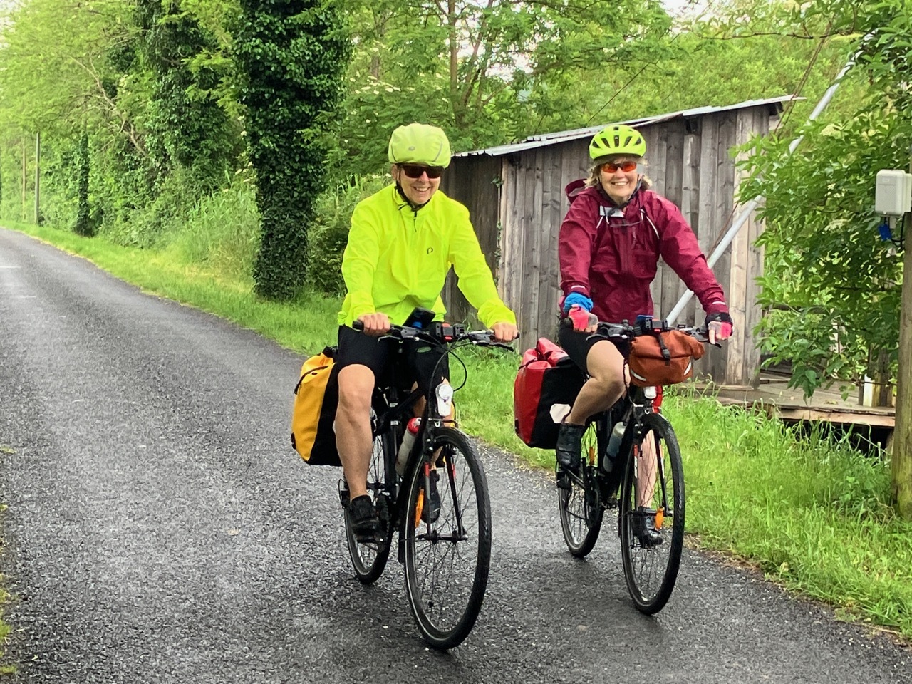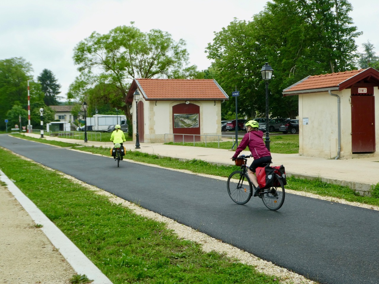We happened on a small brocante just outside Lignan-de-Bordeaux, a must-stop for Leah and Susie. Even I browsed through some of the shirts of display, but we left only with a ceramic creamer for Susie. In no real hurry, we extended the stop with a coffee from the trailside bistrot, chatting a bit with some touring cyclists headed for Toulouse. A light rain started, so we donned our rain jackets and headed up the trail. It wasn’t long before we stopped to escape the rain at the old train depot in La Sauve where we noshed on our provisions. The rain had stopped by the time we left, but intermittent light showers would continue until we reached Saint-Émilion.