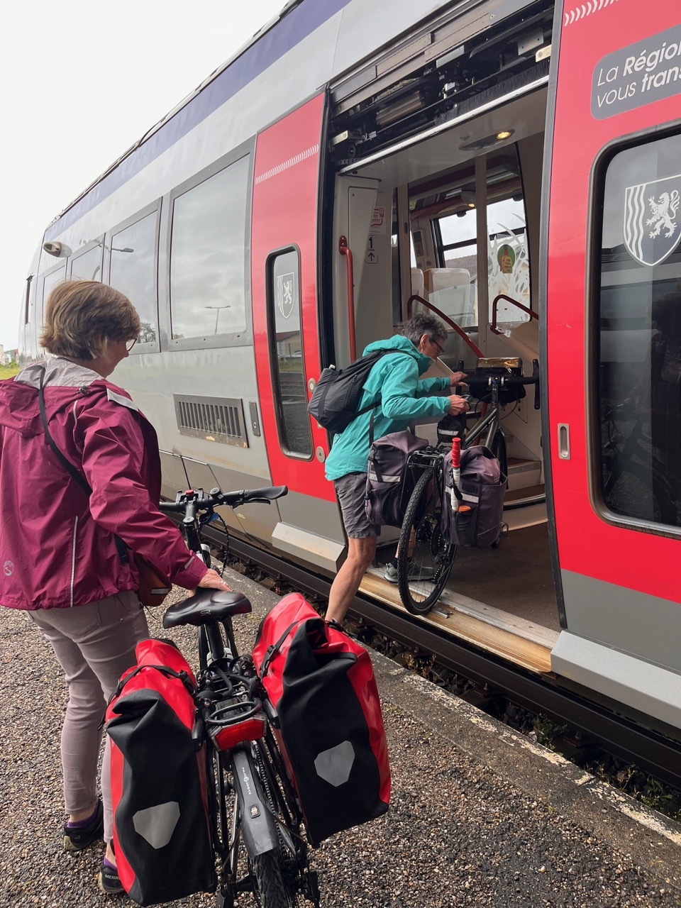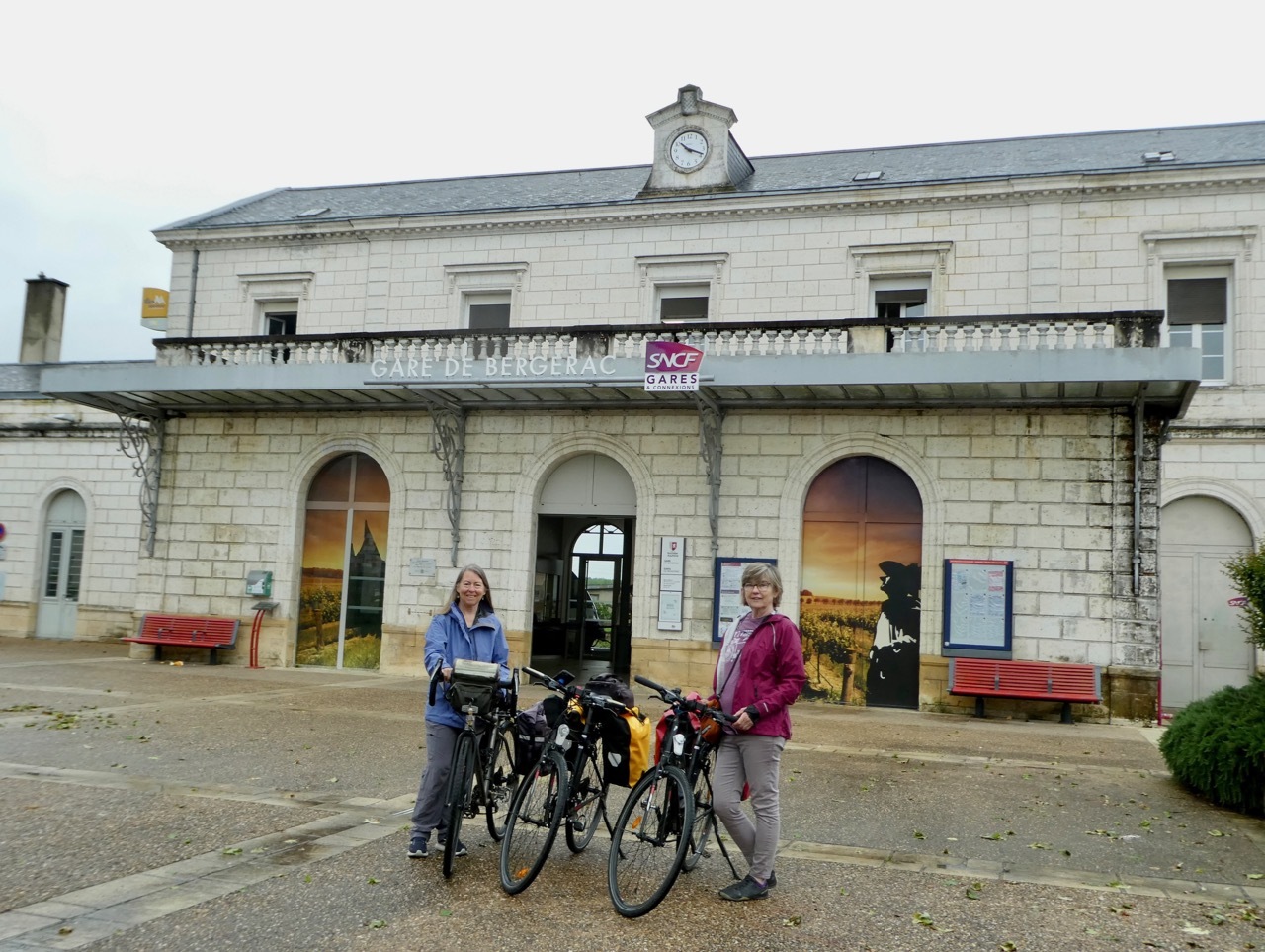 Now, back to our ride to Les Eyzies - the forecast was 99% chance of rain. It seemed we would not avoid a soaking and so we elected to take a train to Les Eyzies. Actually two trains as there was a connection in La Buisson. It was Leah’s inaugural train ride with a bike but all went smoothly and we arrived in Les Eyzies just before noon, greeted by a steady rainfall. We briefly sought shelter outside a cheese shop where we enjoyed free samples of regional sausages while waiting for the rain to subside. I had arranged for an early check in at our lodging above a main-street restaurant and although the restaurant was closed the door was opened by a nice woman who led us to the hotel entrance located off a courtyard behind the restaurant.