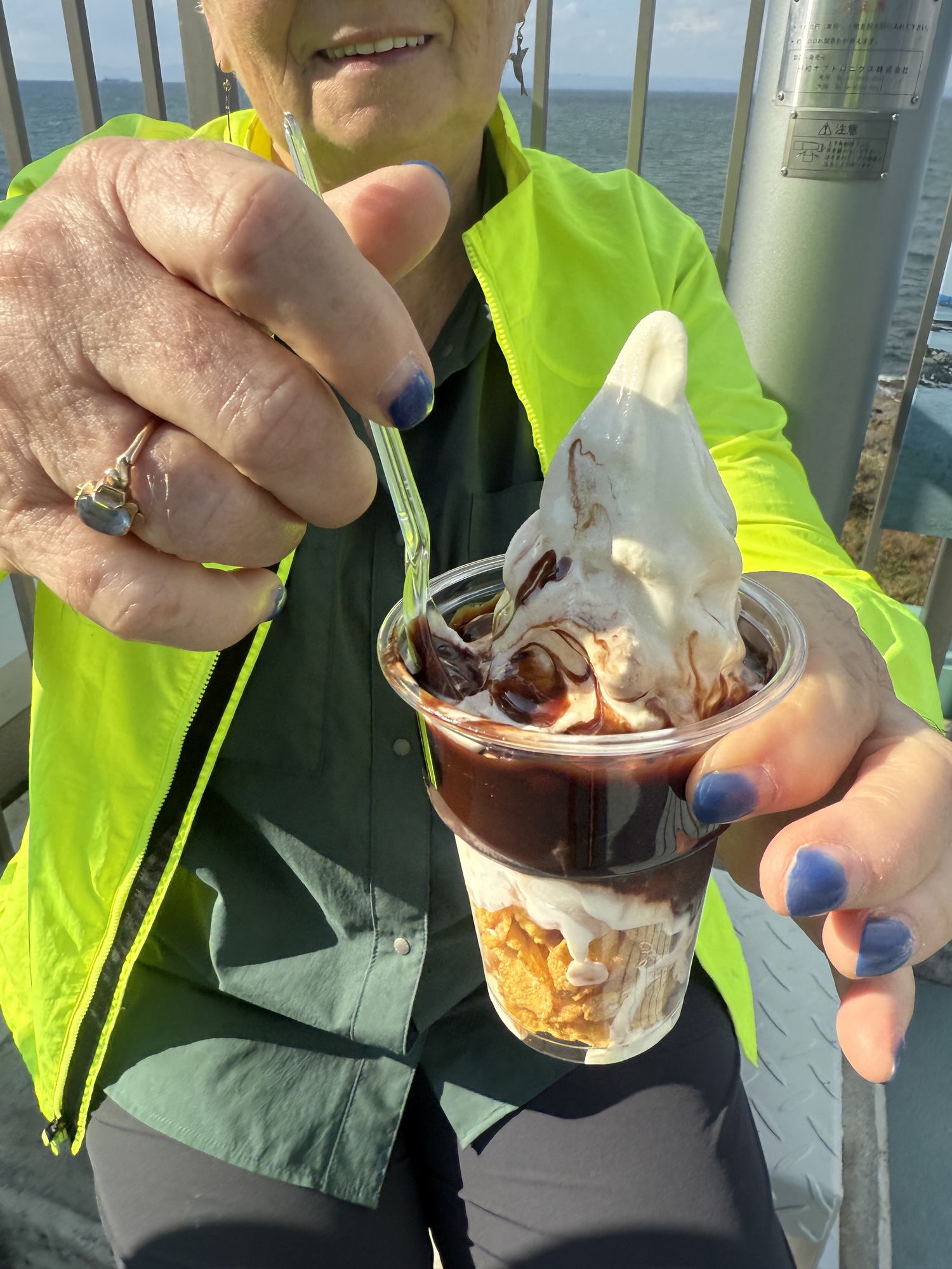 Despite the ocean breezes, it is a hot day. This parfait at the Konbini hit the spot. We weren’t too sure about the corn flakes at the bottom, but it works.