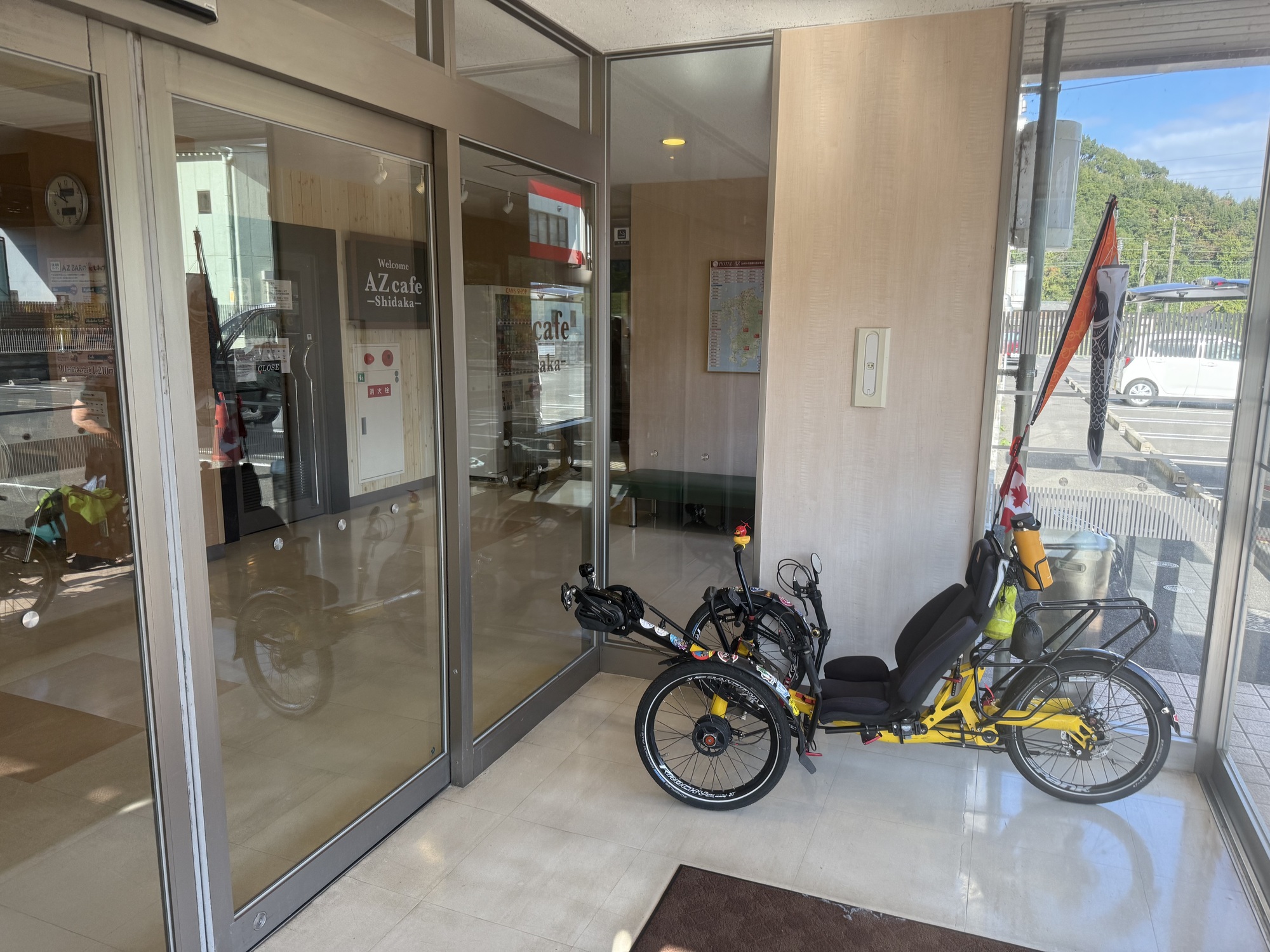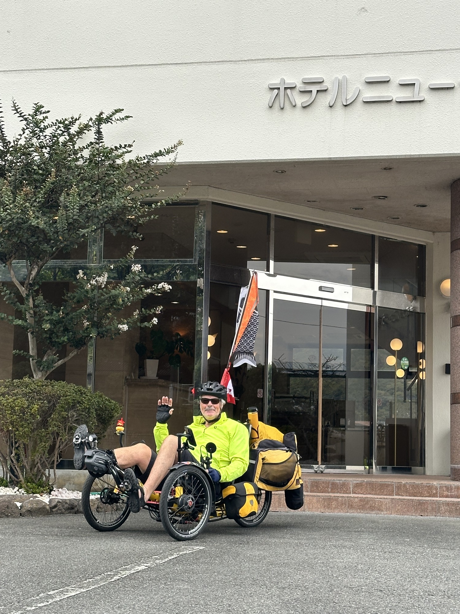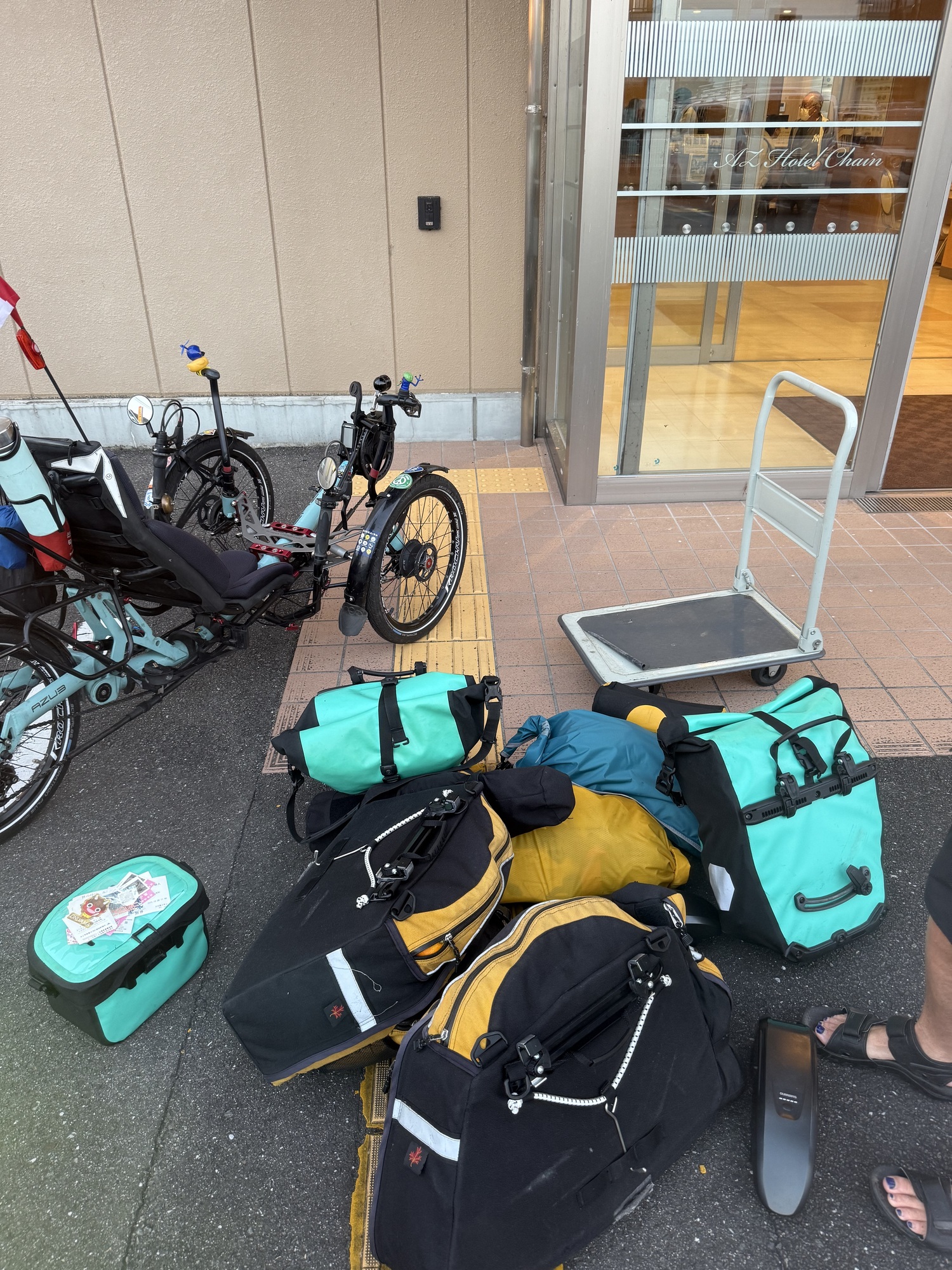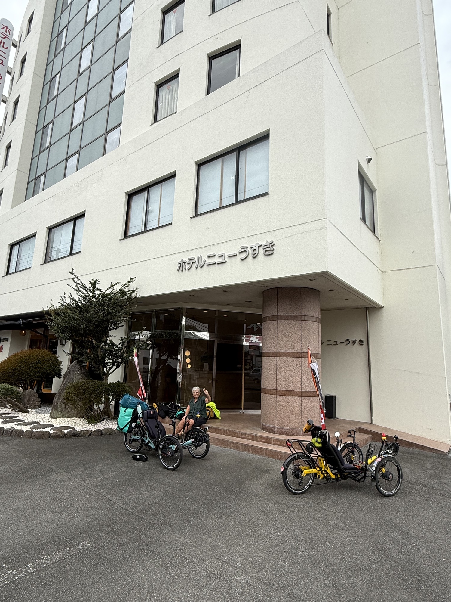 Last night’s hotel was good. It did the job. Typically, the price of this hotel is significantly less, but as yesterday was a National Holiday, we understood the challenge and chose the most reasonable place we could find . The price of our room was at least triple its value. On a good note, the woman who checked us in quickly offered to have us store our trikes in the lobby and we appreciated the welcome we received. Normally, hotel prices in Japan are consistently reasonable.
