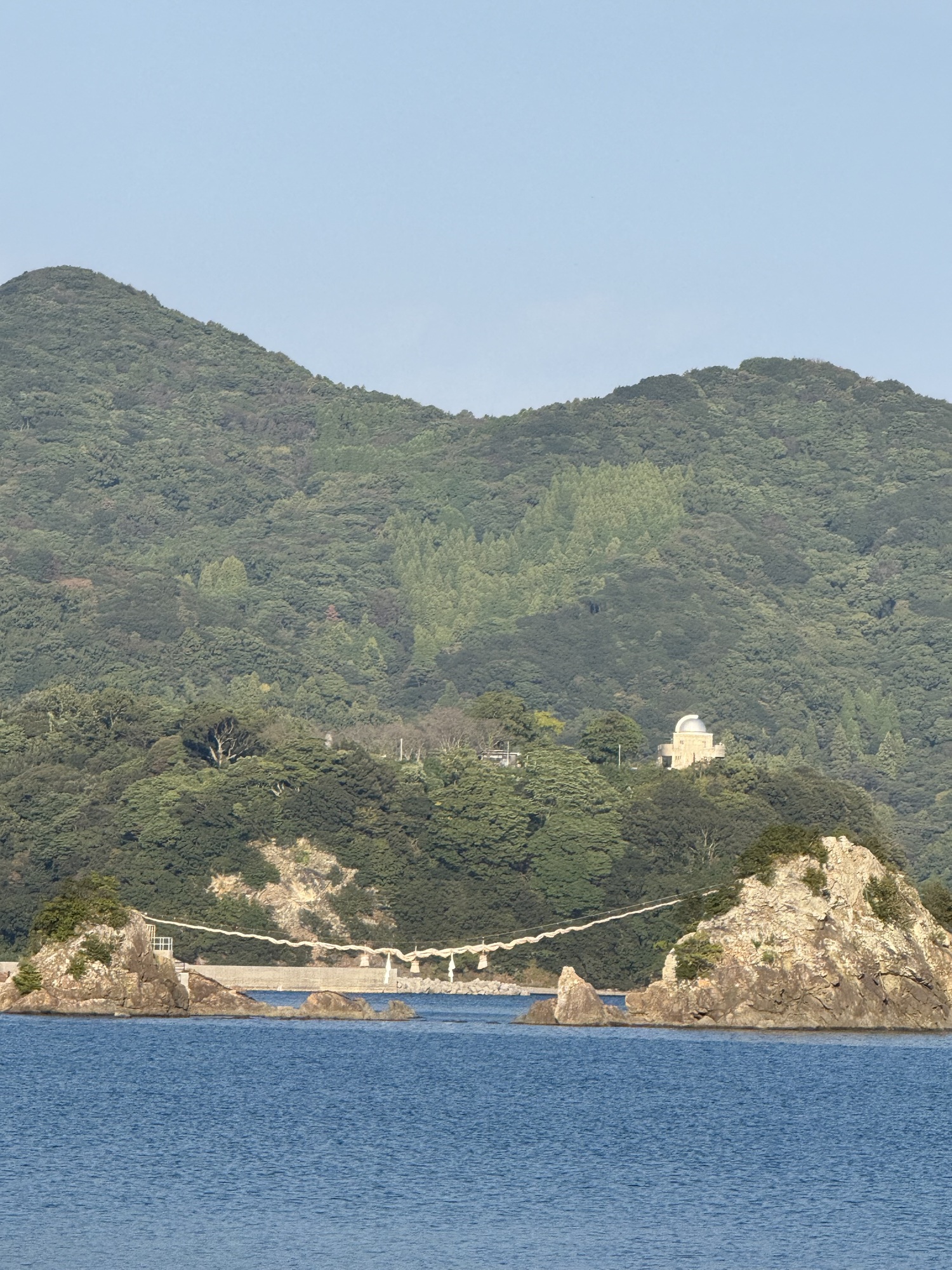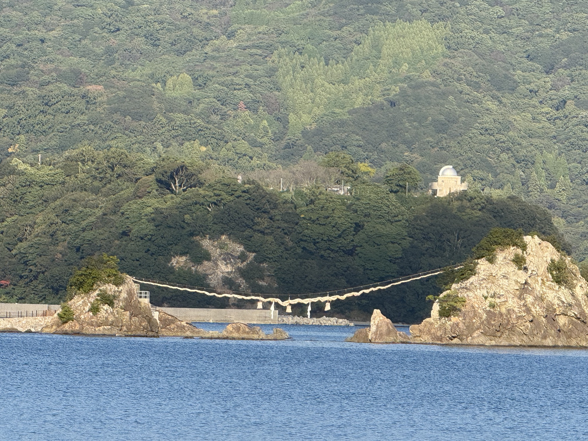 These rocks connected by rope signify a happy marriage. They are called Couple Rocks and the sacred rope is the longest used on in Japan. The rope weighs 2 tons and is 65 m in length. This one is called Bungo Futamigaura.