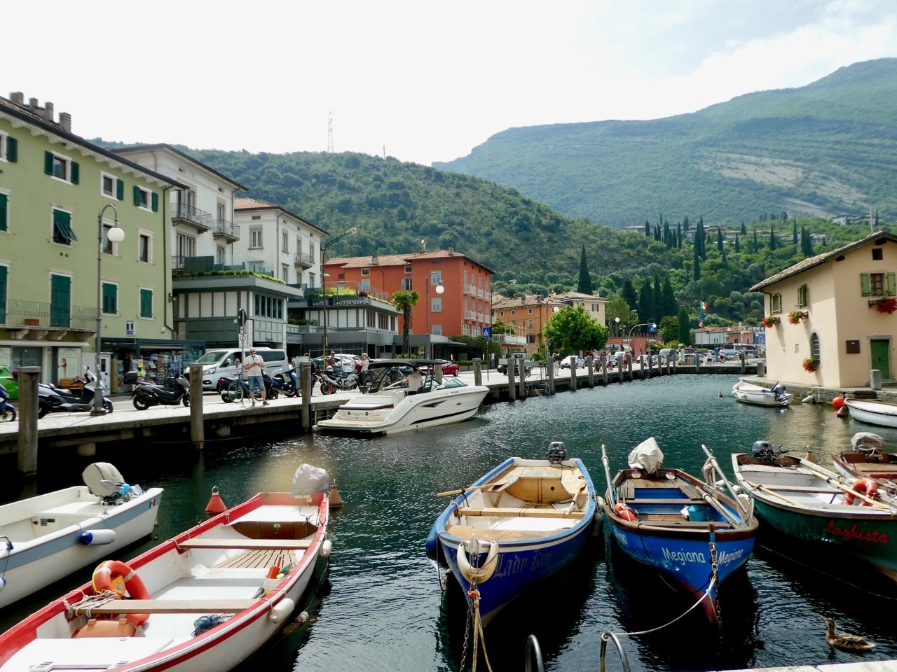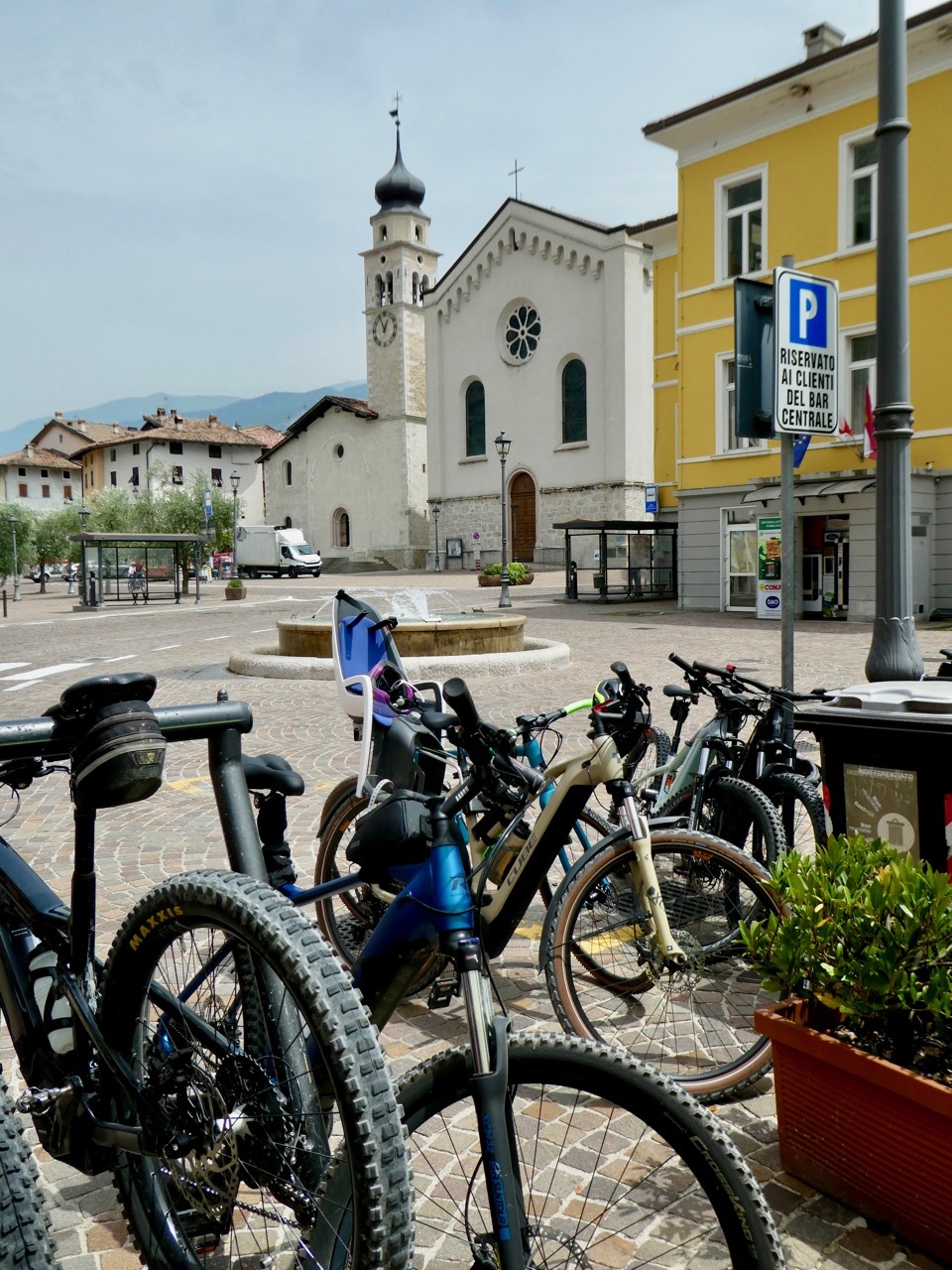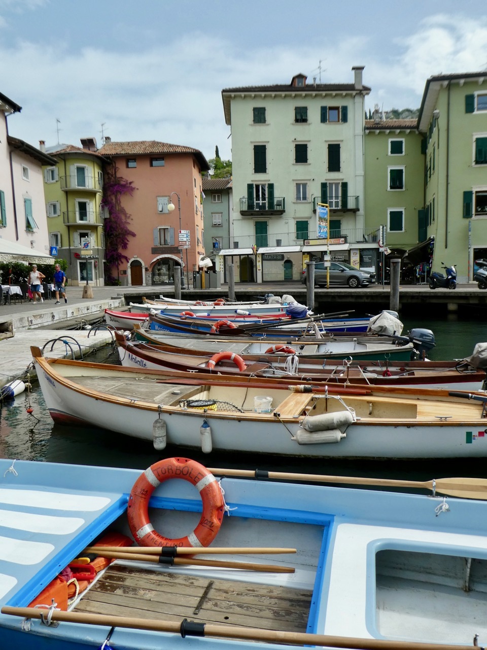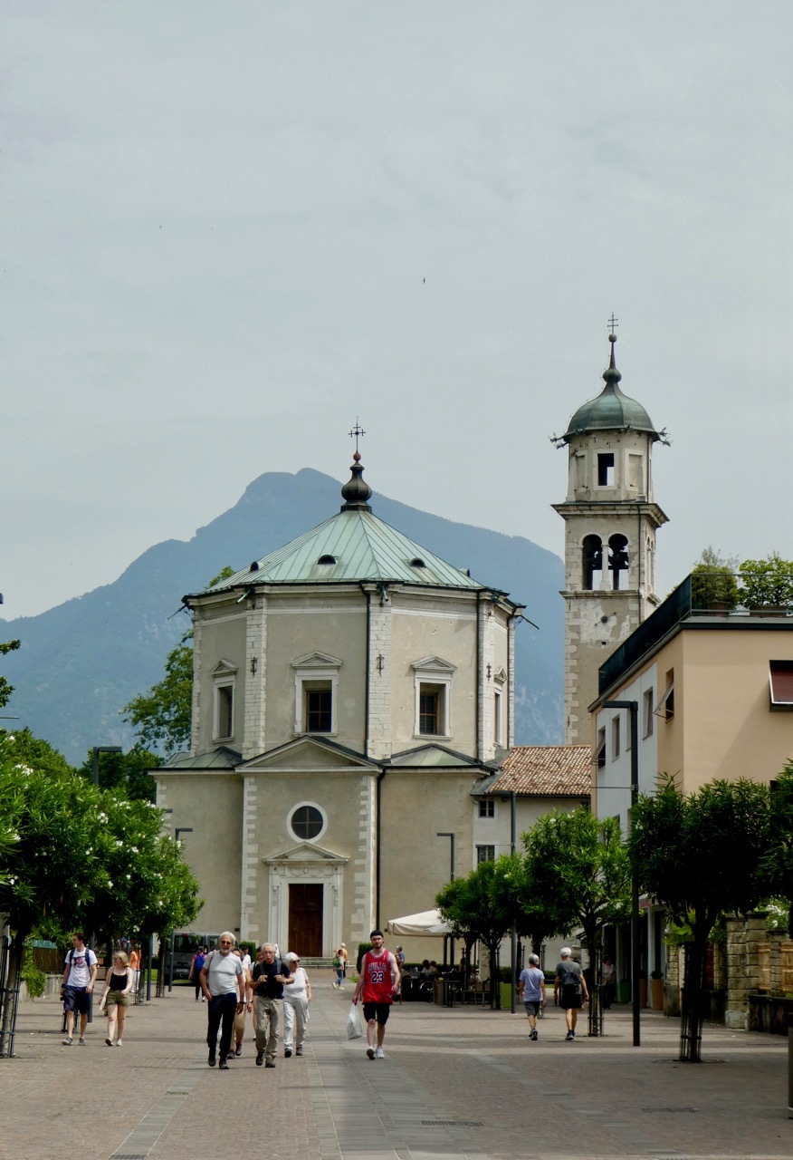 I retrieved Vivien George from the locked cage where she had spent the night surrounded by eBikes. We sped down the hill, a straightaway that I took more cautiously than most though I did pass a few souls more timid than I. The road steepened at the bottom, curved a bit as the surface turned to cobbles and I was suddenly disgorged into the chaos of a summer tourist town teeming with bikes, cars, and pedestrians, each vying for their own spot of turf. I crossed over to a plaza along quai to catch my breath and then set off in the wrong direction around the lake. After a bit of self-correction I found the bike path to Riva – it was just a matter of following the slew of bikes headed that way.