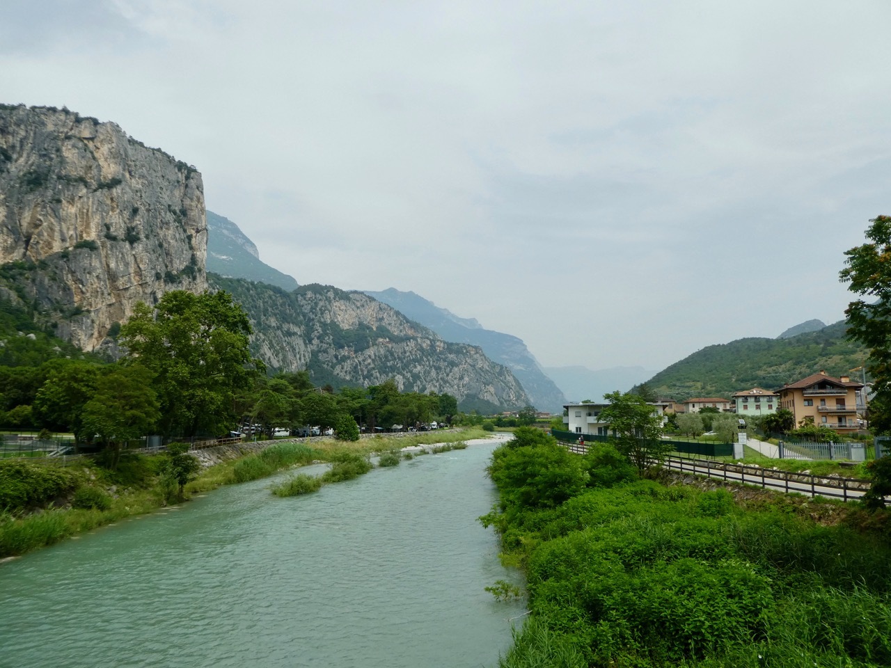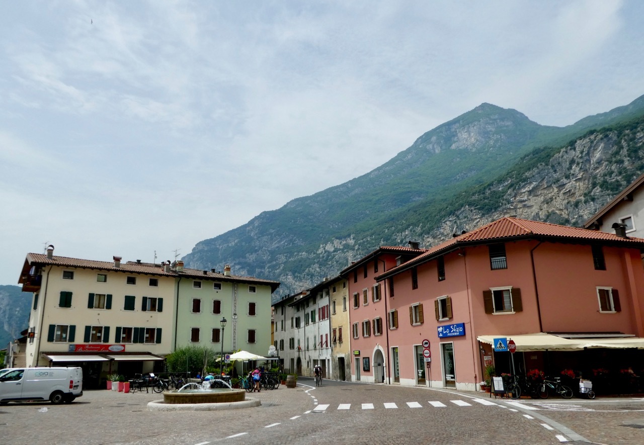 The bike path to Arco followed along busy commercial road and once in town I found a nice park and a bench where I stopped to get a better orientation of my surroundings. I headed on foot toward some nice-looking buildings and then followed other cyclists to a wonderful little square with some sort of Bici Café, as suggested by the filled bike racks and patrons in chamois. I found a spot for Vivien George and took a table, indulging in a Fanta and a piece of strudel for my elevenses break. It wasn’t hard to decide where to go next – I just followed the near constant stream of cyclists – some single riders, some in pairs, and some in larger groups with a guide. I passed through though a lively pedestrian/bike zone and reached the Sarca River where I turned north to Dro.