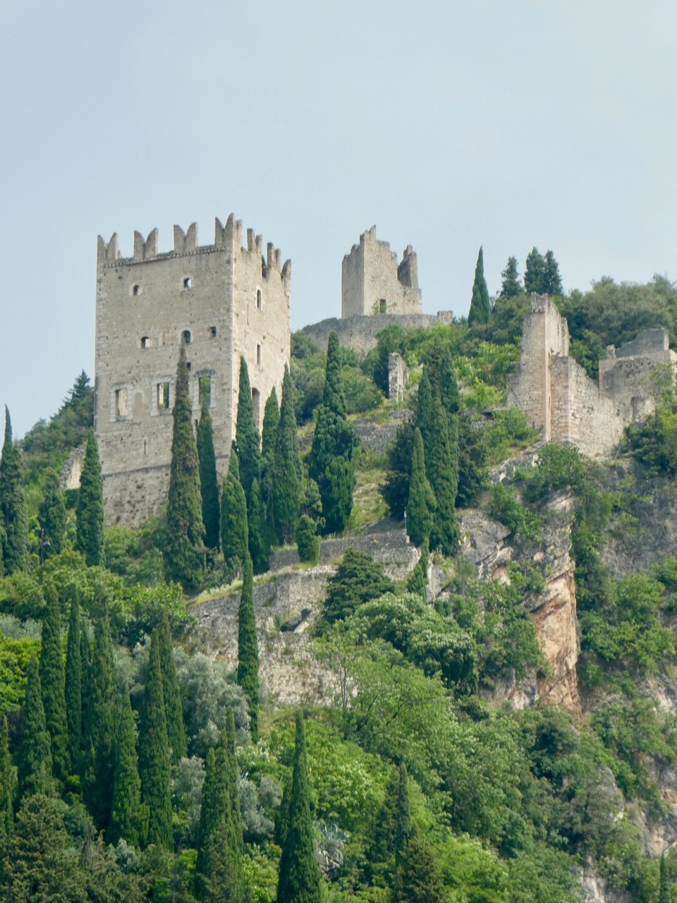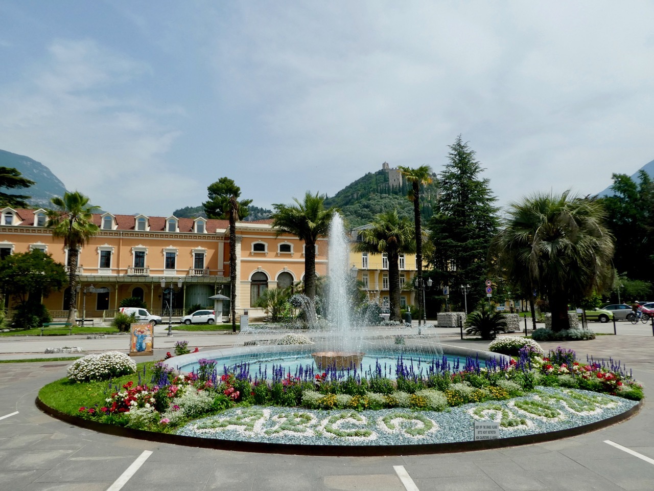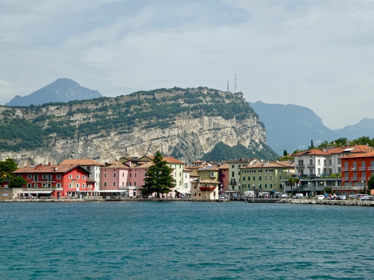 The early morning sky showed a promise of blue, but the day turned out to be another hazy day with temperatures uncomfortably warm. No worries, I had a free day of unloaded cycling to explore a wonderful area of northern Italy. I enjoyed breakfast on the terrace overlooking the lake and surrounding mountains, feasting on one of the most lavish spreads I’d seen – they even offered omelets made to order if you so desired. I stuck with my usual muesli and yogurt, supplemented with lots of fresh fruit and date bread. Then I was ready to head down the hill and see what the hub-bub about Riva del Garda was all about.