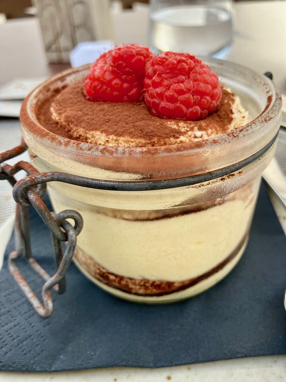 I eventually tore myself away from the wind-surfers and tackled the big climb back to the hotel. There was one short rest stop after the steepest section then a long grind up, all the while glad to not be carrying my panniers. Thanks again to the Classens. I retreated to my room for some relaxation and walked across the street for an early dinner. Pasta tonight, and homemade tiramisu with raspberries on top. The joys of cycling and dining in Italy.