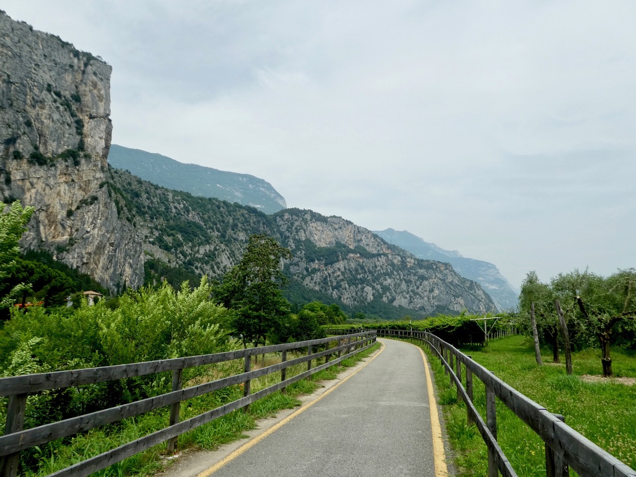 Travel along the bike path was slow, dodging walkers, dogs, strollers and cycling newbies. Throngs of people were out enjoying a wide variety of water sports and the beachfront was filled with swimmers, sailors and windsurfers. I took it all in, not in a hurry and realizing that late June may not be the best time to visit the popular towns along Lake Garda. I found my way into the pedestrian area of Riva del Garda but for some reason chose not to linger, instead continuing north to Arco.
