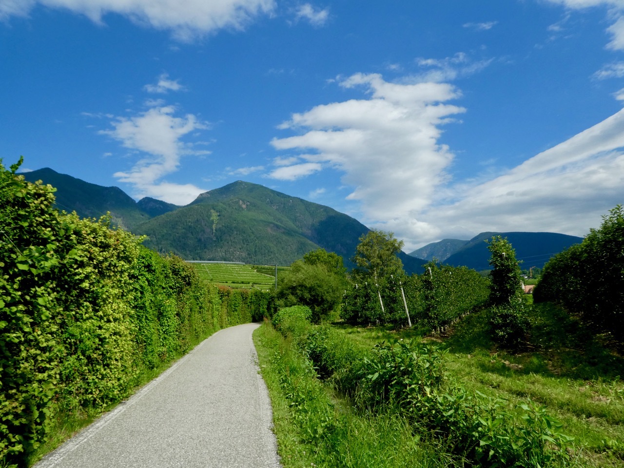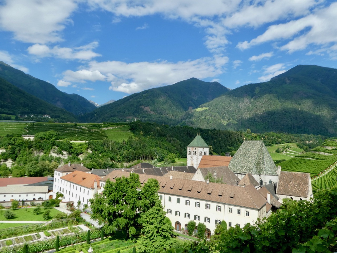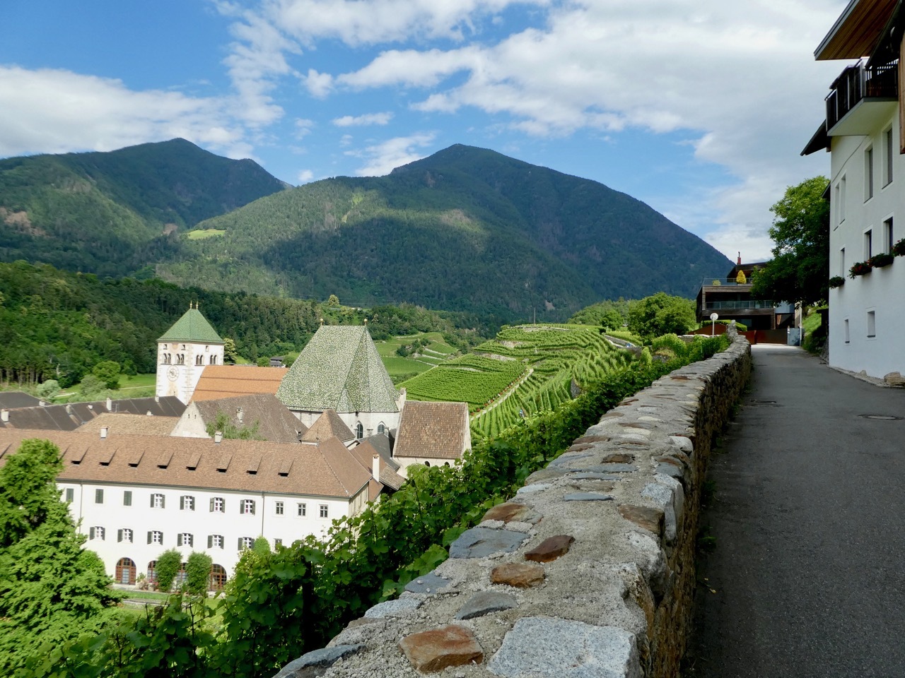 My departure from Bressanone began under sunny skies along the Eisack/Isarco river and confirmed my initial assessment that the city warrants another visit. The first few miles continued along the Isarco Cycle Route before climbing up through Neustift and past the magnificent Novacella Abbey where I met Anke and Rainer, a German couple on week-long loop in South Tyrol. We had a lovely chat covering the typical subjects and praising the wonderful Italian biking infrastructure. But it was less than a mile later that the route left pavement and put me on a dirt track, muddy and slippery from the recent rains. I wisely decided ‘twas better to hike than bike and after a very short stretch the trail made a 180° turn and returned safely to pavement.