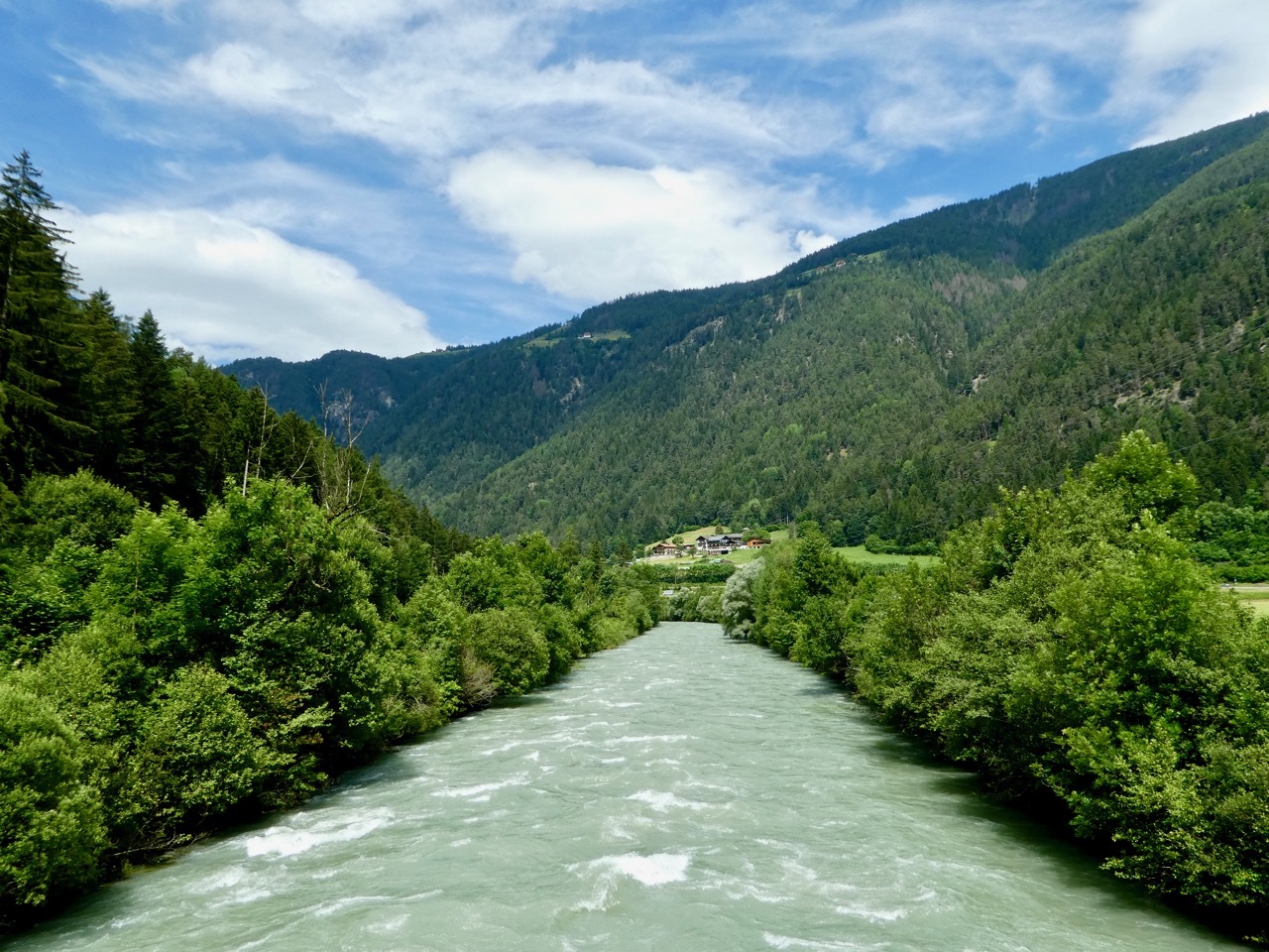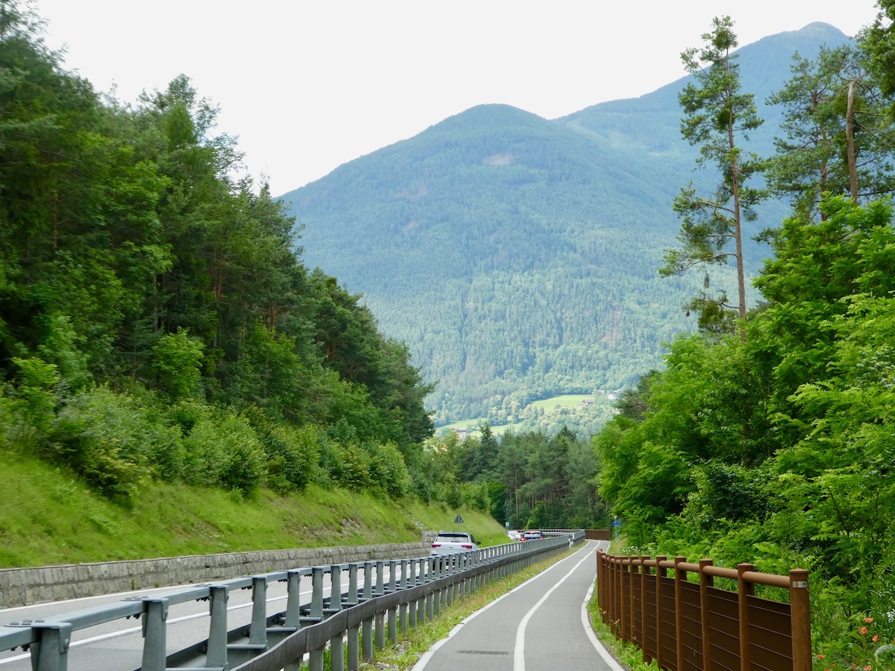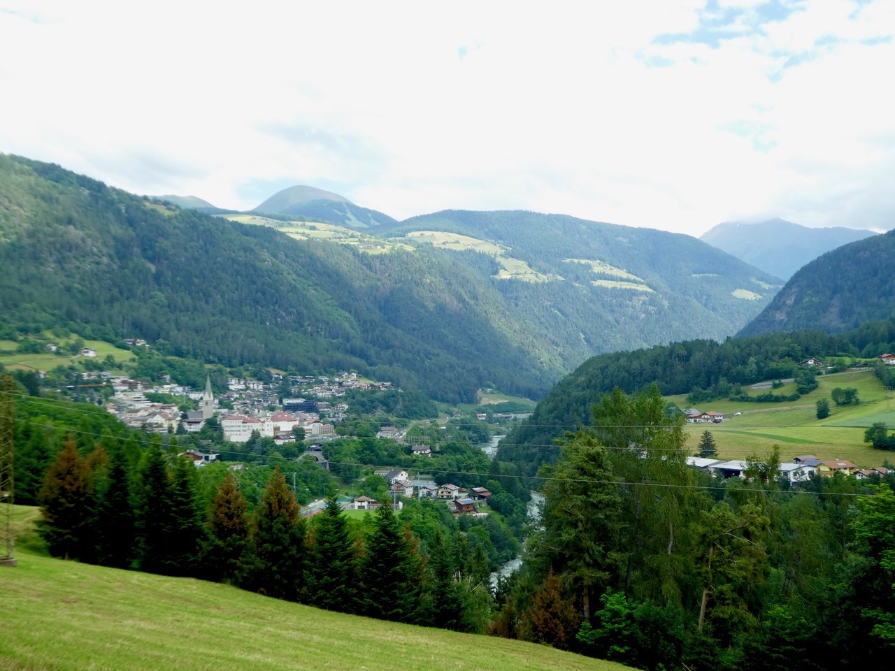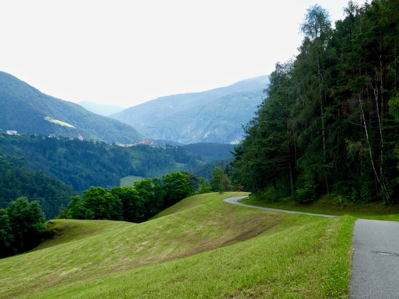 The climb up from Bressanone continued through Sciaves/Schabs and then wound along high farm lanes before dropping steeply to the Rienz River in Mühlbach, a lively bike-friendly town. I stopped at a bakery for coffee and a pastry and then picked up the Pusteral Cycle Path that follows the Reinz River through the Puster Valley. It was a fantastic route – rising and falling as it wound through forests and crop land on dedicated paths and small lanes devoid of traffic. The varied landscape and sometimes challenging terrain were a delight, even when a particularly steep incline forced me off the bike. There were a fair number of other cyclists on the route, which is part of the popular long distance Munich to Venice cycle route. Most memorable were a group of four women sporting "Cycle Now Wine Later" jerseys – they had a few days off and were going as far as time and their legs would take them.