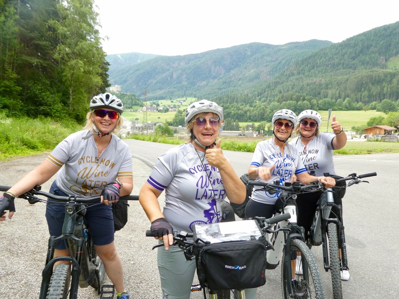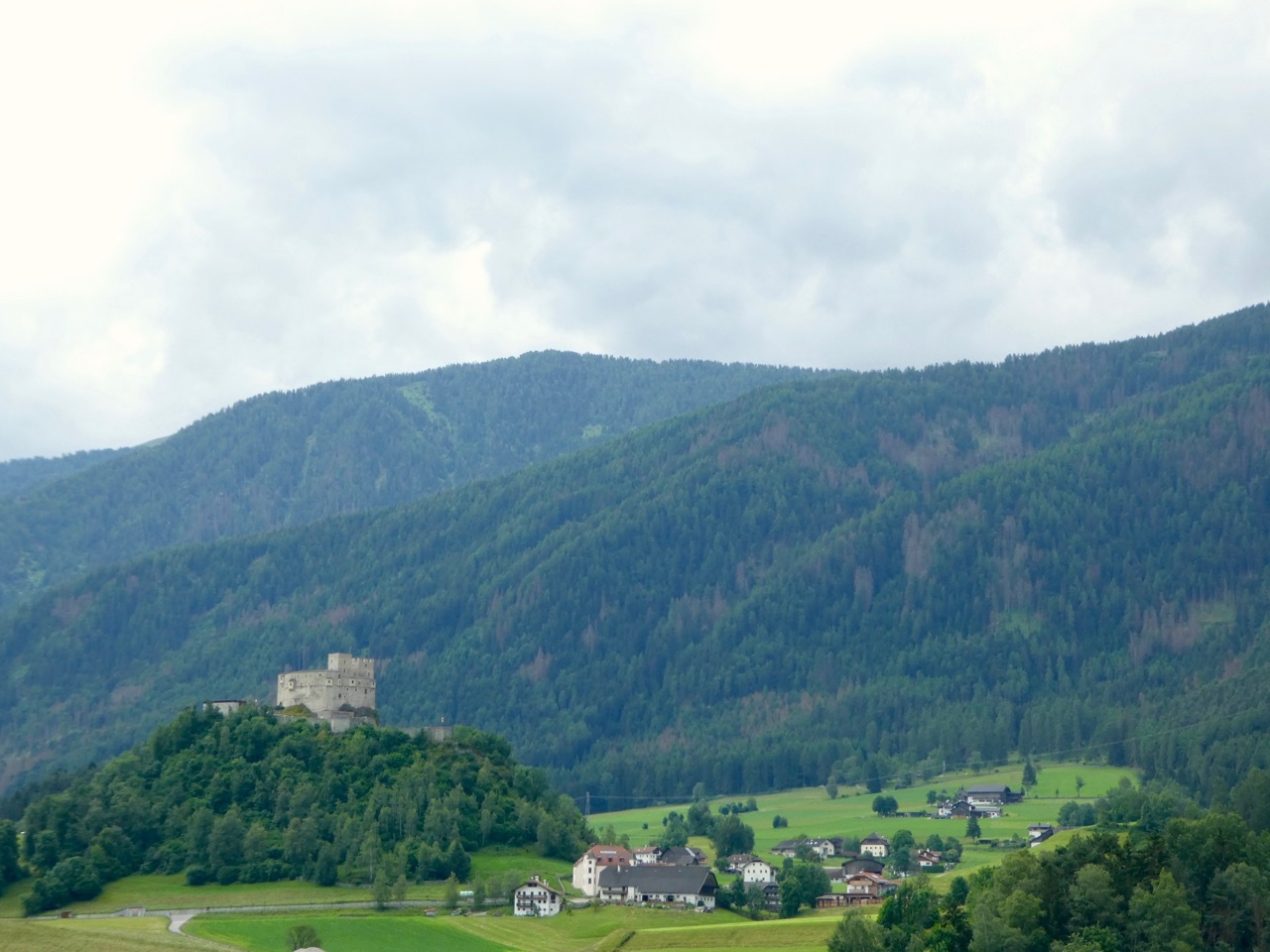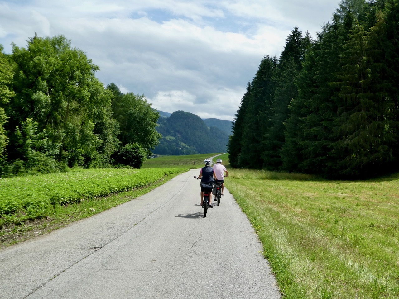 The climb up from Bressanone continued through Sciaves/Schabs and then wound along high farm lanes before dropping steeply to the Rienz River in Mühlbach, a lively bike-friendly town. I stopped at a bakery for coffee and a pastry and then picked up the Pusteral Cycle Path that follows the Reinz River through the Puster Valley. It was a fantastic route – rising and falling as it wound through forests and crop land on dedicated paths and small lanes devoid of traffic. The varied landscape and sometimes challenging terrain were a delight, even when a particularly steep incline forced me off the bike. There were a fair number of other cyclists on the route, which is part of the popular long distance Munich to Venice cycle route. Most memorable were a group of four women sporting "Cycle Now Wine Later" jerseys – they had a few days off and were going as far as time and their legs would take them.
