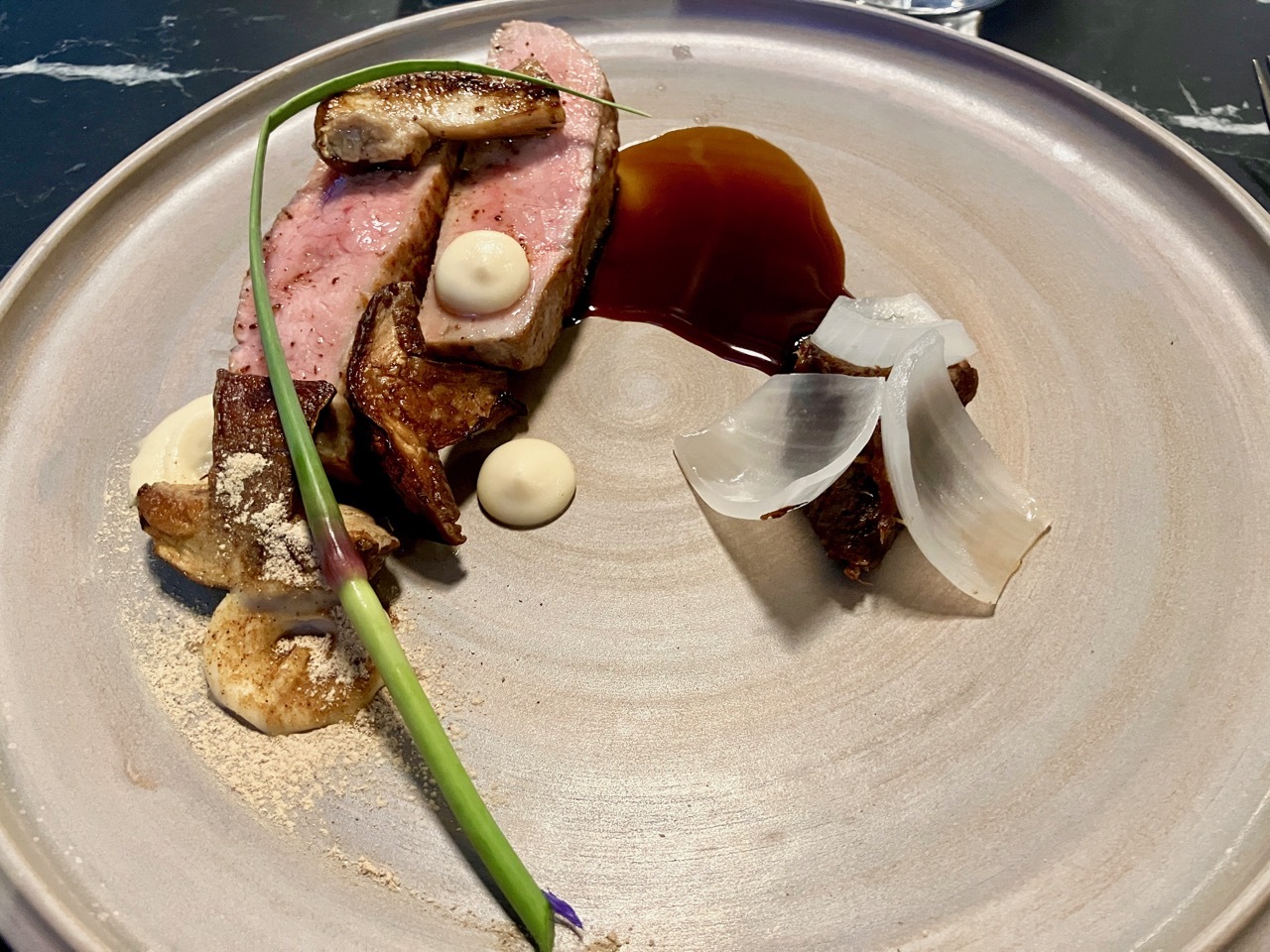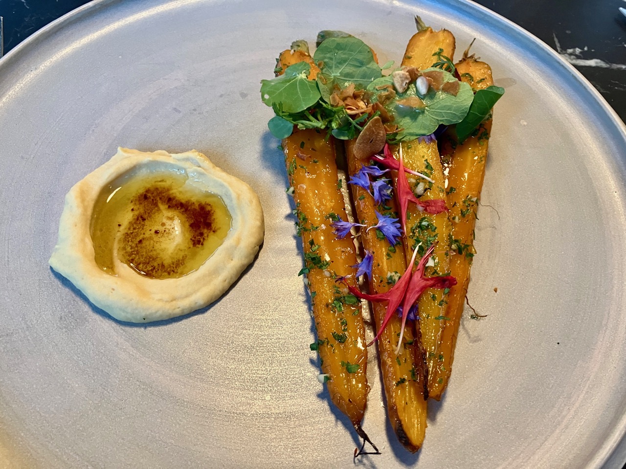 At the end of the day, I decided to forego my plans for lunch tomorrow at AlpINN – the weather reports were sketchy and I was a bit leery of taking on terrain with a full stomach. But I did not deprive myself of a wonderful meal, dining instead at a new establishment in this town full of exceptional restaurants. I scanned their menu, intrigued and tempted by a number of offerings and choosing to splurge on a four-course menu. I was a bit taken aback to learn that each course was the chef’s choice, not mine – but very pleased that we both chose the glazed carrots with humus as the starter. As noted above, they were the best carrots I’d ever eaten, and the rest of the meal did not disappoint. It was a meal that captured the day, full of surprises and delights.