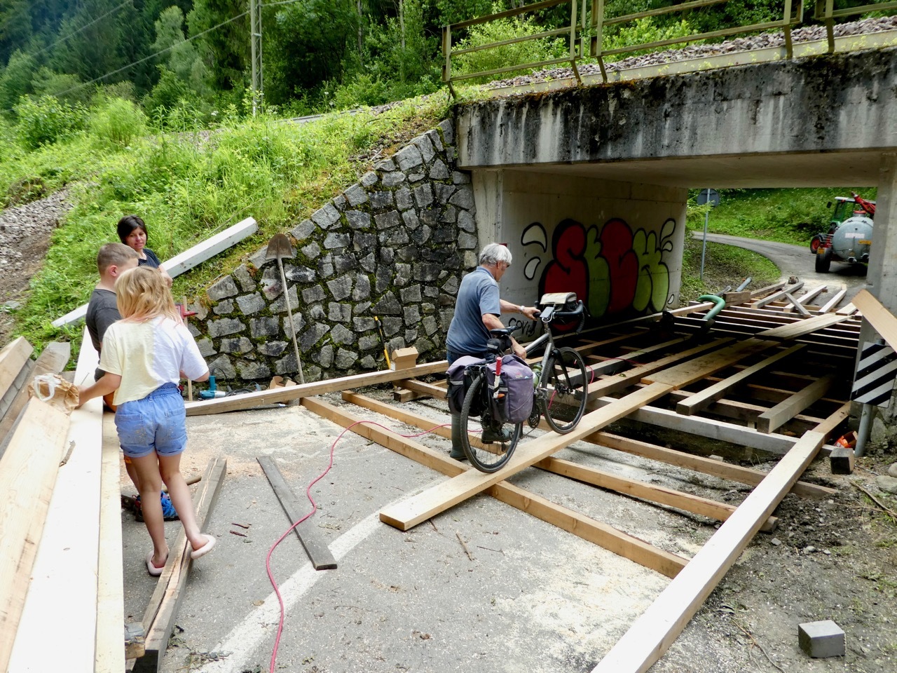 This family of four was building a small wooden bridge along the route and dad insisted on carrying Vivien George across the planks, a gesture for which I was most grateful