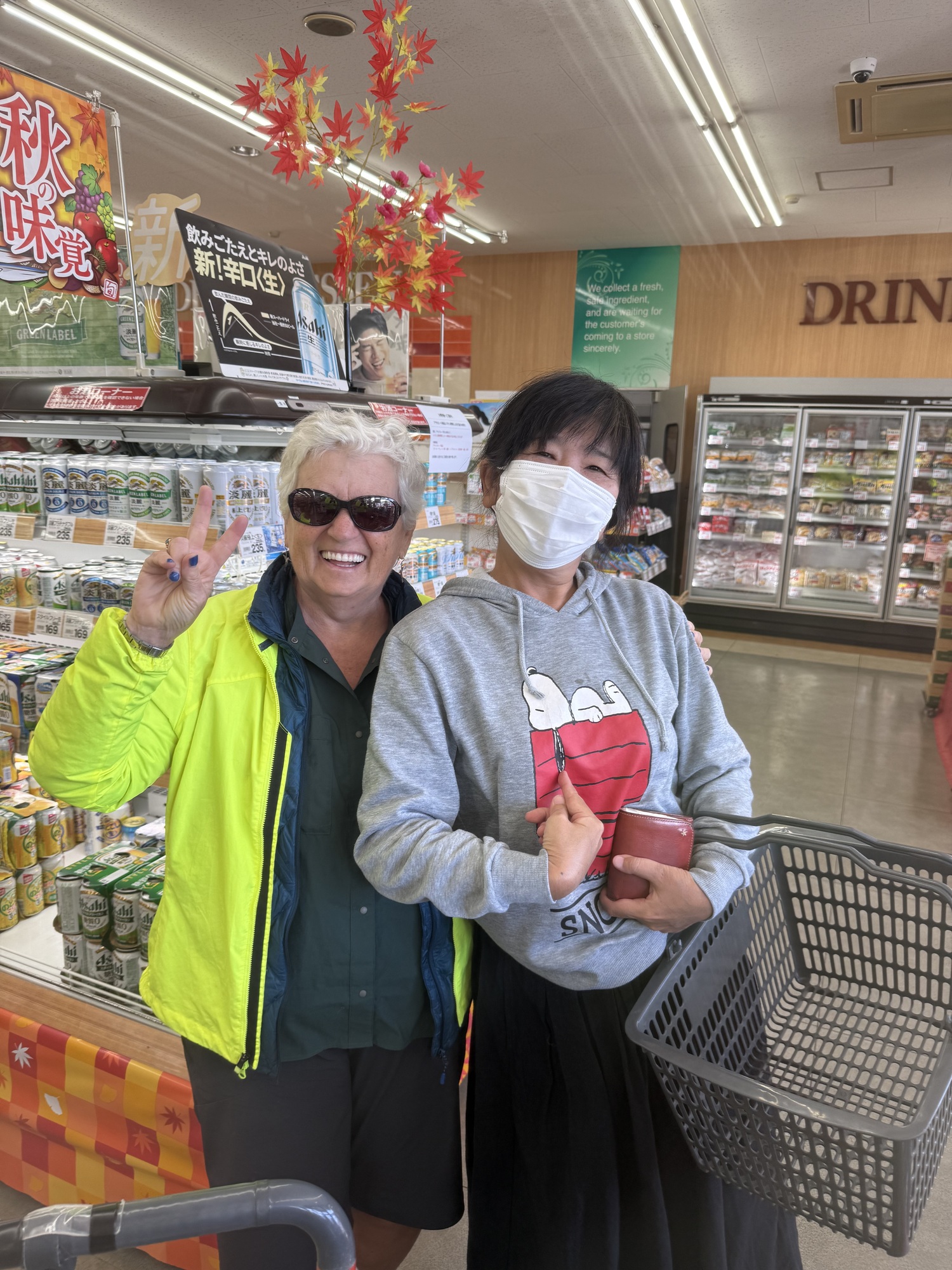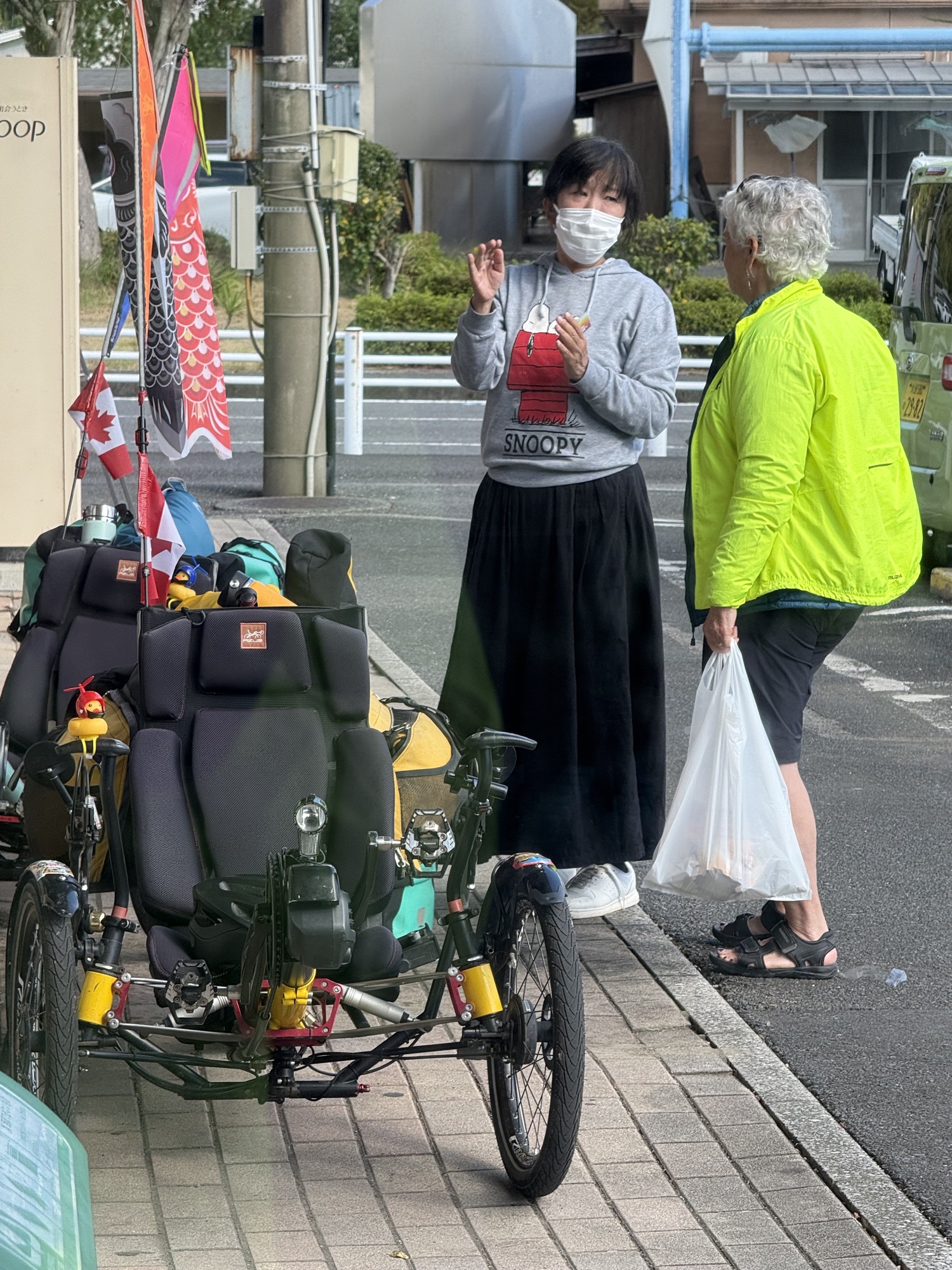 Shopping for lunch at a grocery store, this woman came up to us and asked if the trikes were ours. We enjoyed chatting with her. We knew Leslie would like the Snoopy sweatshirt.