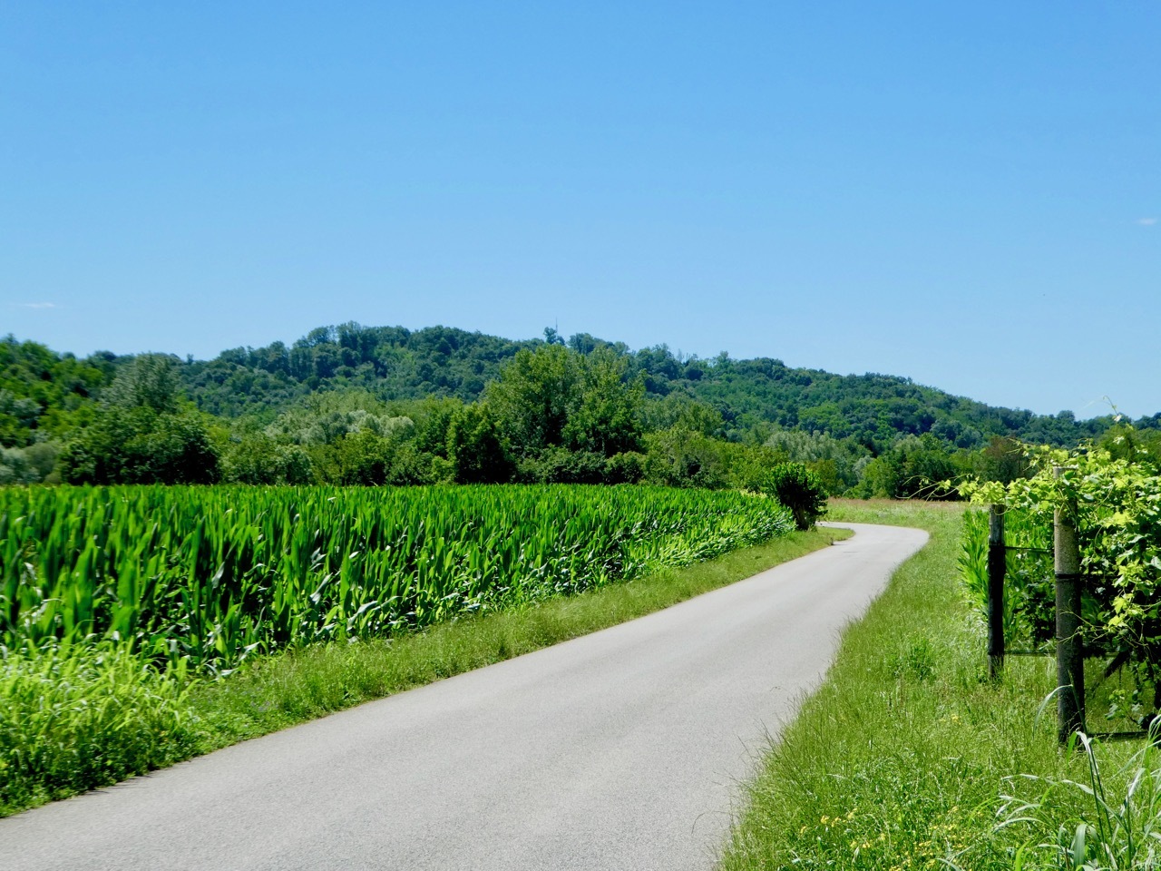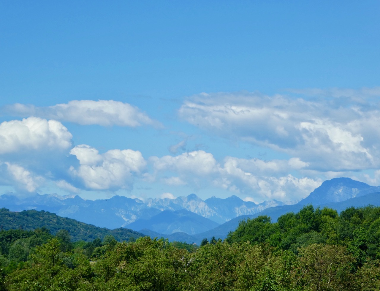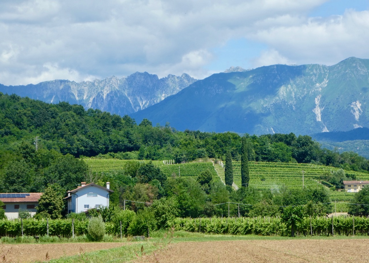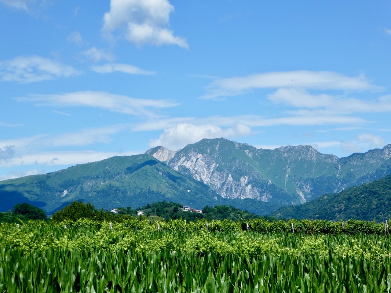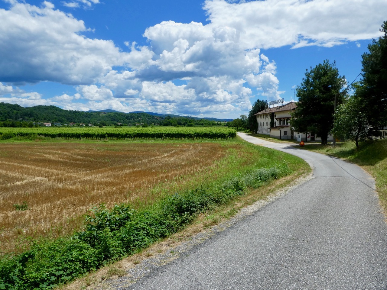 I left the provincial highway at Nimis, turning onto a small farm road that zig-zagged through corn “as high as an elephant’s eye.” The clear sky gave me striking views of the mountains, both the rocky peaks of the higher alps of Slovenia as well as the greener slopes along western edge of the Julian range. The route drifted west into the flat valley, taking me through croplands and along a short stretch of gravel on the outskirts of Cividale.