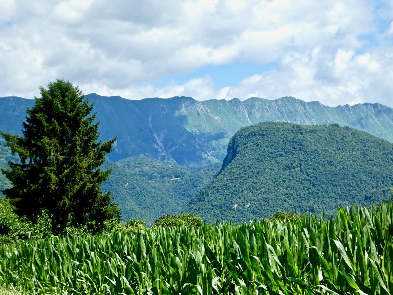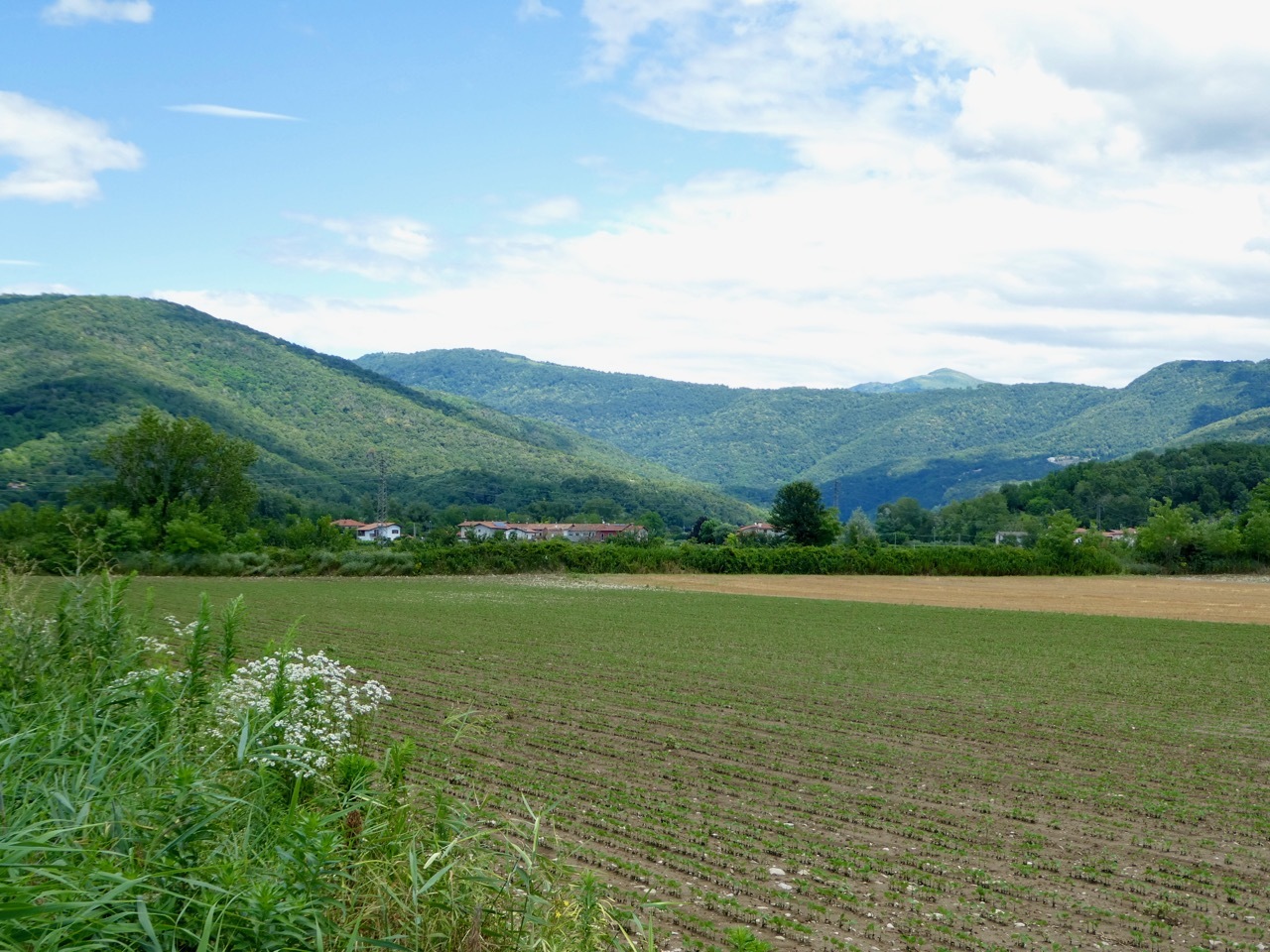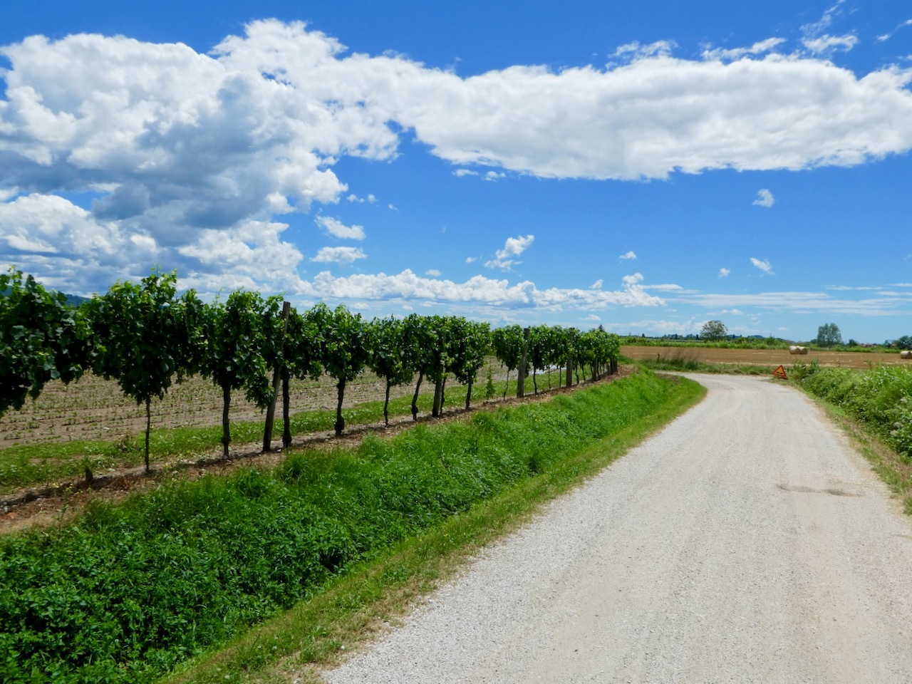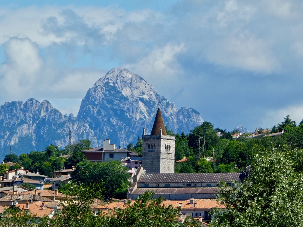 I left the provincial highway at Nimis, turning onto a small farm road that zig-zagged through corn “as high as an elephant’s eye.” The clear sky gave me striking views of the mountains, both the rocky peaks of the higher alps of Slovenia as well as the greener slopes along western edge of the Julian range. The route drifted west into the flat valley, taking me through croplands and along a short stretch of gravel on the outskirts of Cividale.