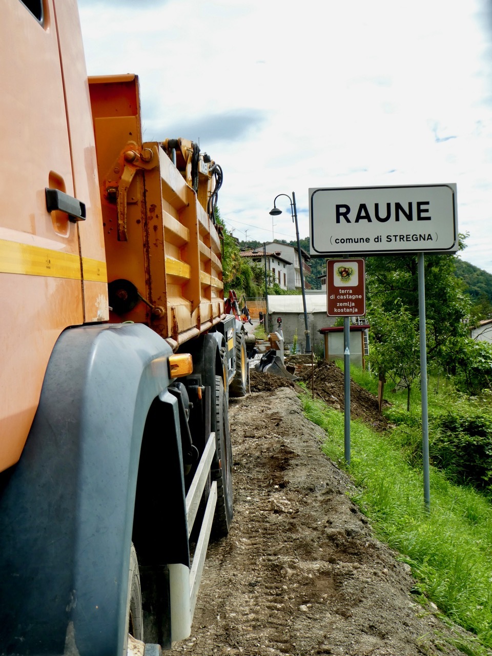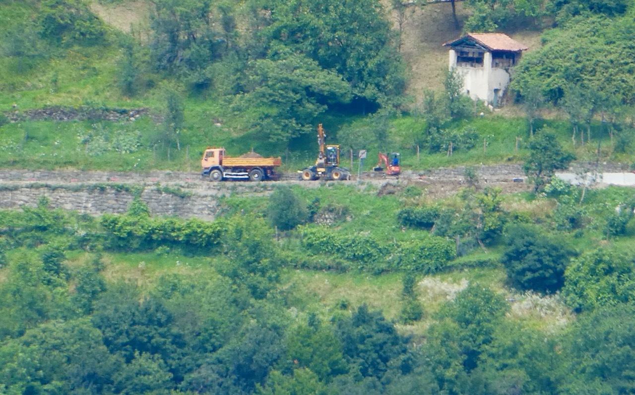 The warning turned out to be real – blocked by a bulldozer and heavy equipment in the process of tearing up the road into Raune. I motioned to a young man dressed in orange if I could pass by, and followed him as he walked a narrow strip between the bulldozer and the hillside. I started to follow, but the bulldozer bucket was swinging and the risk of sliding down the hillside too great. While I hesitated, the orange clad boy moved on, with no apparent intention of helping me.