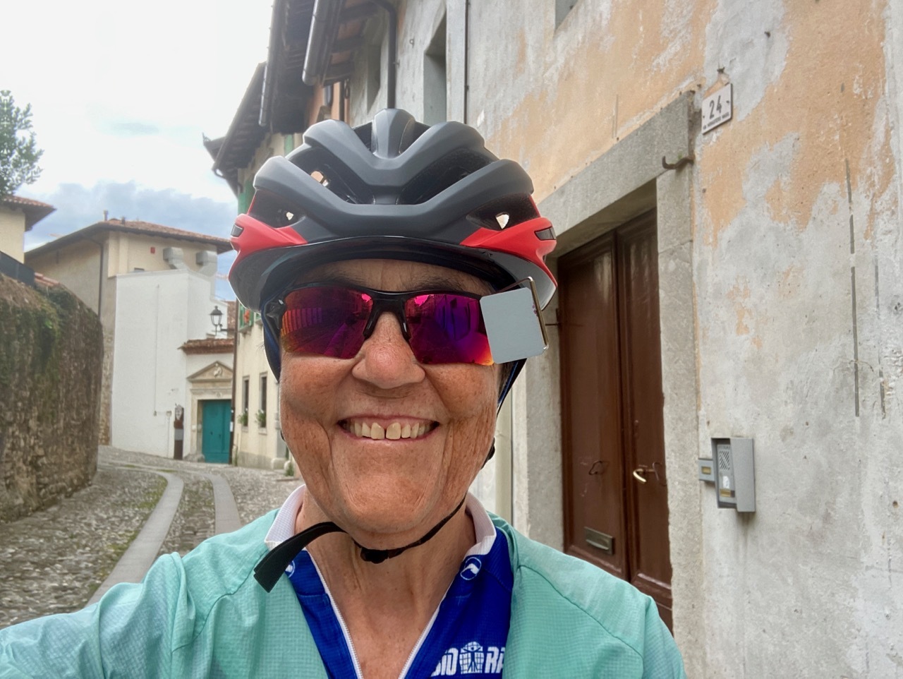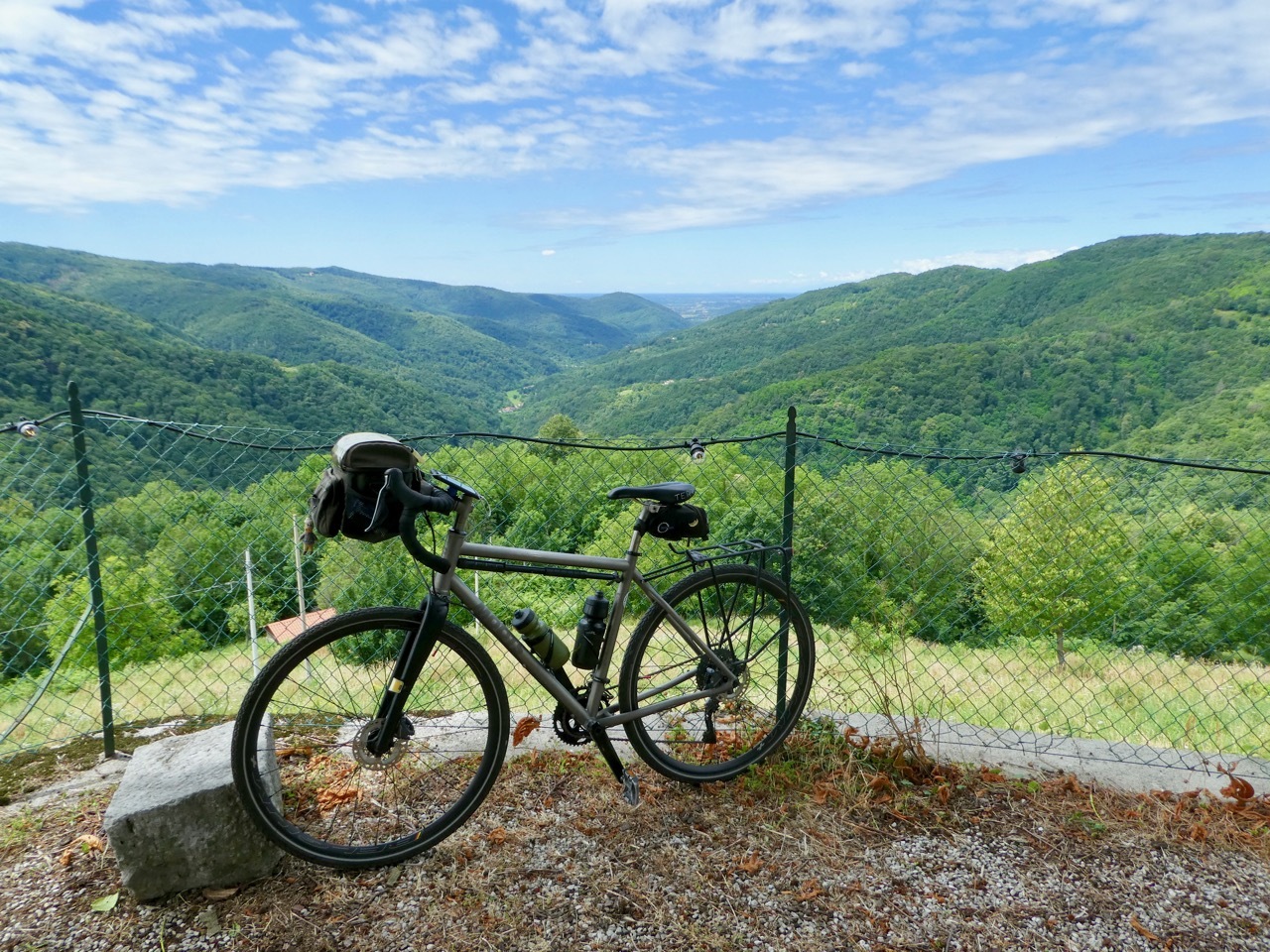 I finally reached Castelmonte – a cluster of buildings sitting on a small hill surrounded by a very large and mostly empty parking lot. There was clearly more to Castelmonte than the castle ruins I had imagined. I rode up the hill to the base of the complex where I did see some castle ruins as well as views across the surrounding foothills, none of which compared with those I’d seen earlier on my ride. An archway beyond the ruins led into the complex of buildings, which I mistakenly assumed were commercial tourist traps. Not interested, I rode back down the hill, continuing through the parking lot to a very steep and serpentine downhill that led me back to Cividale.