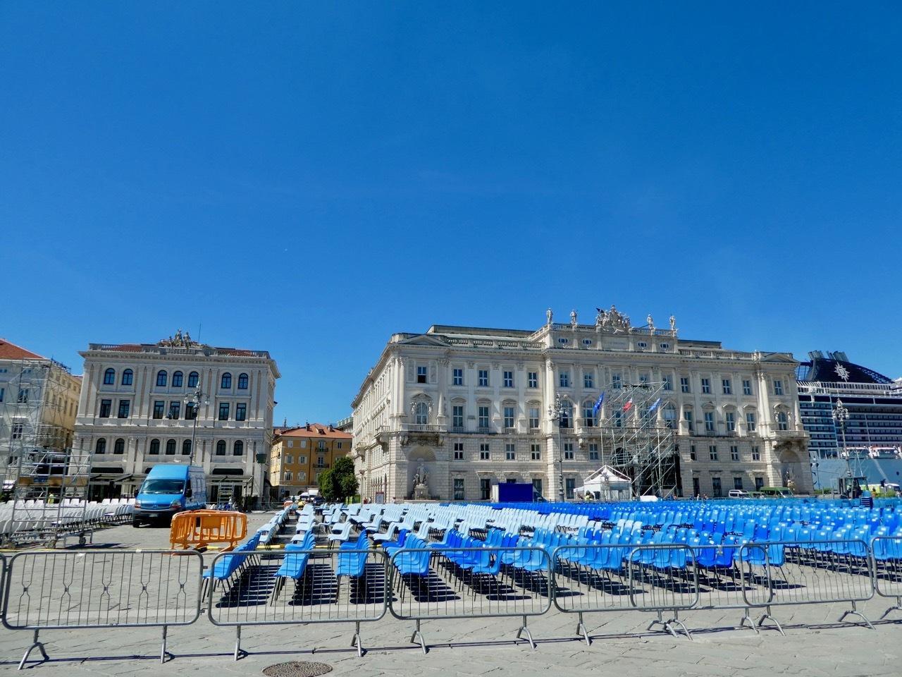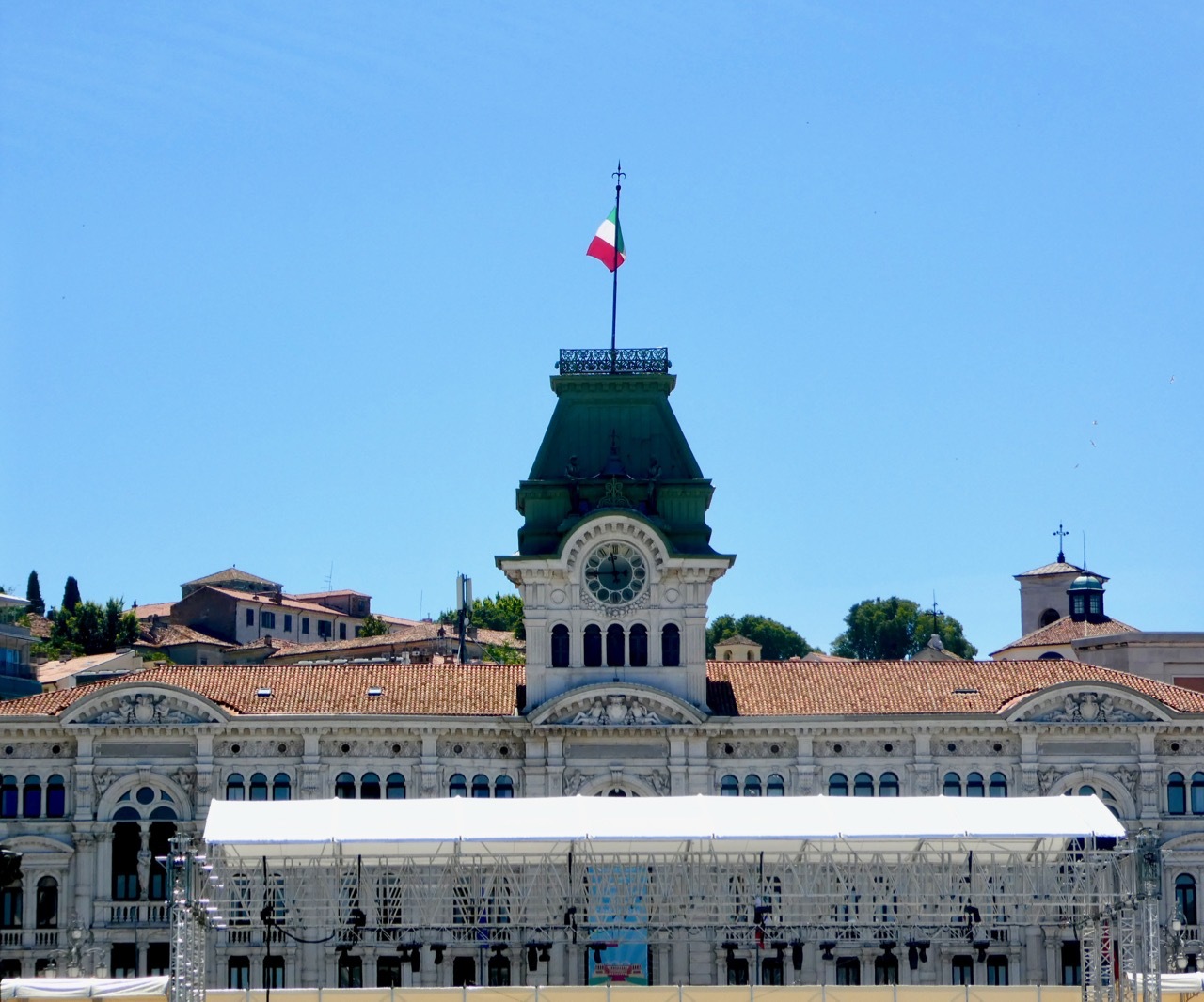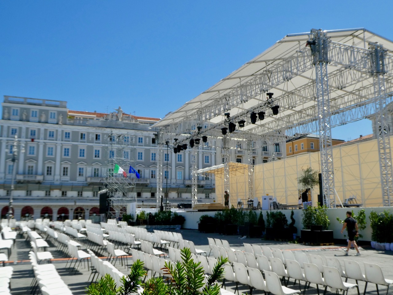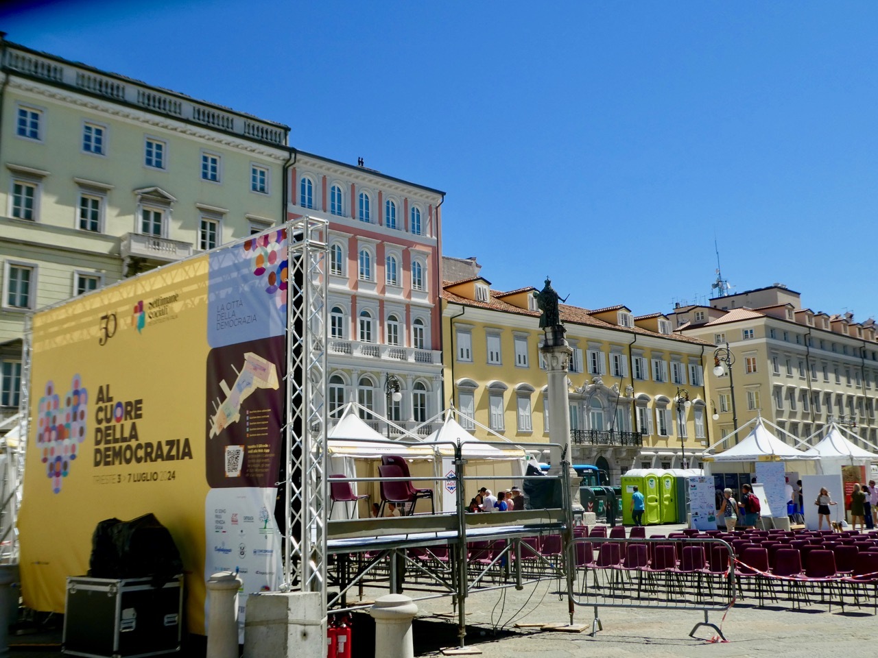 Adding to Bob’s excitement was the excitement of the city itself, host this year to the 50th Social Week of Catholics (Settimane Sociali), a week of lectures and meetings whose goal is “..to make Catholics aware of the true Christian social message.” The theme of this year’s meeting was “At the heart of democracy” and Pope Francis was a featured participant. The major piazzas of central Trieste were filled with viewing stands as well as small tents by organizations dedicated to the goals of the Social Week. It was all festive and chaotic, and left me a bit unanchored as to where I was at any given point in time. I share some photos to remember the day.