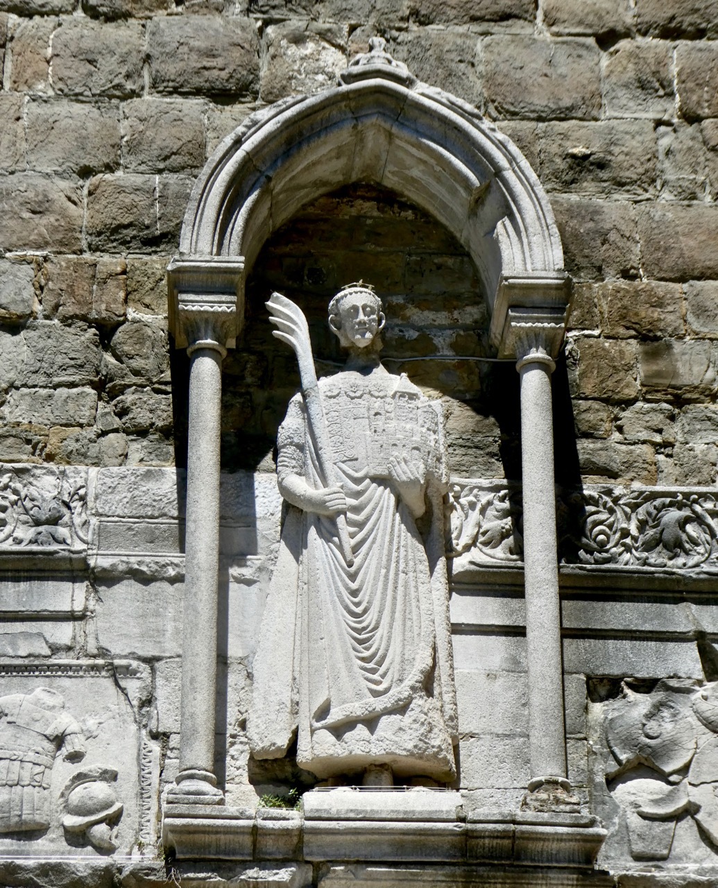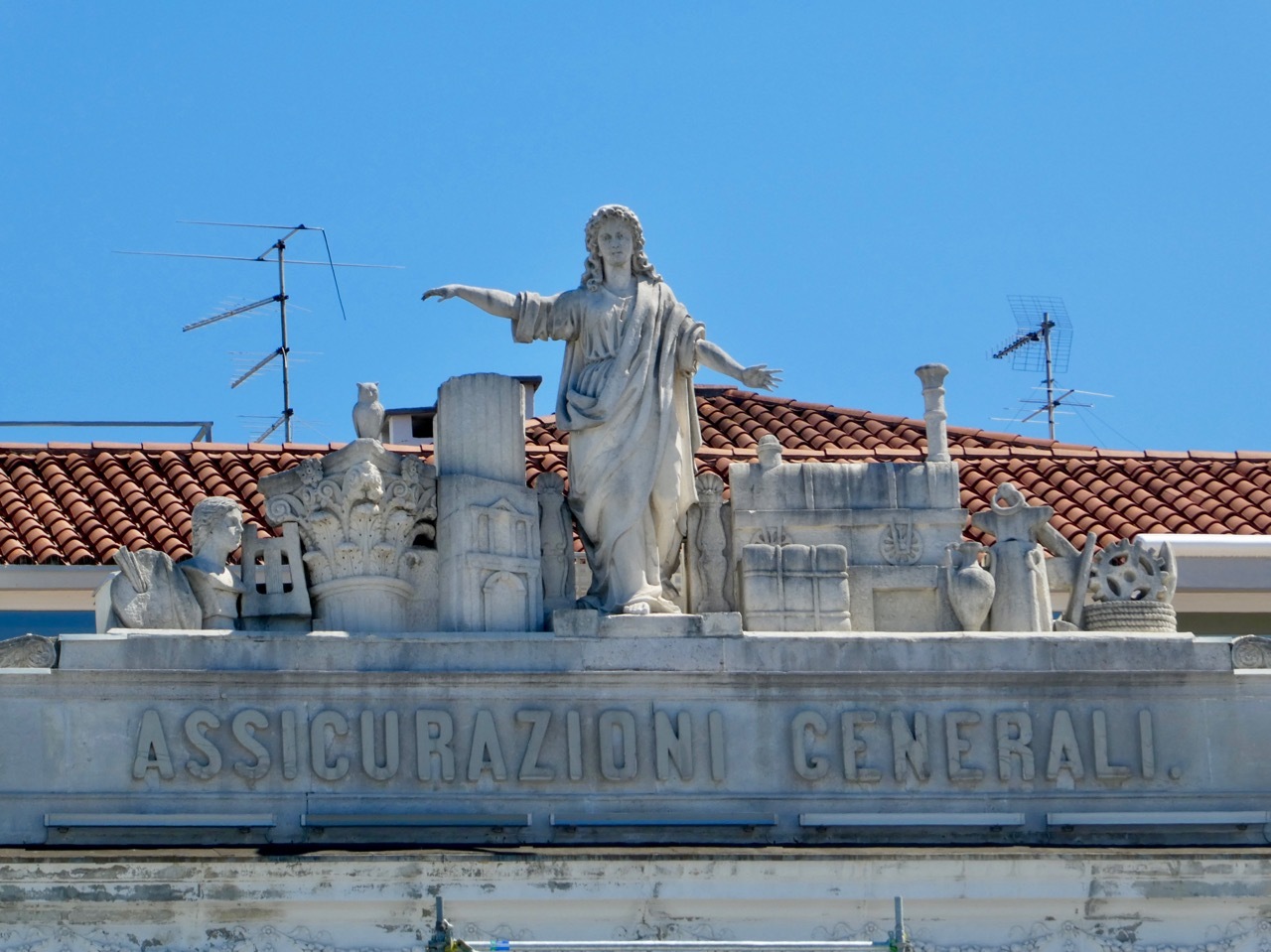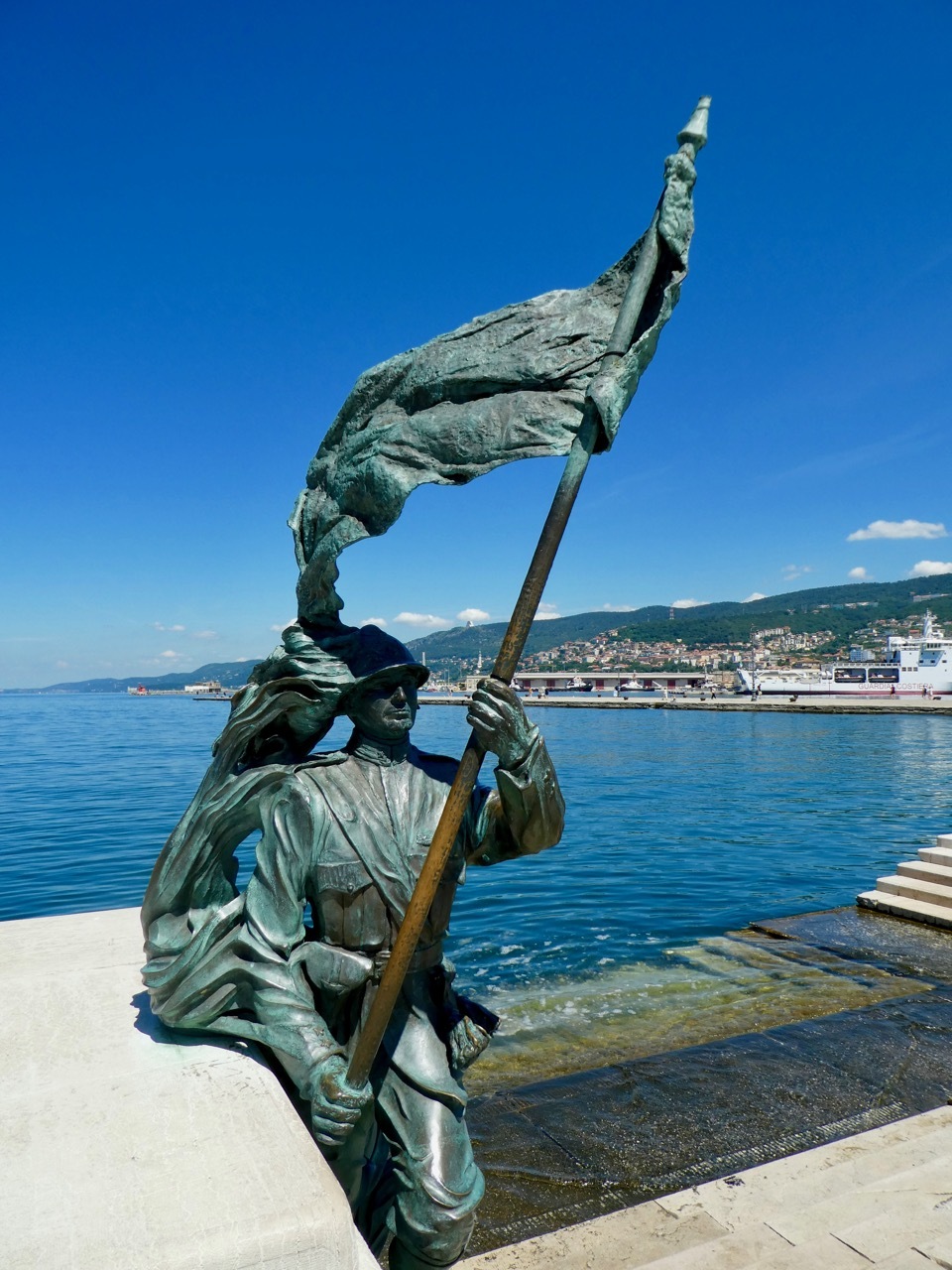 Trieste was awarded to Italy as a condition of Italy joining Allied forces during WWI. According to Bob, this bronze statue of soldier with a flag depicts Italy planting the flag in Trieste and claiming the city as her own