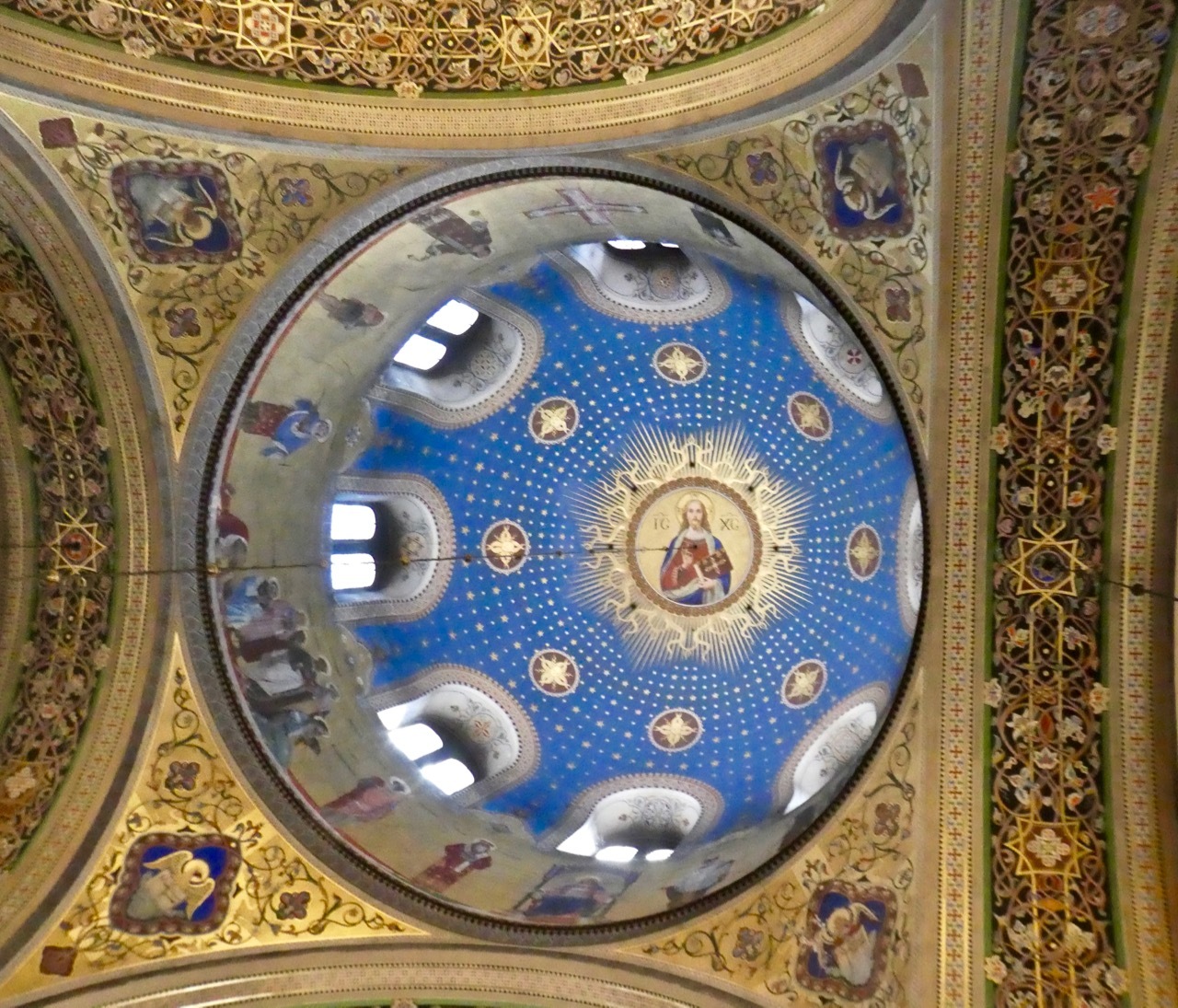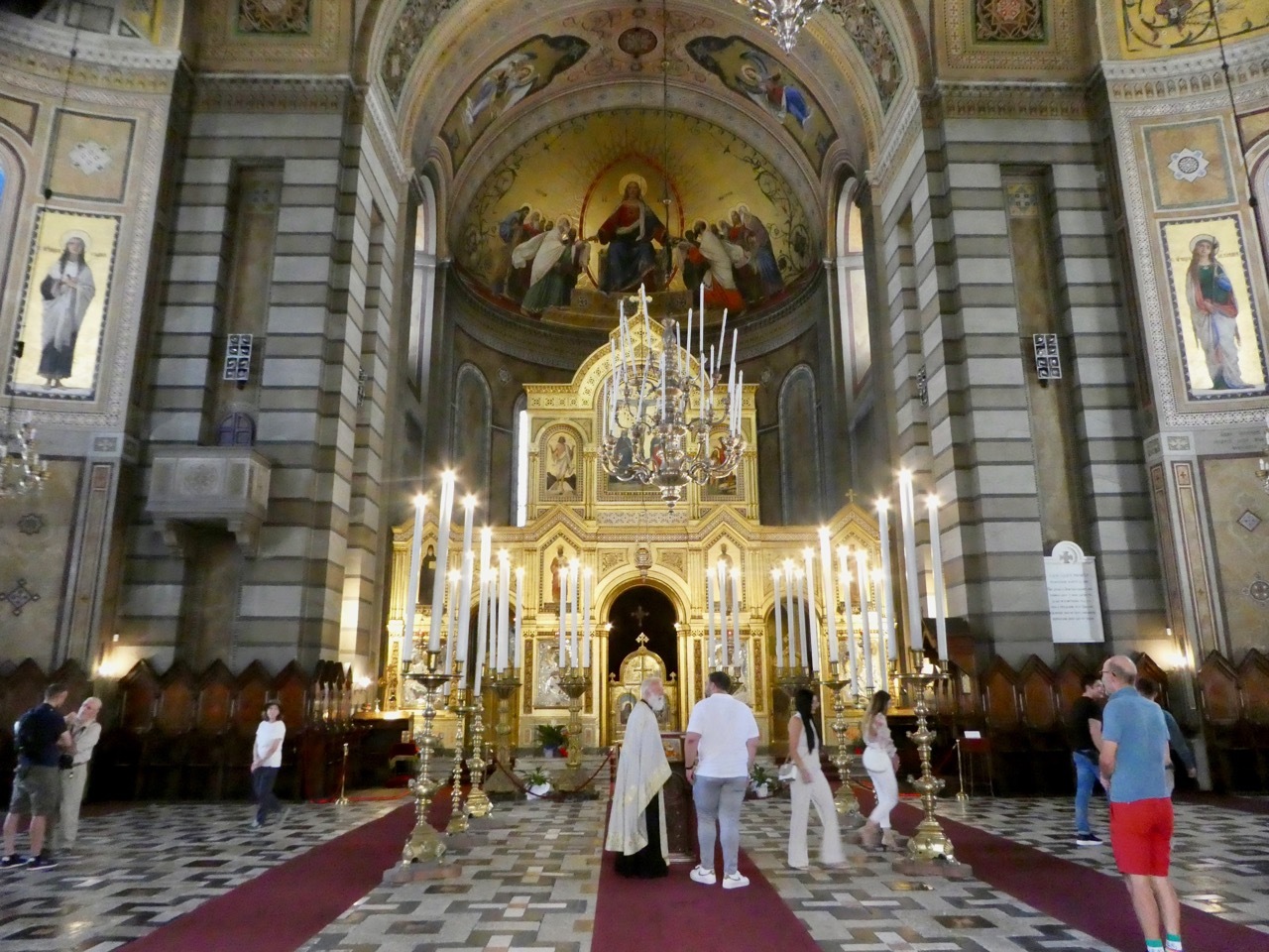 Inside Saint Spyridon Church, a Serbian Orthodox Church with a traditional Byzantine Greek-cross floor plan. The priest visits with parishioners after a baptismal service while Bob listens in