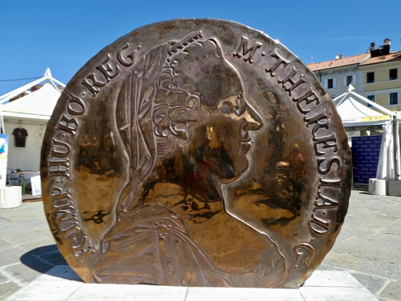 A large coin statue honors Maria Theresa of Austria, the Hapsburg ruler of Trieste who was a major force in creating the Grand Canal and the development of the Borgo Teresiano