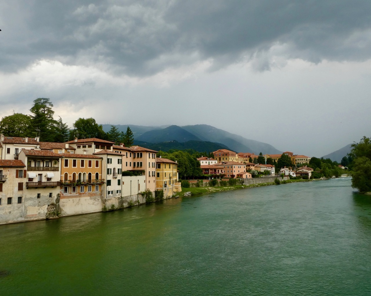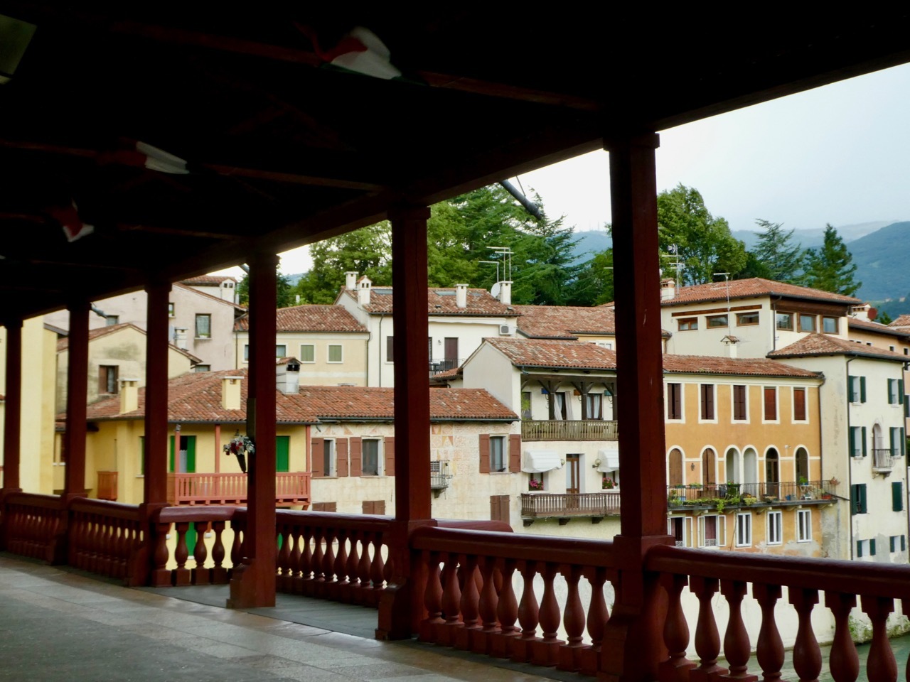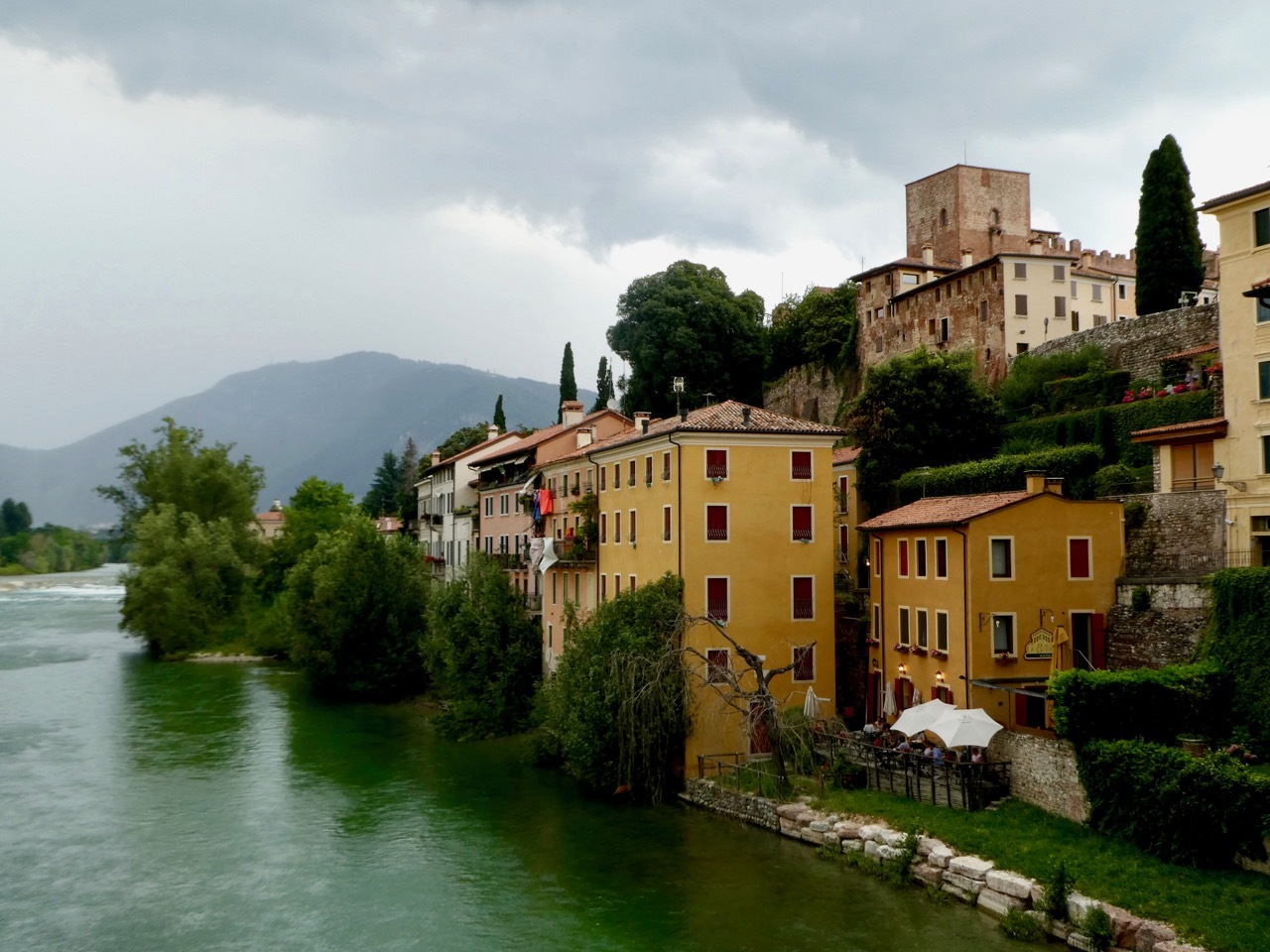 After finishing up the placement test I went out for a short walk about town, heading first to Bassano’s own Ponte Vecchio, also known as the Ponte Vecchio di Bassano. The covered wooden bridge, designed by Andrea Palladio, spans the Brenta River and by law is a declared national monument. Today, a storm was sweeping down the Brenta River with high winds that flattened the flags hanging from the bridge’s eaves and sent several tourists scrambling to the railings for a secure hold. Storm clouds loomed and it began to rain as I made my way back toward Piazza Liberté, ducking in at the last moment to a small restaurant with an Aperto sign in the window. It was obvious that they were closing soon, but they seated me with a big smile and one of the best pasta dishes I’ve had in a long time – Tagliolini with fresh salmon, simple fare but delicious. The rest of the afternoon was spent writing and finalizing plans for the last few days of what has been a fantastic loop around Northern Italy.