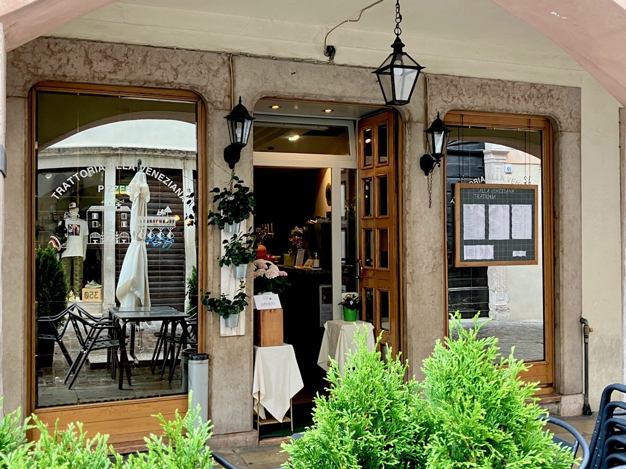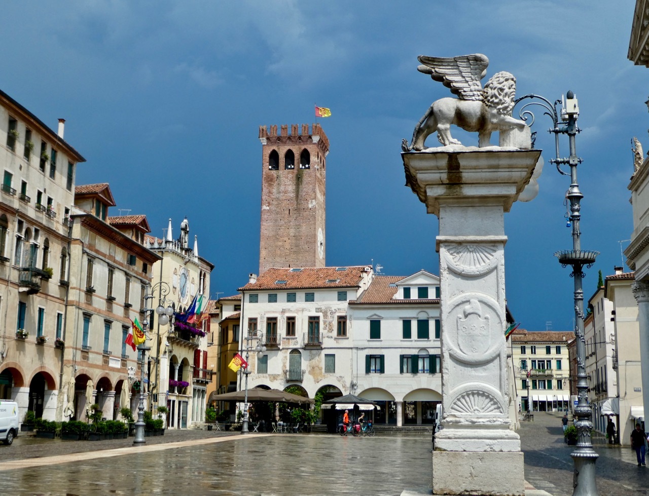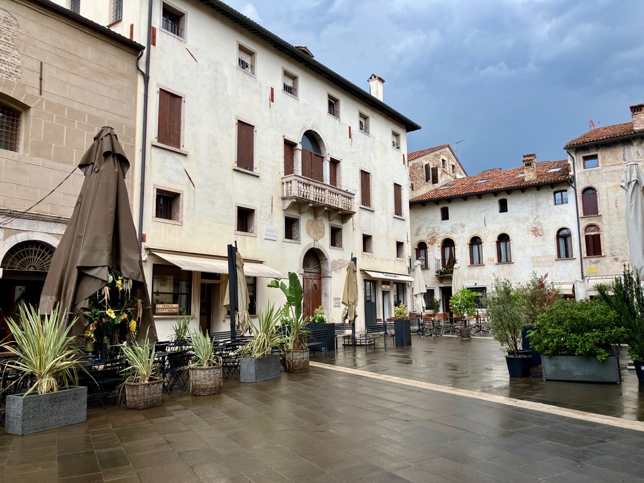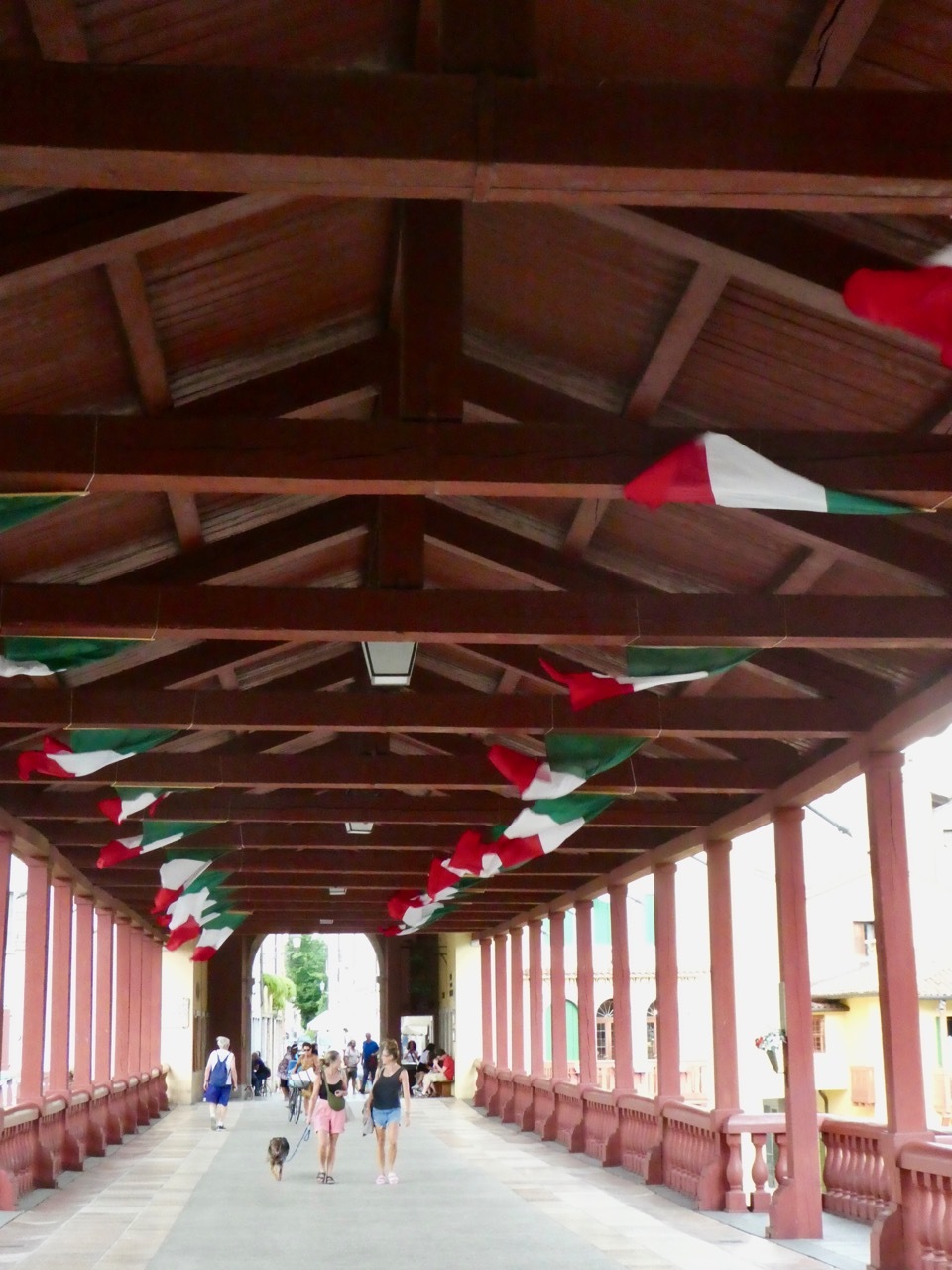 After finishing up the placement test I went out for a short walk about town, heading first to Bassano’s own Ponte Vecchio, also known as the Ponte Vecchio di Bassano. The covered wooden bridge, designed by Andrea Palladio, spans the Brenta River and by law is a declared national monument. Today, a storm was sweeping down the Brenta River with high winds that flattened the flags hanging from the bridge’s eaves and sent several tourists scrambling to the railings for a secure hold. Storm clouds loomed and it began to rain as I made my way back toward Piazza Liberté, ducking in at the last moment to a small restaurant with an Aperto sign in the window. It was obvious that they were closing soon, but they seated me with a big smile and one of the best pasta dishes I’ve had in a long time – Tagliolini with fresh salmon, simple fare but delicious. The rest of the afternoon was spent writing and finalizing plans for the last few days of what has been a fantastic loop around Northern Italy.