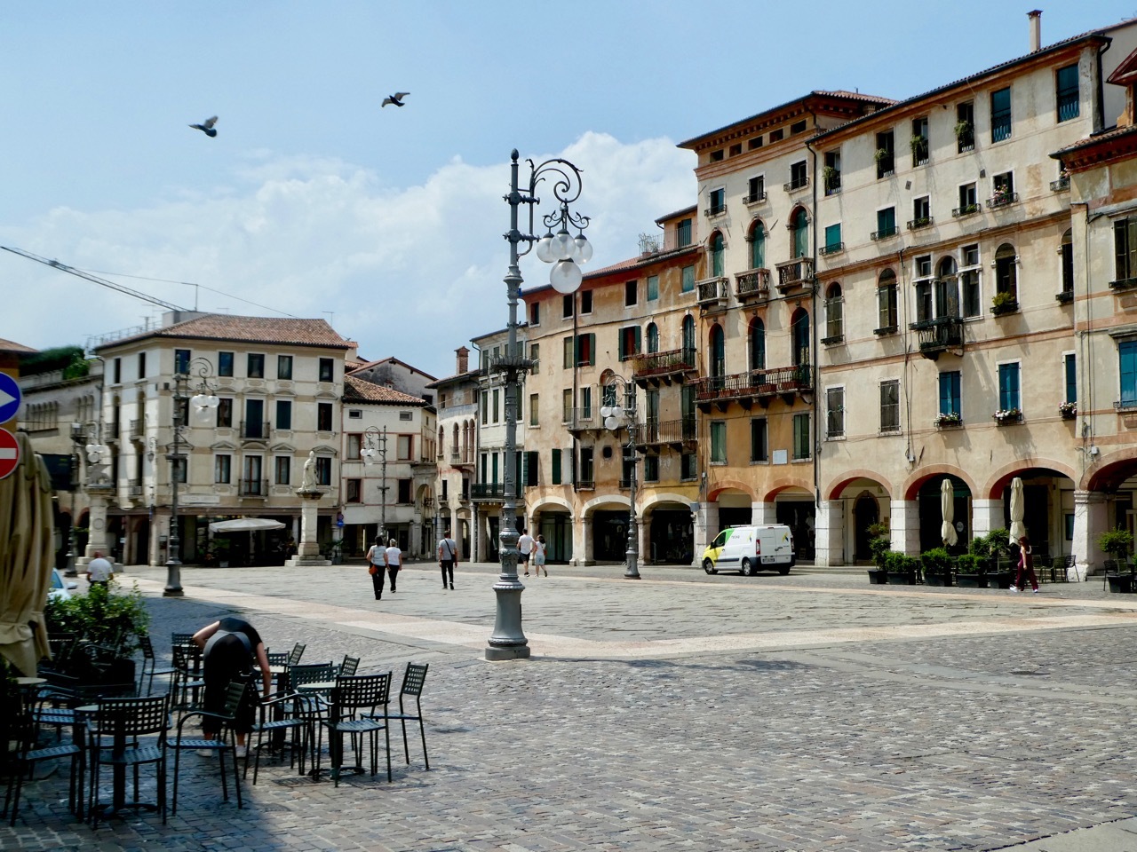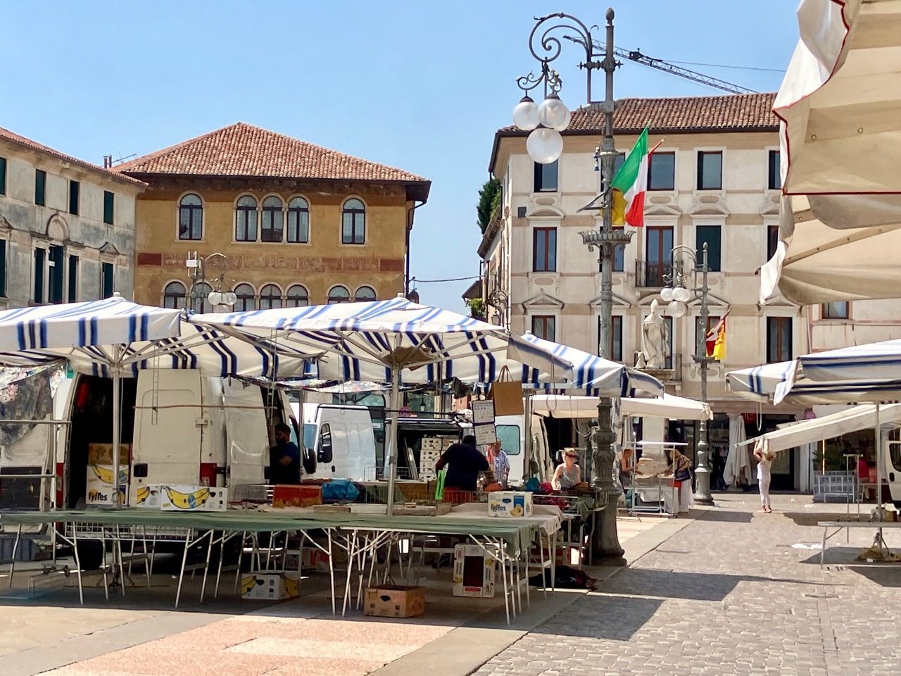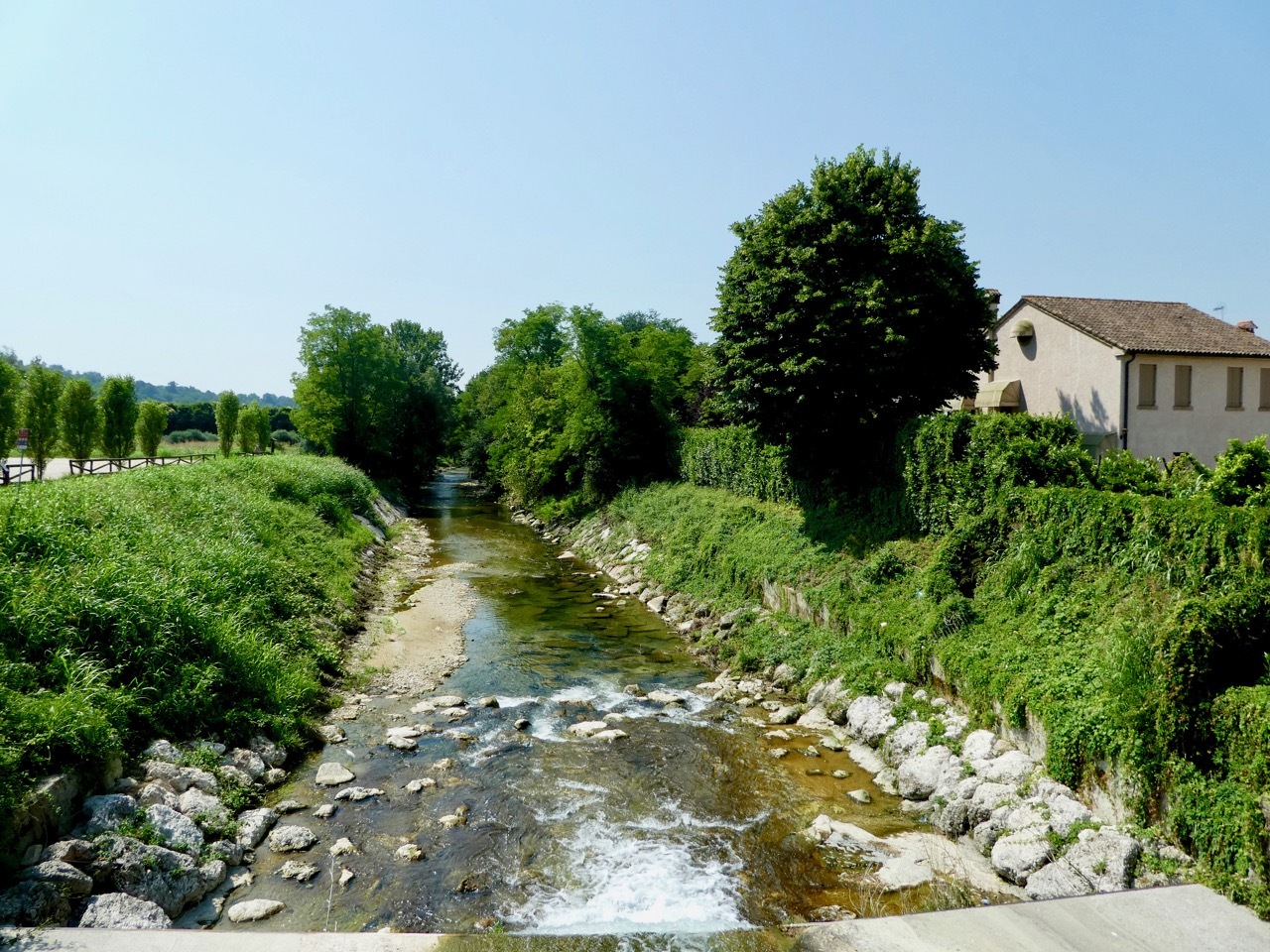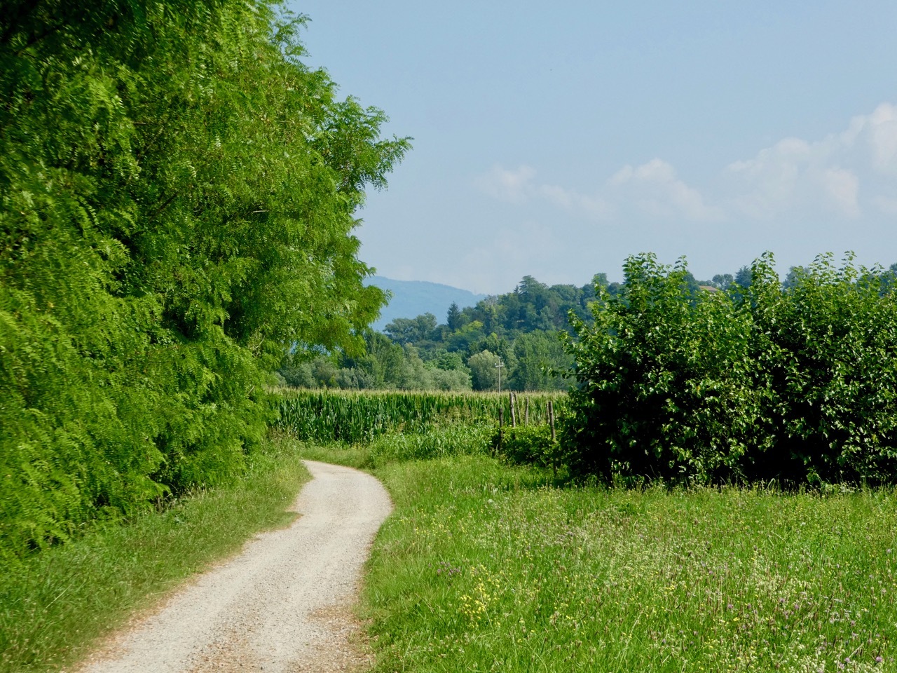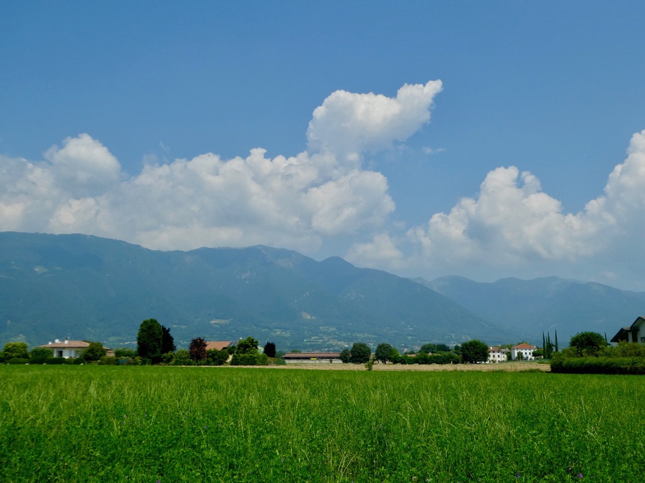 It was projected to be another hot day in the mid-90s and I was thankful that I’d planned low mileage day – less than 25 miles to Bassano del Grappa with a stop in Asols, a town given high marks by Team Anderson. I didn’t get the early start I’d hoped for, but by 9 am I was heading north along the canal way under a blue but hazy sky. After a few miles, I picked up the I2 cycle route, The Ring of Veneto, that I planned to follow to Bassano Del Grappa.