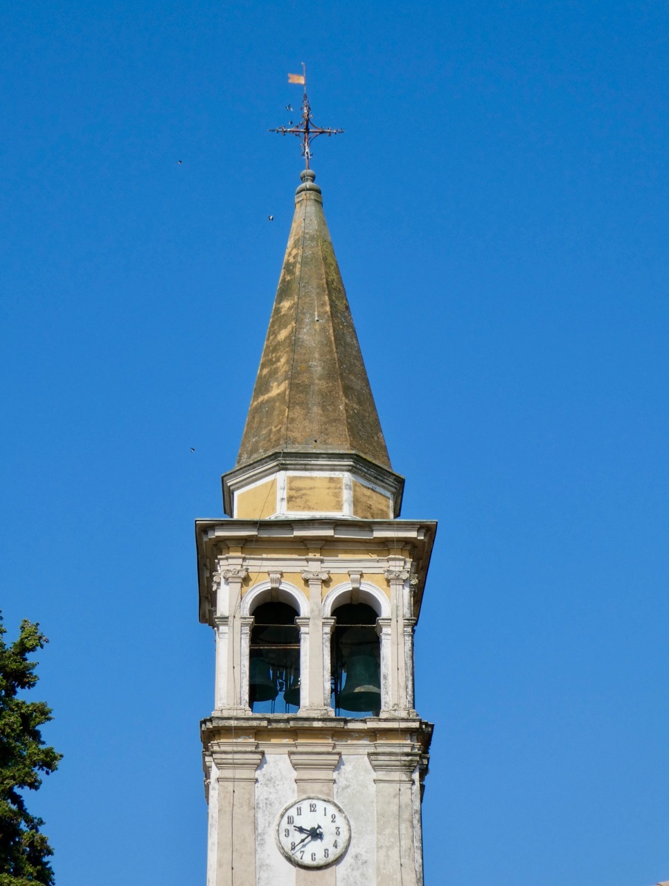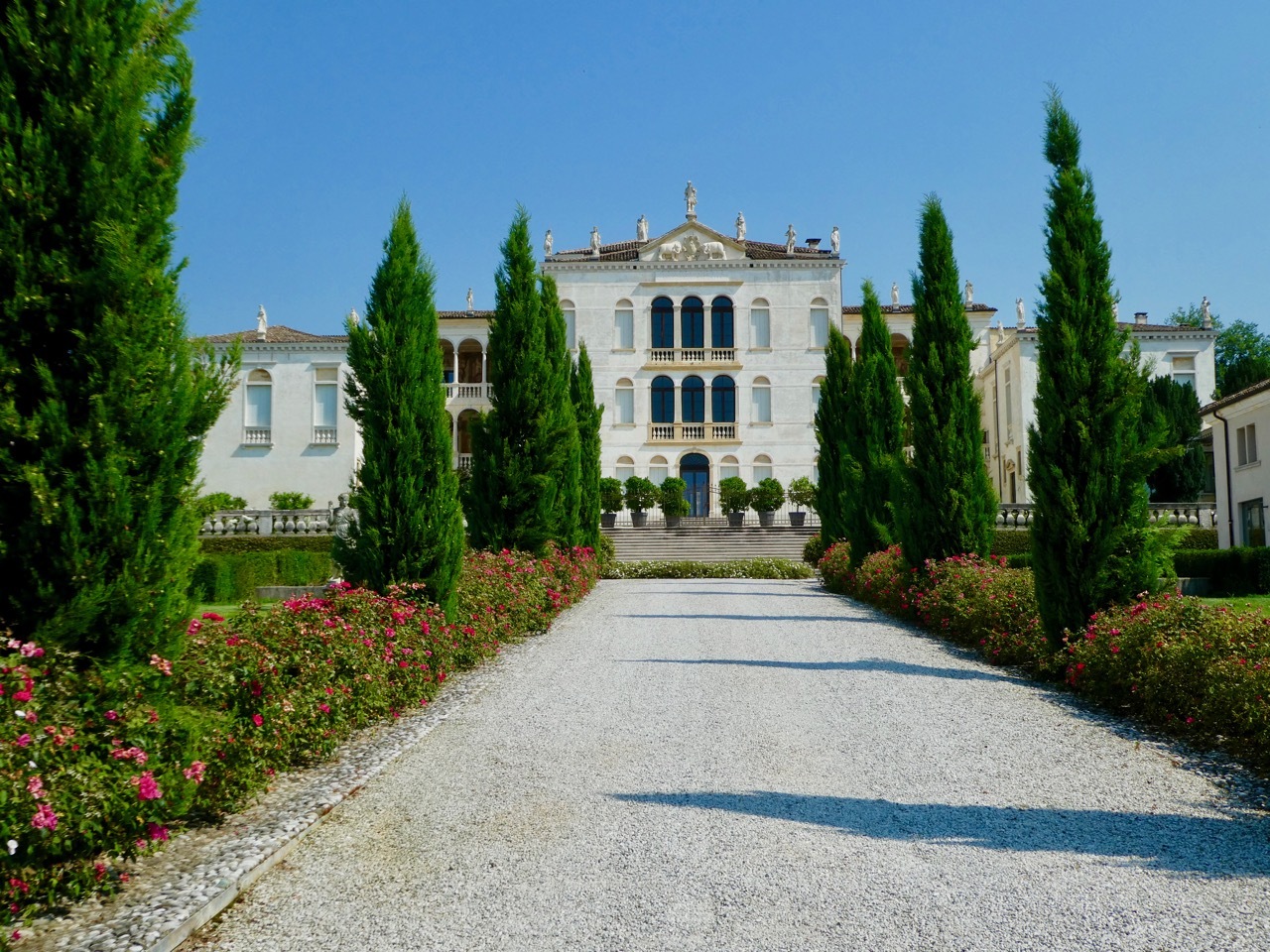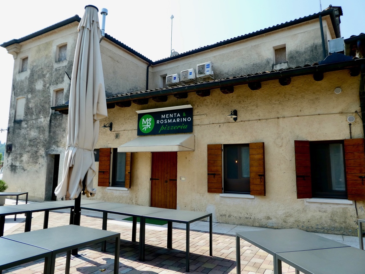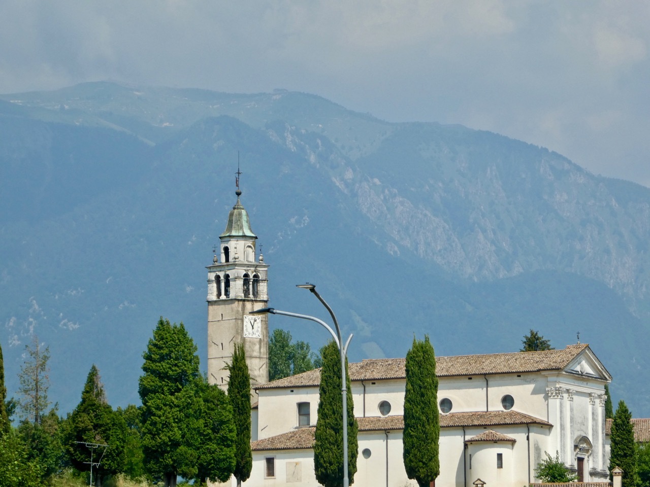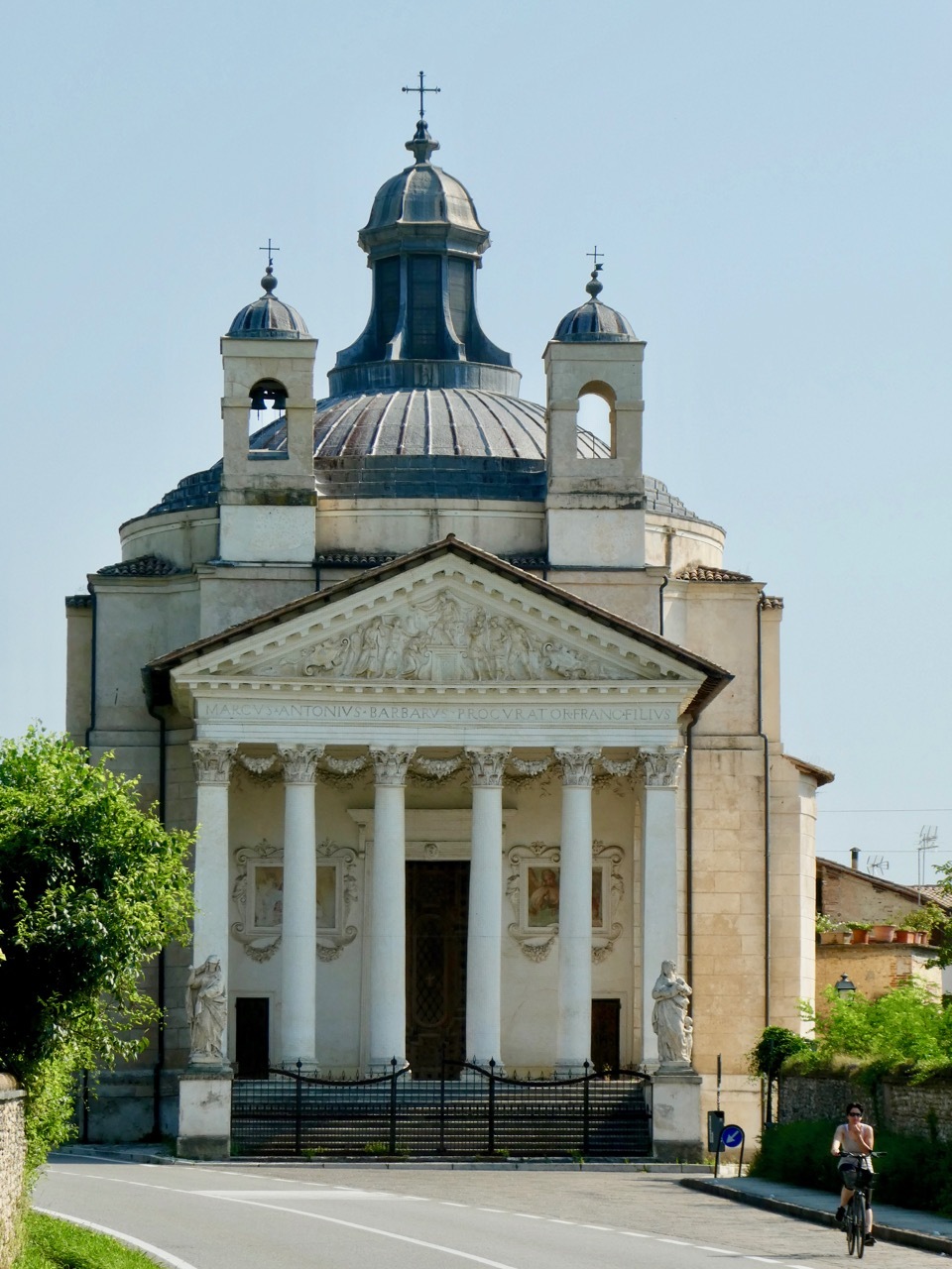 The detour put me back on the provincial SP84, past more ornate villas, and eventually onto a gravel bike path that took me to Pagnano d'Asolo where I rejoined my original route. By that time I was a bit overheated and in need of a cold drink. There was a nearby pizza restaurant that seemed to be in the process of opening up – no lights were on but the window shutters were open. I called out through an open window and soon a young man appeared – no they weren’t open but he could sell me some bottled water – cold mineral water or room temperature still. I took one of each, downing the mineral water on the spot before moving on.