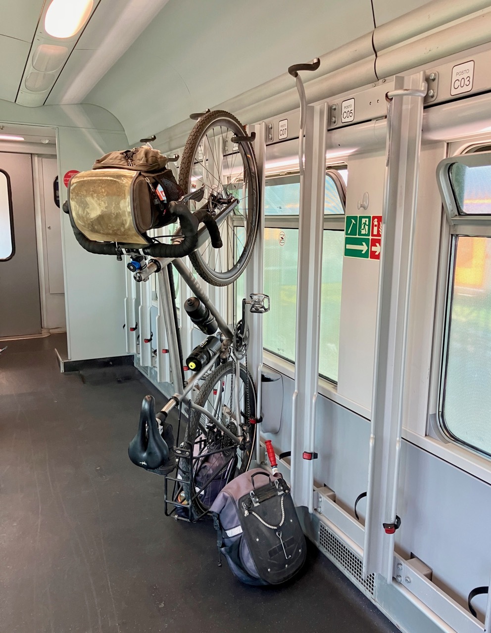 The bike car on the train to Bologna was clearly marked – I lifted up Vivien George and was stunned to find myself staring at two rows bike hooks extending the length of the car. No seats, just space for bikes. And there was a similar arrangement in the next car – more bike space than I could ever imagine. There were only three bikes on the train, and though there was plenty of space to lean VG against the side, I had nothing to secure her with and hoisted her up with help from one of the other riders. The conductor came by and said we could not stay in the bike car, and so I found a seat in the next car and trusted that everything would arrive in Bologna safely. And they did.