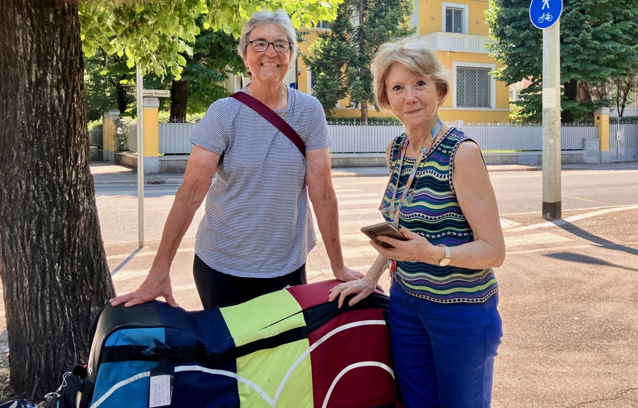 I arrived at Bologna Centrale just before 2 pm and made the two-mile trip to Christiane’s house, arriving hot and sweaty. They’d saved some pasta for me from their mid-day meal so the first thing I did was chow down and catch up a bit with Christiane. Although I desperately wanted a shower, I decided to pack up Vivien George while I was still dirty. There was a shaded spot in the courtyard and I set to work, getting all the bike bits into the travel sac before getting myself cleaned up. We all decided it was too hot to go out to dinner, so we had a relaxing meal and evening in front of the fan.