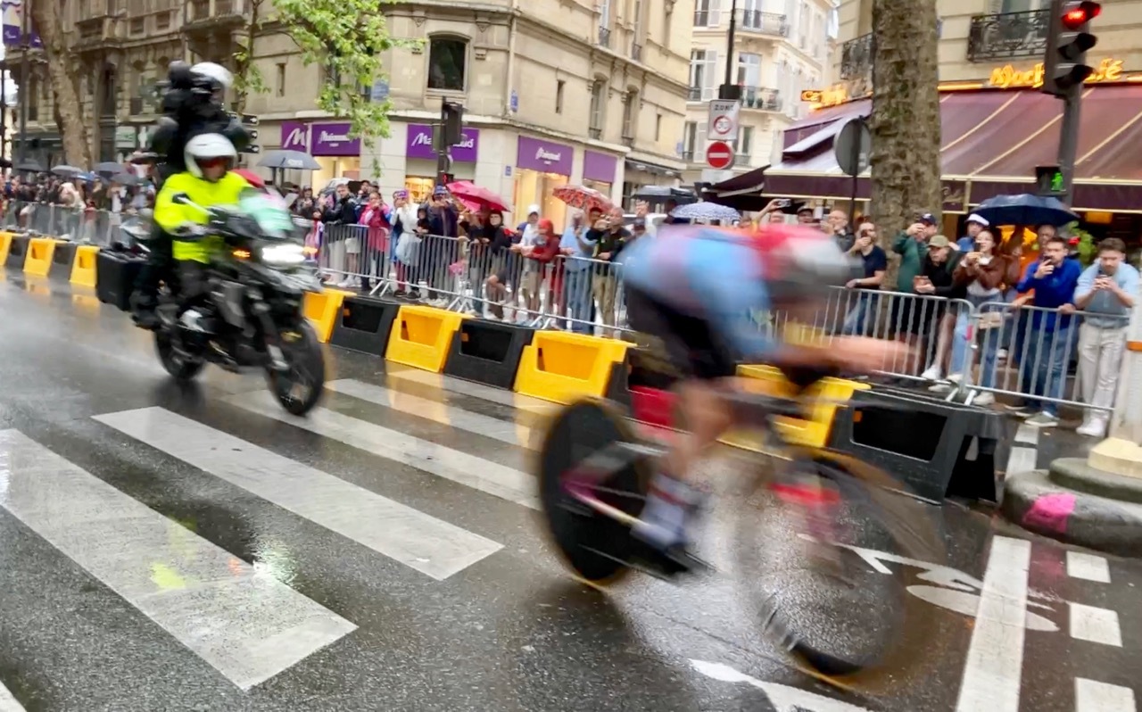 The Women and Men’s Individual Time Trial took place on the exact same 32.4 km route through the streets of Paris, beginning at Les Invalides and ending at Pont Alexander III. With the exception of the start and finish points, spectators were free to view the race anywhere along the route. Because the first and last five km were essentially an out and back along the same stretch of Boulevard Saint-Germain, my strategy was to station myself where I could get a good vantage point of the riders both coming and going. I arrived early and found a spot about 1 km from the finish line – there was a street lamp whose base gave me an elevated perch and whose pole provided a place to support my back.