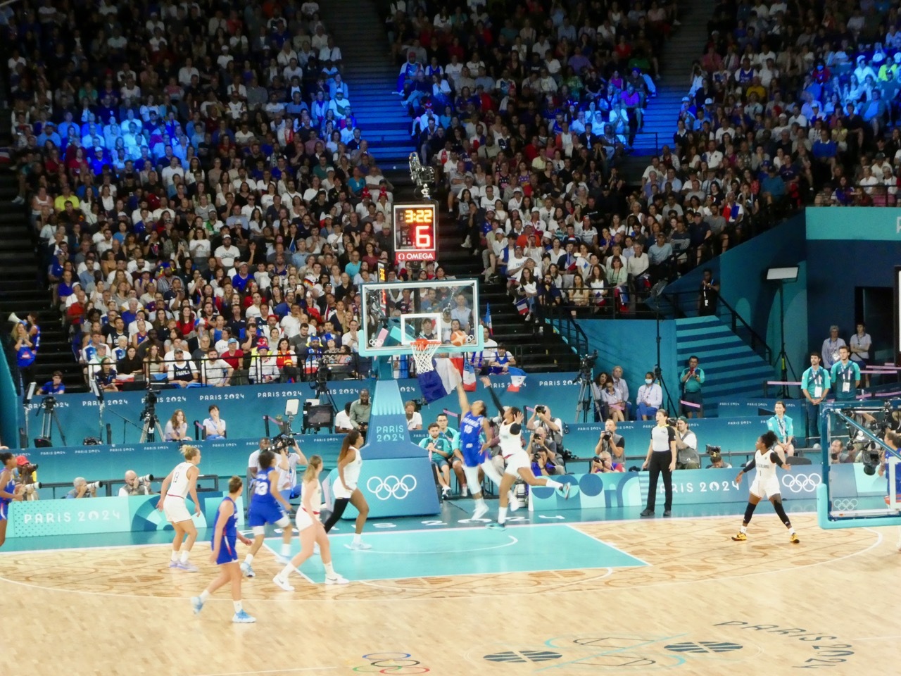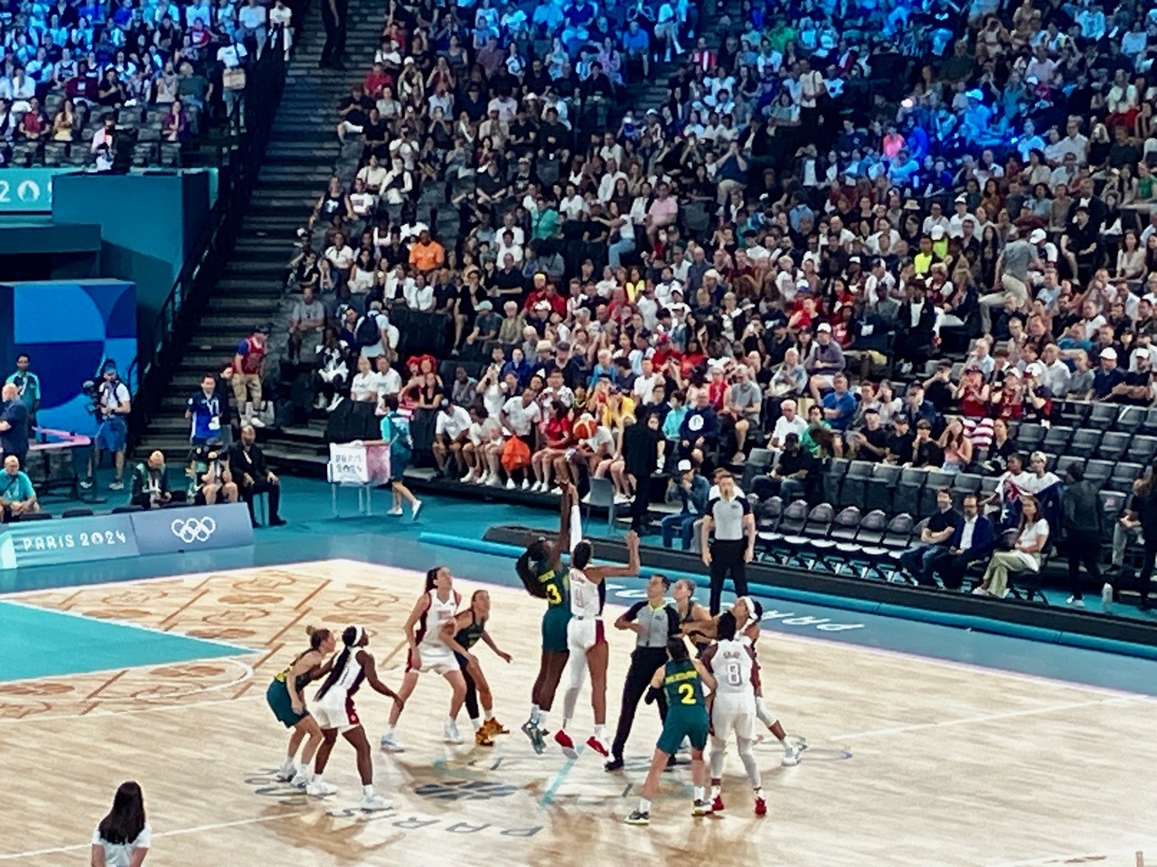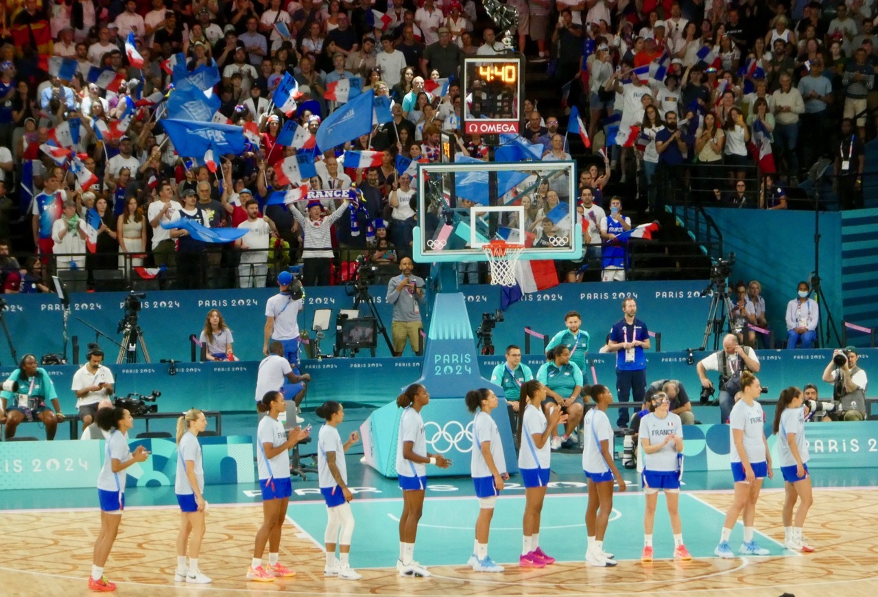 Back in May, the first tickets I purchased after deciding to stay in Paris for the Olympics were for the two women's semi-final basketball games. I really wanted to see the USA Women play and, though it was a near certainty they would make it to the finals, I hedged my bets and bought tickets to both semi-final games. The first game was USA vs Australia, handily won by USA. The play of the Americans was stellar, but the game lacked excitement. The USA dominated from the start and the crowd was subdued, with little flag waving and few chants of “Aussie Aussie Aussie, Oi Oi Oi” or even "USA, USA". Nonetheless, I really enjoyed seeing the USA players in person – and marveled at how far the game and skill sets had advanced since I played D-3 basketball in college.