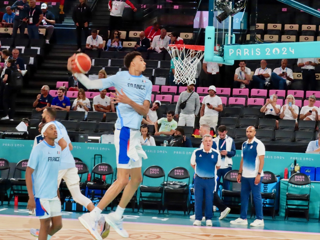 As it turned out, France upset Canada in the quarter-finals and was scheduled to play Germany in one semi-final, with USA facing Serbia in the second semi-final. My ticket was for the France-Germany game, and though disappointed I would not see the USA men play I was excited for another chance to cheer on France. And I was completely blown away to find that my seat was in the fourth row, a few feet away from sports icons and rap stars but more importantly close to the action in a thrilling and very close match that came down to the final seconds. It’s difficult to describe the emotions and joy I experienced during the game, feelings perhaps only avid sports fans might recognize.