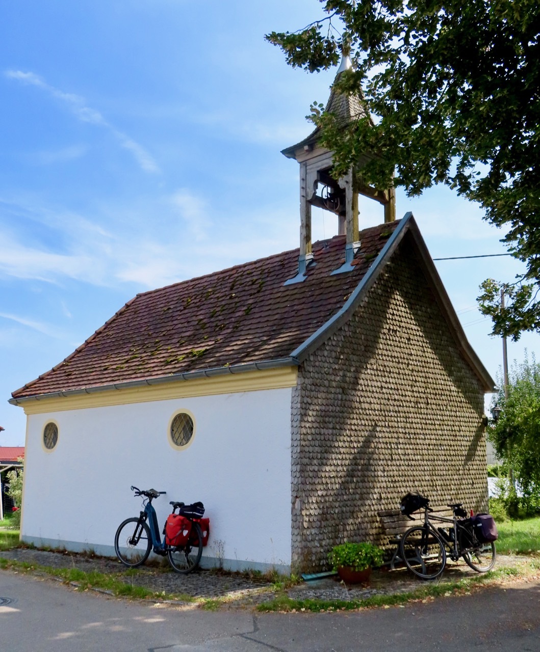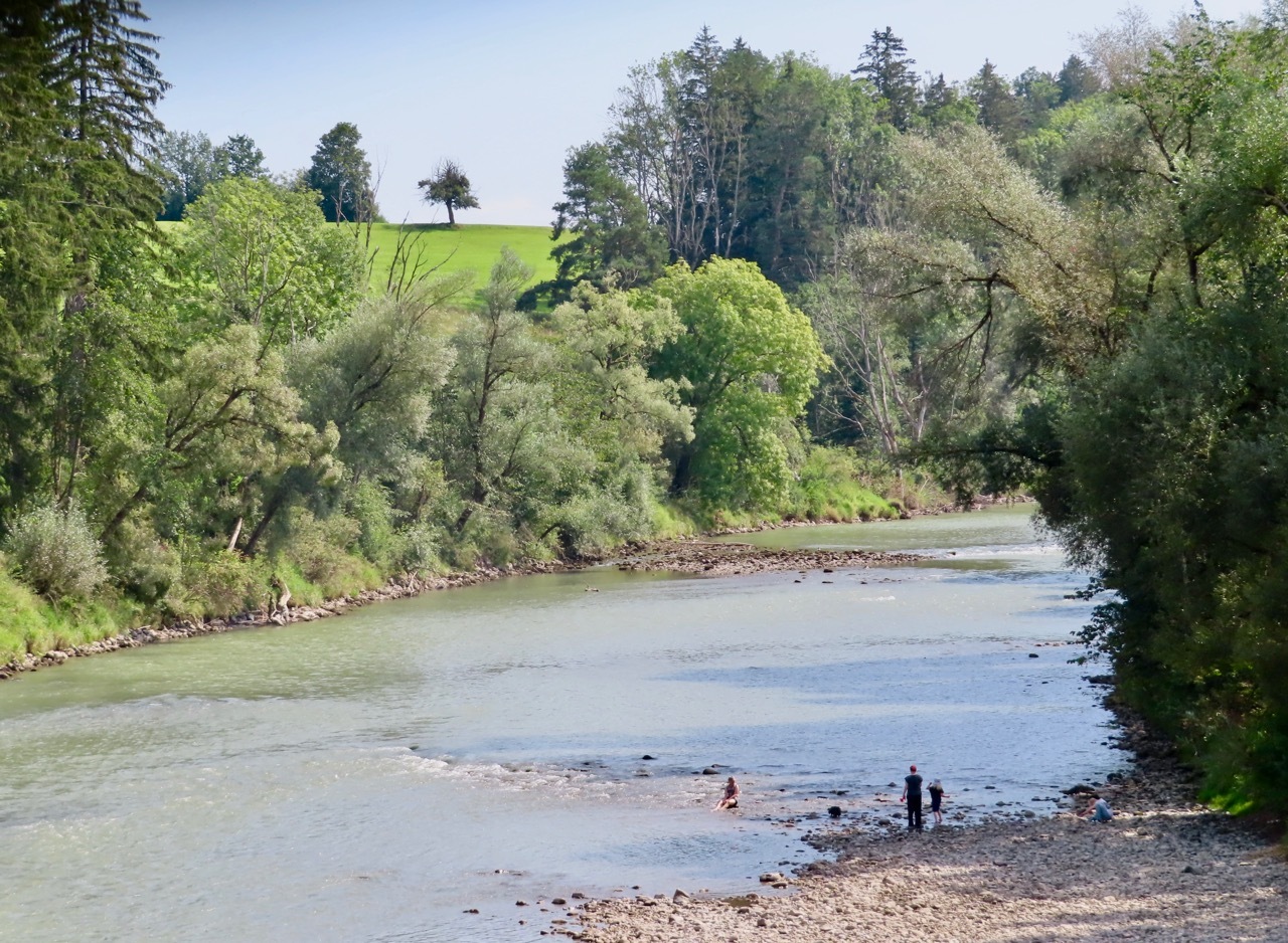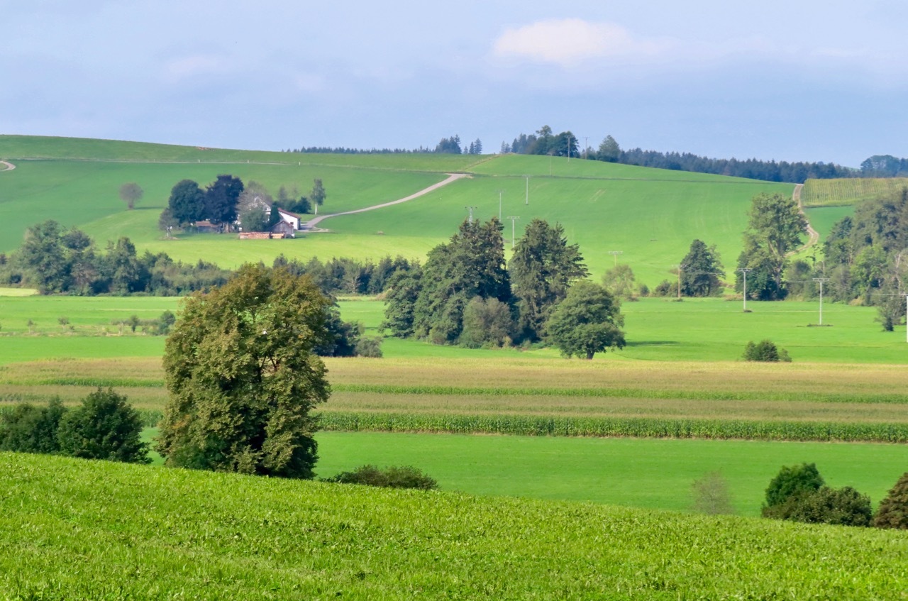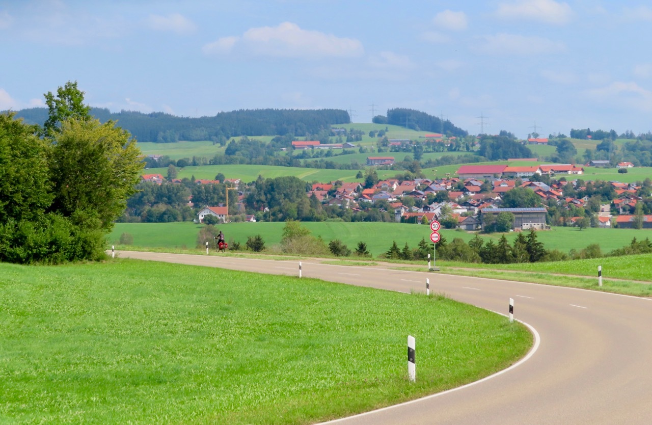 The miles past Altusried were among the best of day - a gentle descent along a small ridge line that wound through the woods on a very manageable gravel surface. We continued on small roads through open countryside, passing through Hirschdorf before crossing the Iller River. The remaining miles tended in an upward direction as we ascended from the river. There was another road construction project that we breezed through, followed by a series of gentle rollers progressing to longer, stiffer climbs rewarded with sweeping downhills into open valleys populated with small towns. Another fine day indeed.