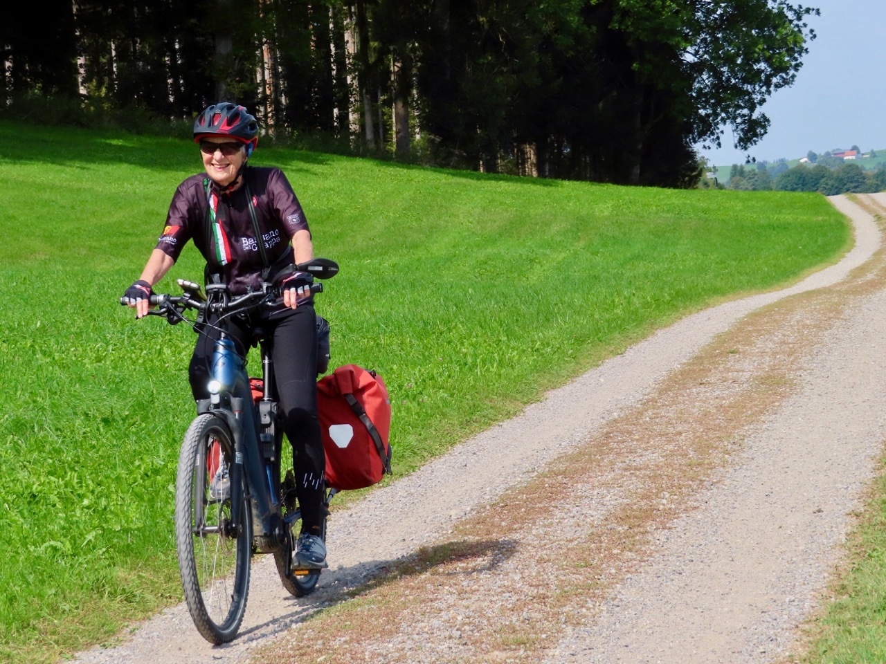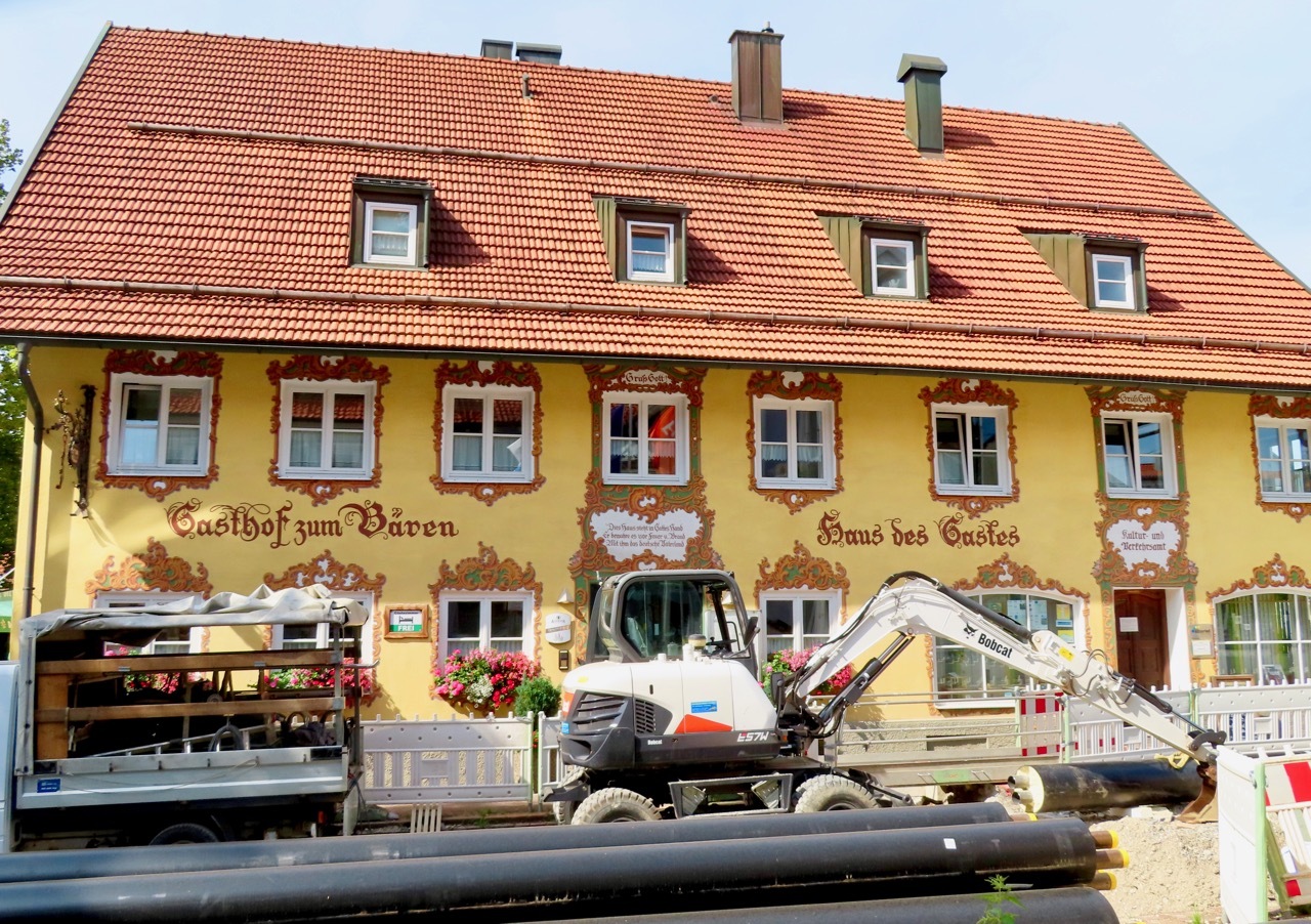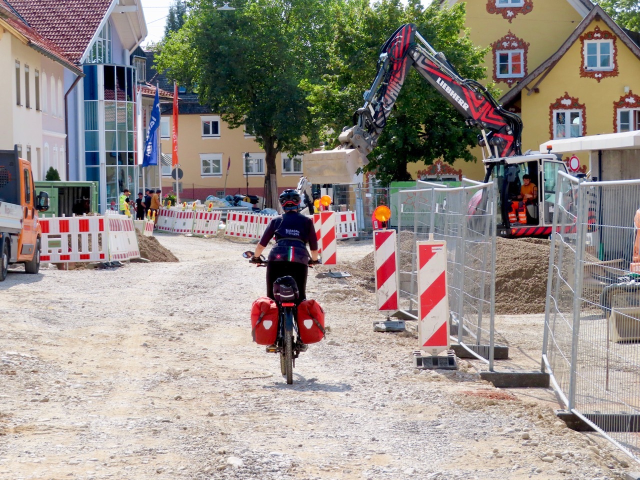 After 10 miles, we pulled into Altusried, a town undergoing major road construction. Heavy equipment filled the street, seeming to block the way through town. Undaunted, we followed an elderly woman with a walker who was slowly making her way down a narrow path, squeezing past big machines on an uneven gravel surface. Suzanne helped the woman over some rough spots, and we then proceeded to gingerly pick our way over the gravel and out of town.