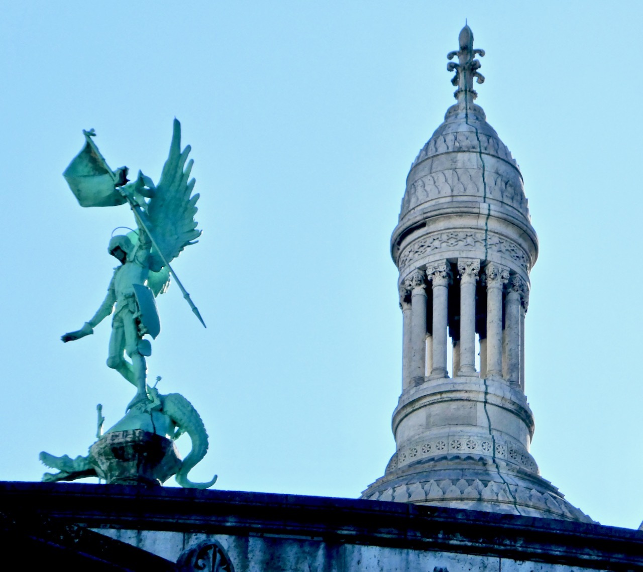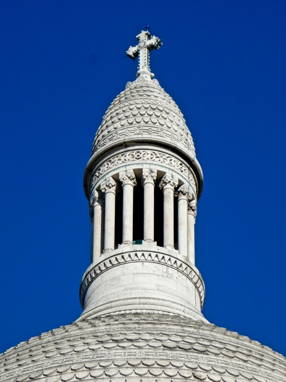 The first stop was Montmartre Butte and the Sacré-Cœur Basilica, located in the 18th arrondissement. I took the metro to the Abesses station and, as is my norm, opted to exit the station via the stairs - not realizing that the station is the deepest in the Paris Métro. I ascended 118 feet up a steep and narrow spiral staircase whose walls were decorated with classic scenes of Paris, a nice distraction from the labored breathing of a young woman struggling up behind me. Once at street level, there was another climb to the top of the butte. I followed signs to the funicular, a mechanical rail car for those not able/willing to climb the 197 steps to the foot of Sacré Coeur. I took the stairs.