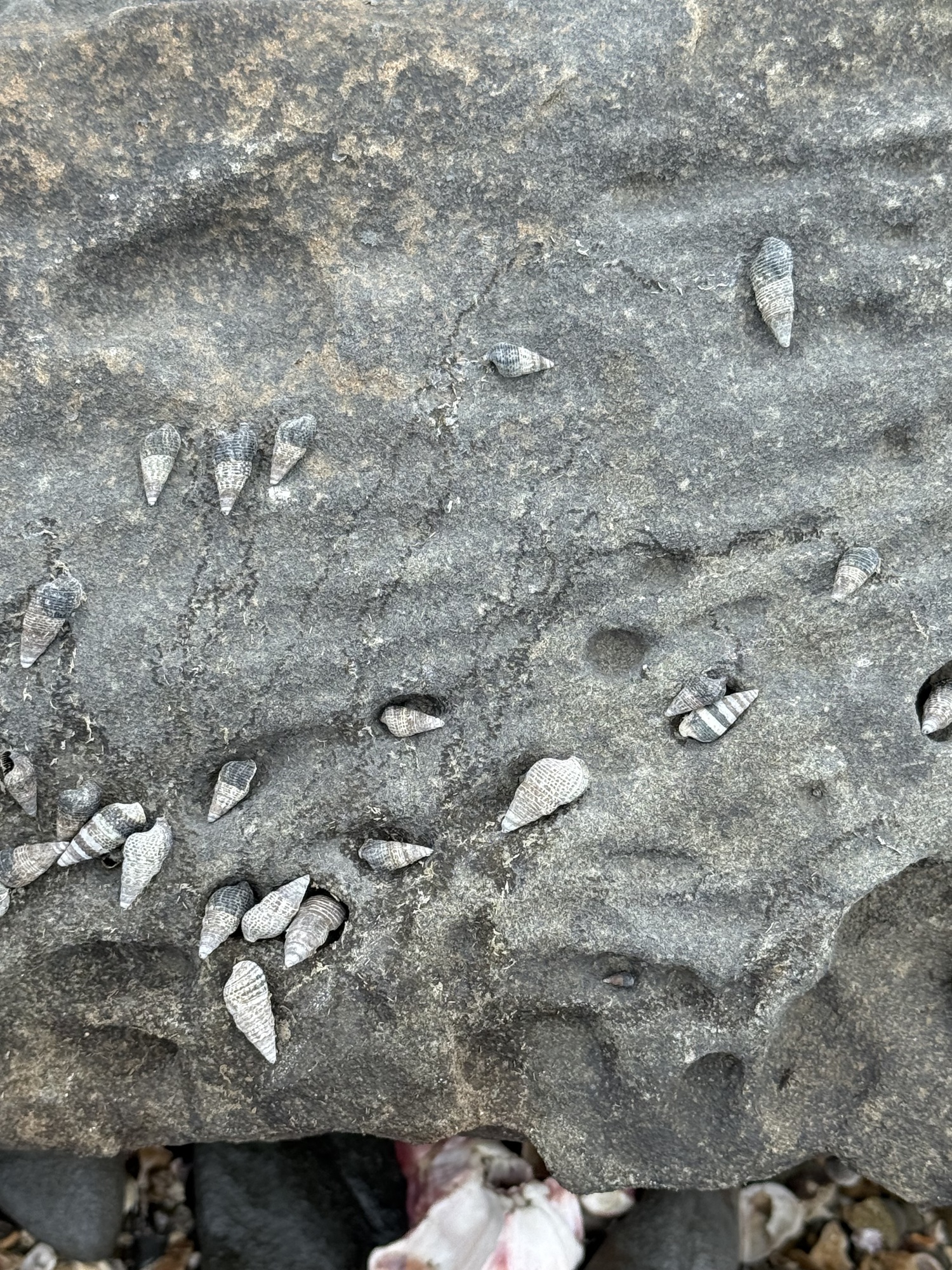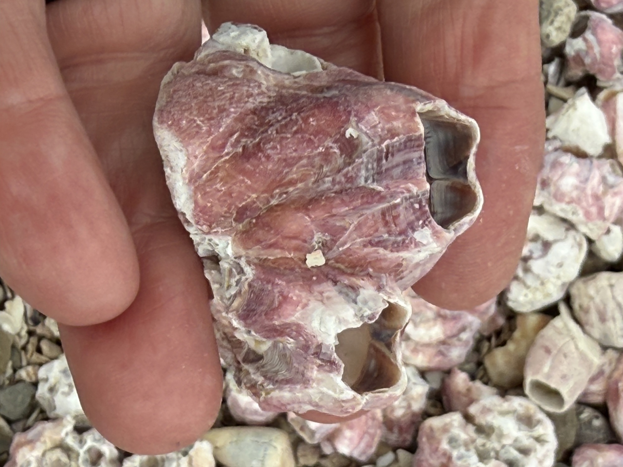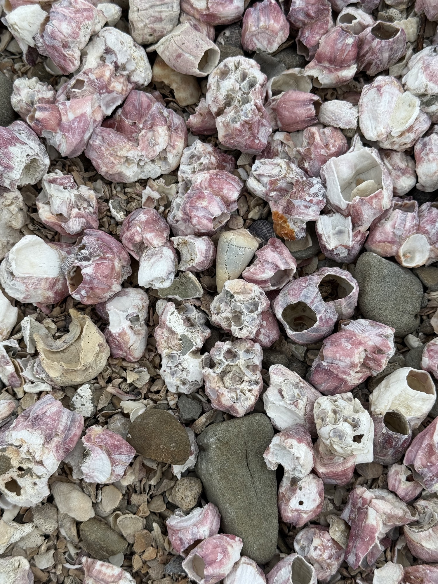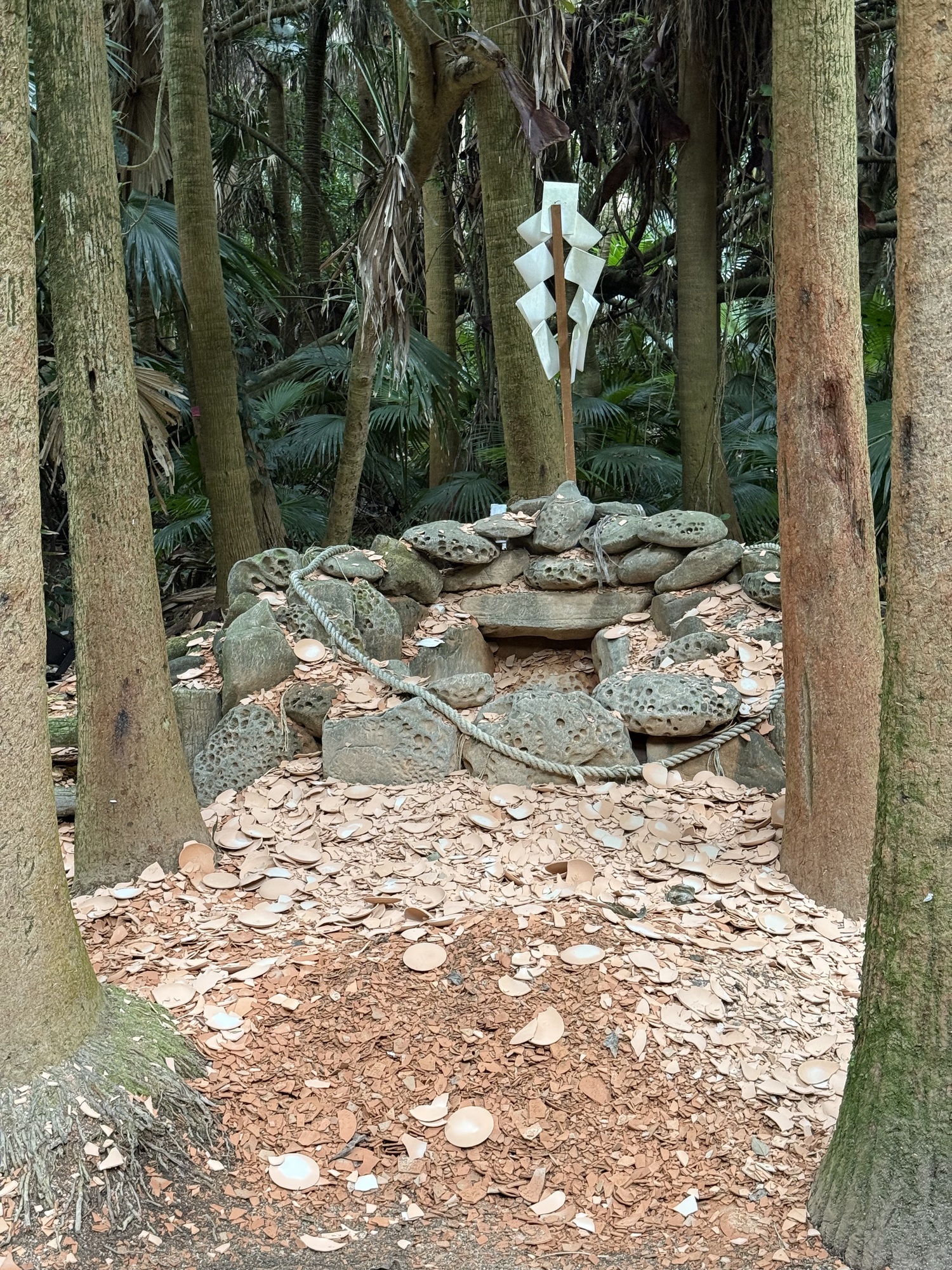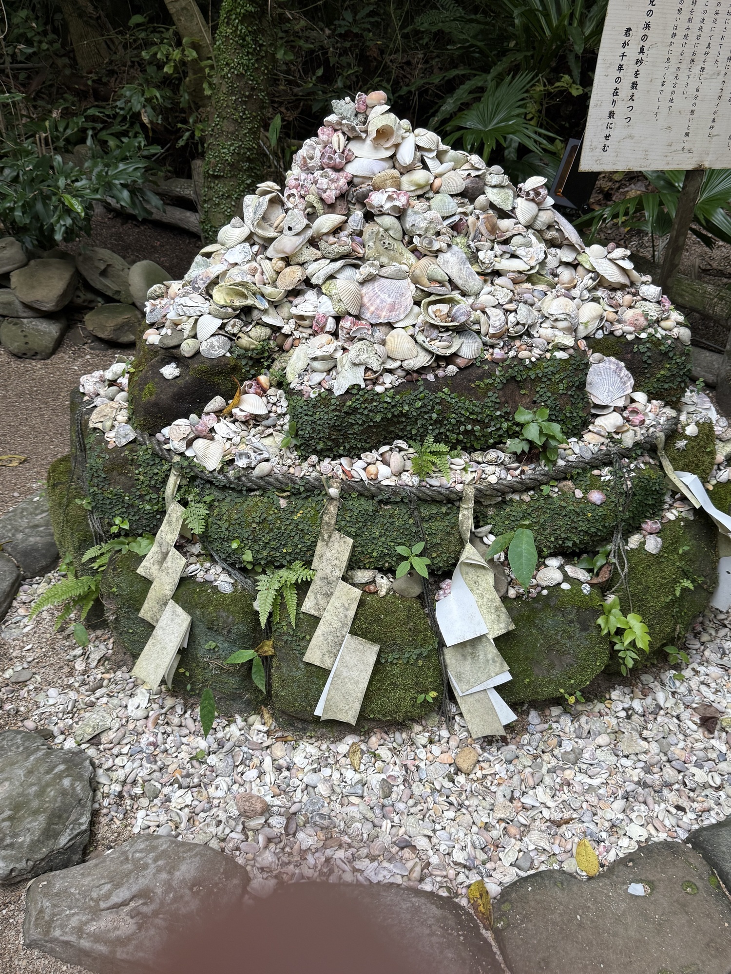 Visitors choose a shell from the beach and leave one on this pile while offering prayers and their wishes.