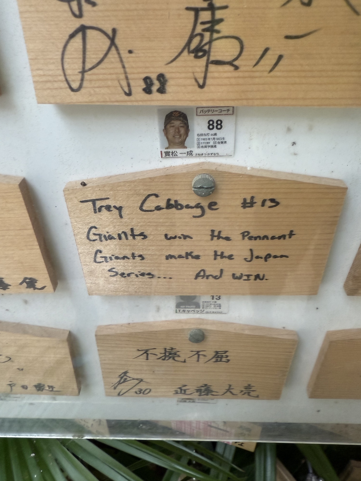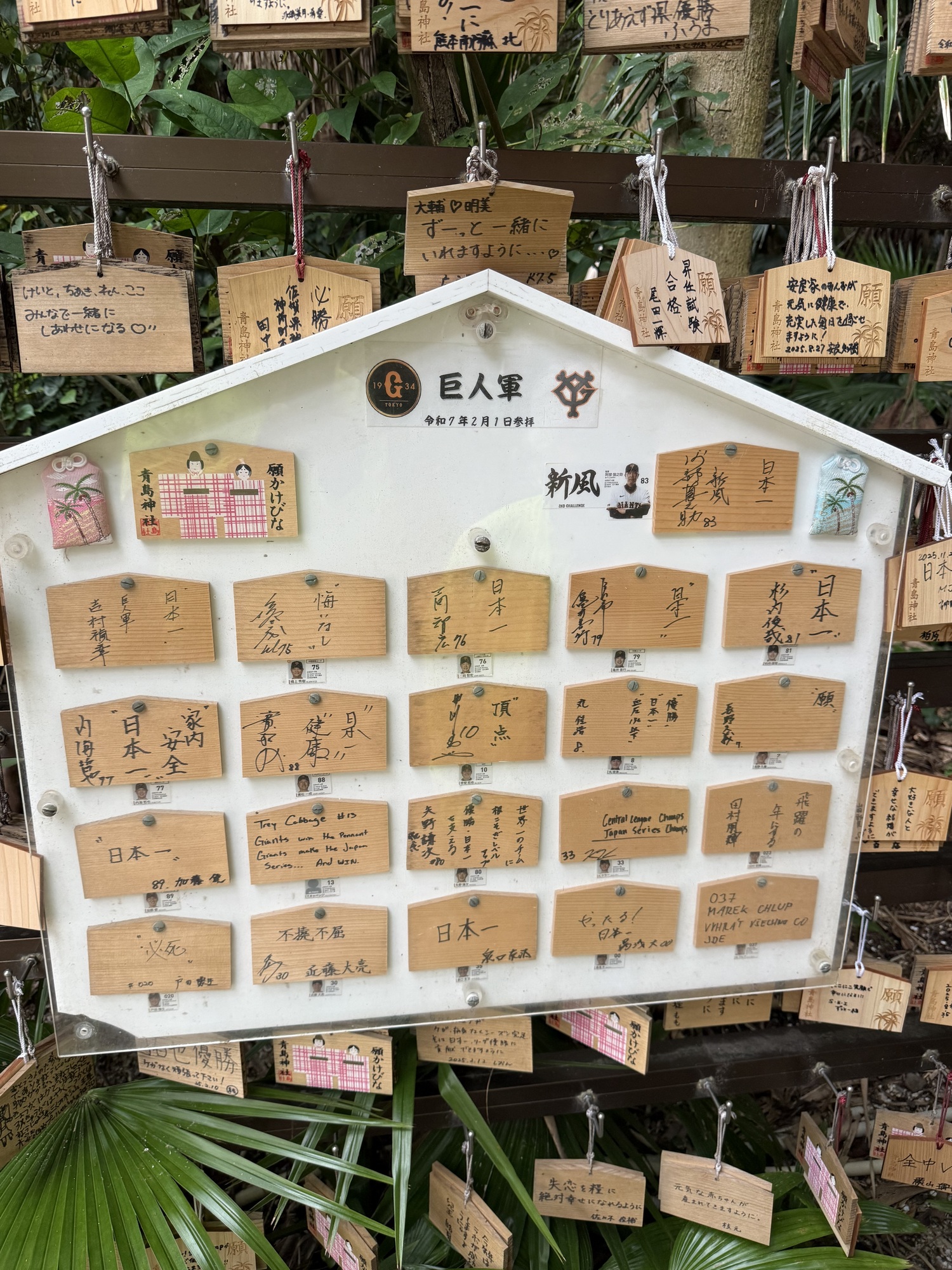 Trey Cabbage is an American professional baseball player who now plays for the Tokyo Giants. He has played for the Houston Astros and other MLB teams. The whole Giants team came to the shrine and made wishes on the ema boards