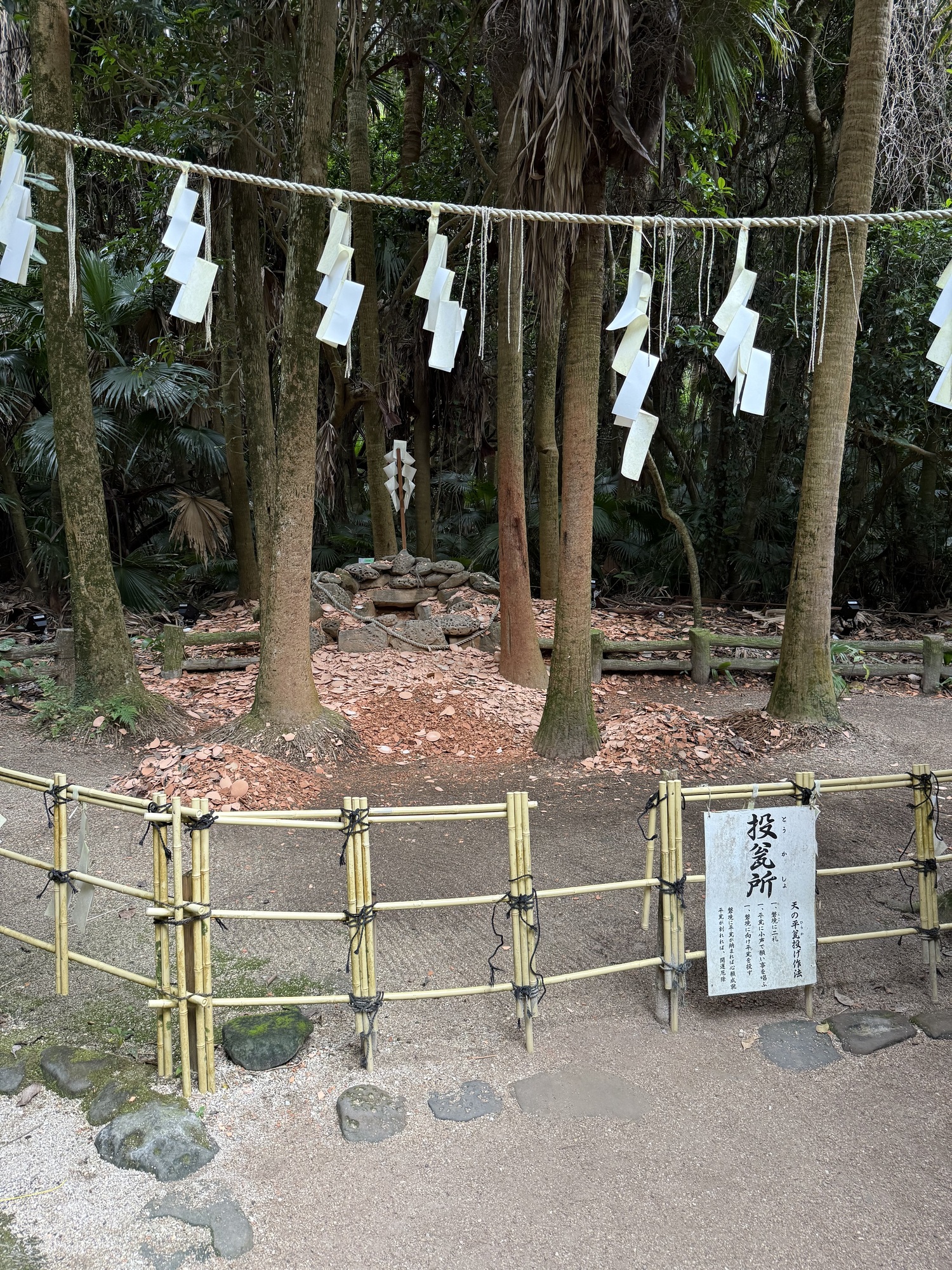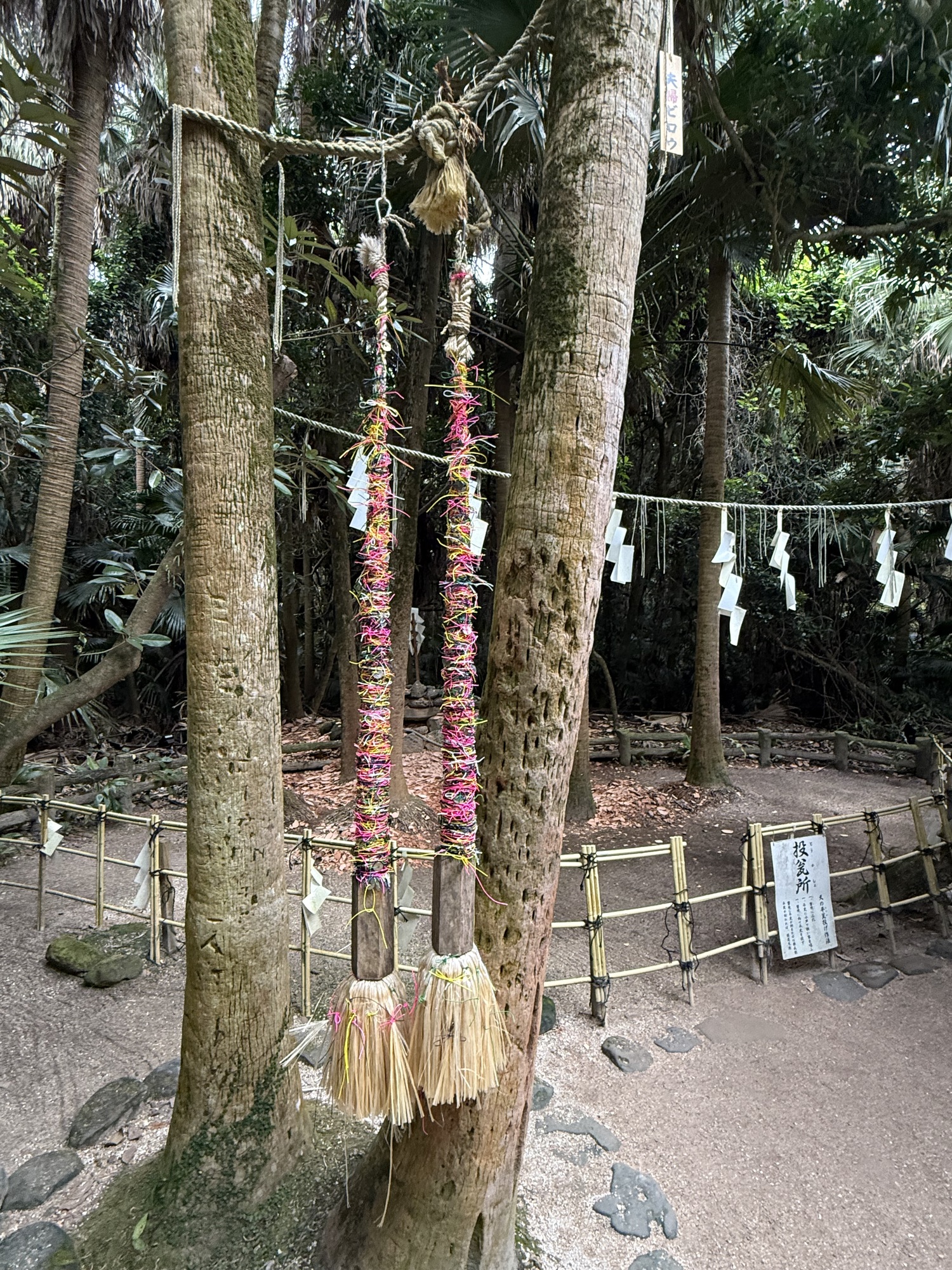 The Musubi-Koyori ritual can be experienced in the rear Shrine. Choose one of the five coloured strips and tie it on to the palm fan tree. The five colours are pink..matchmaking, purple..safety, green..success in academics, yellow for business prosperity and for answering of prayers. Pink seems to be the favourite colour