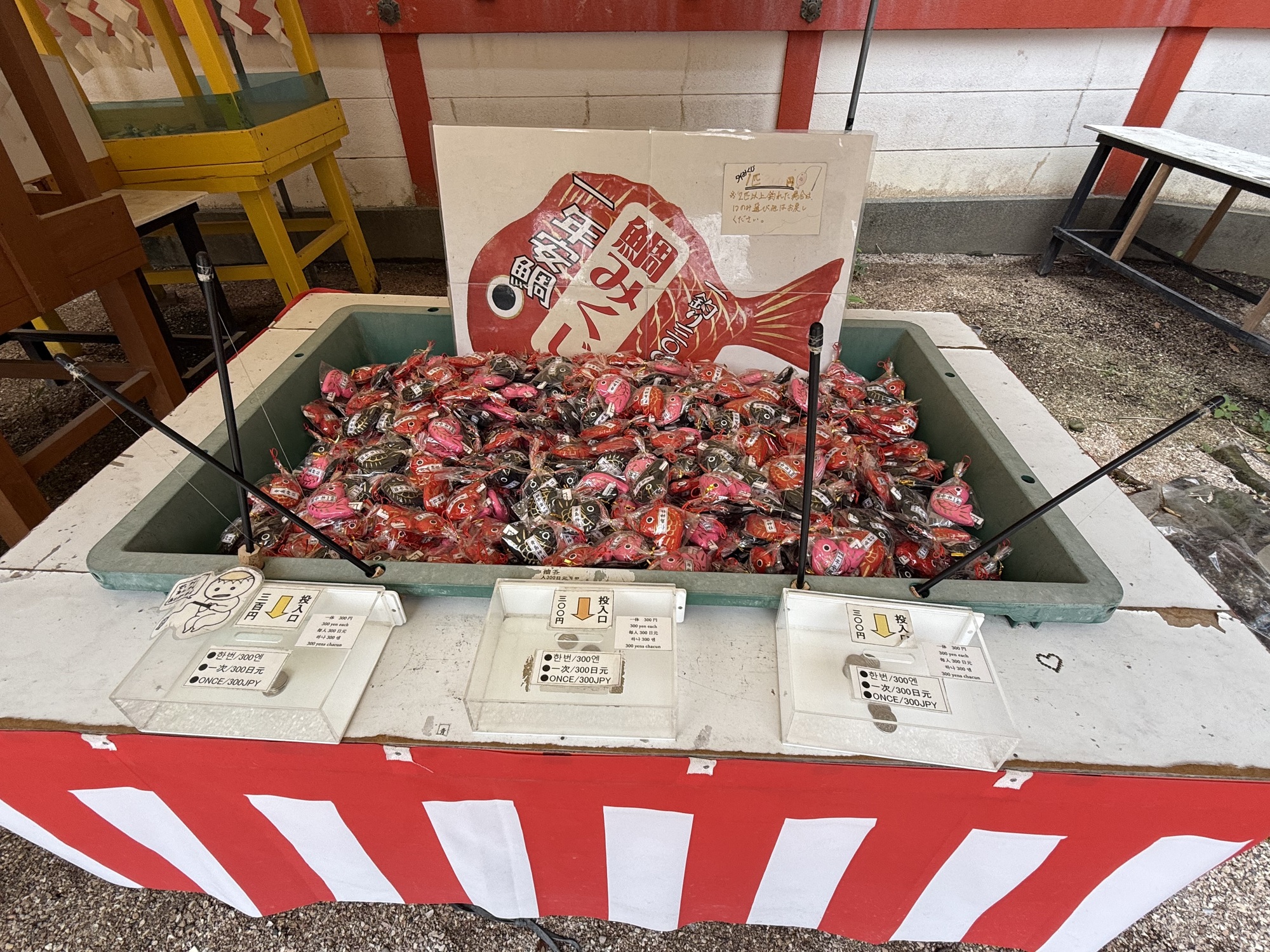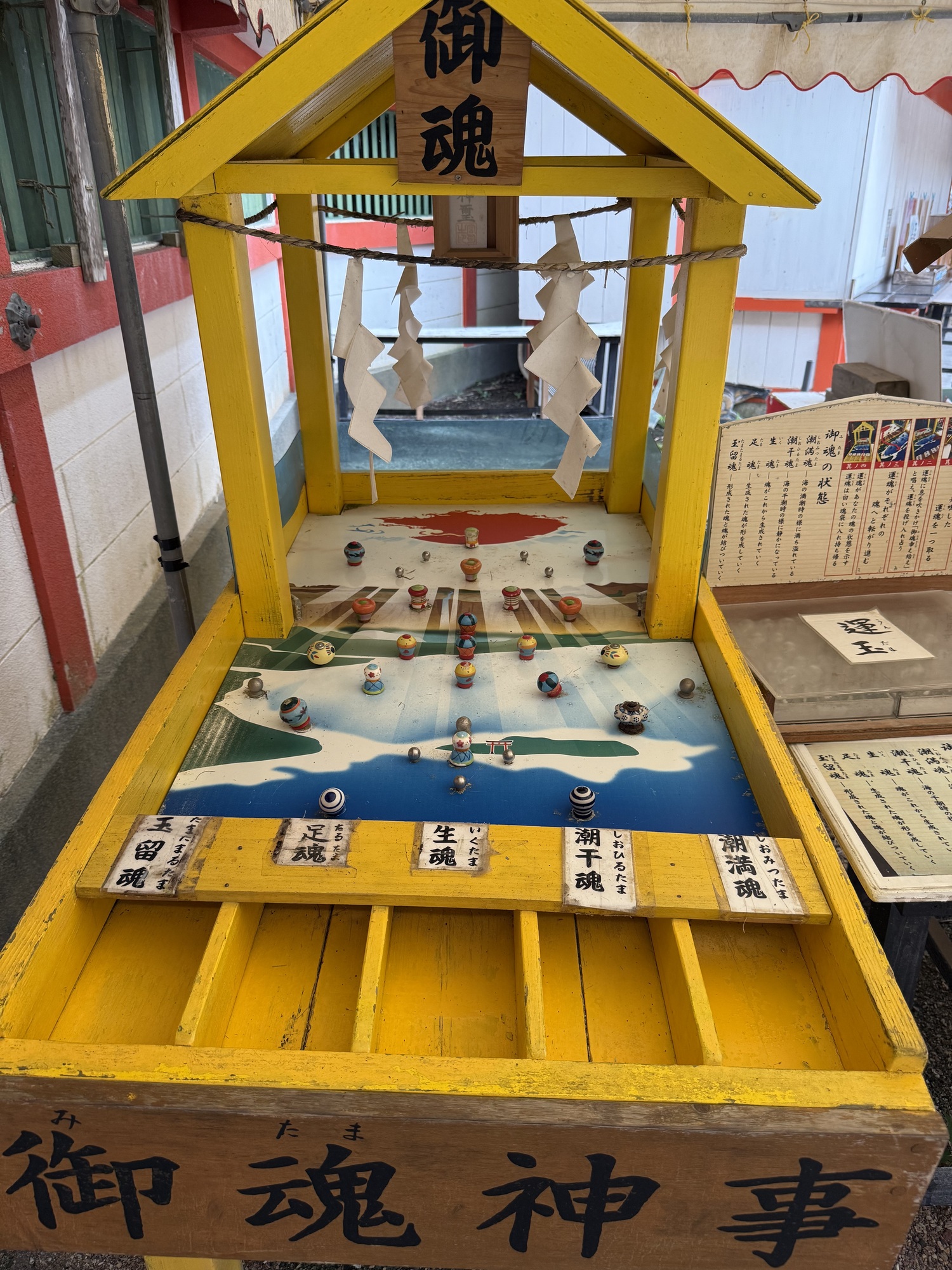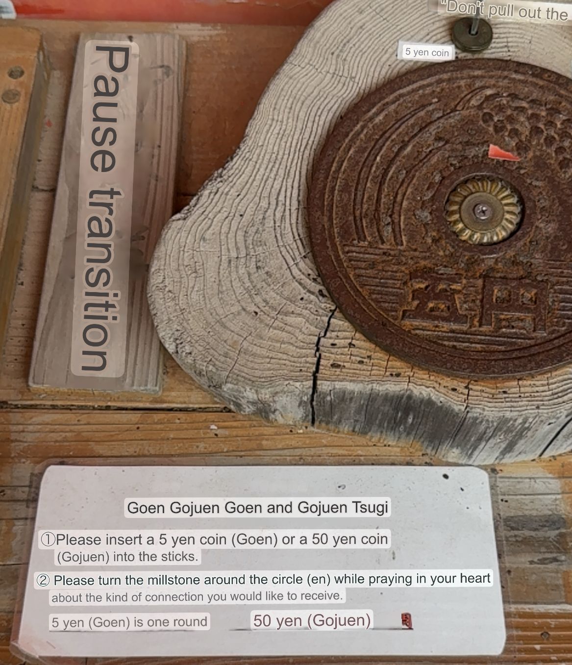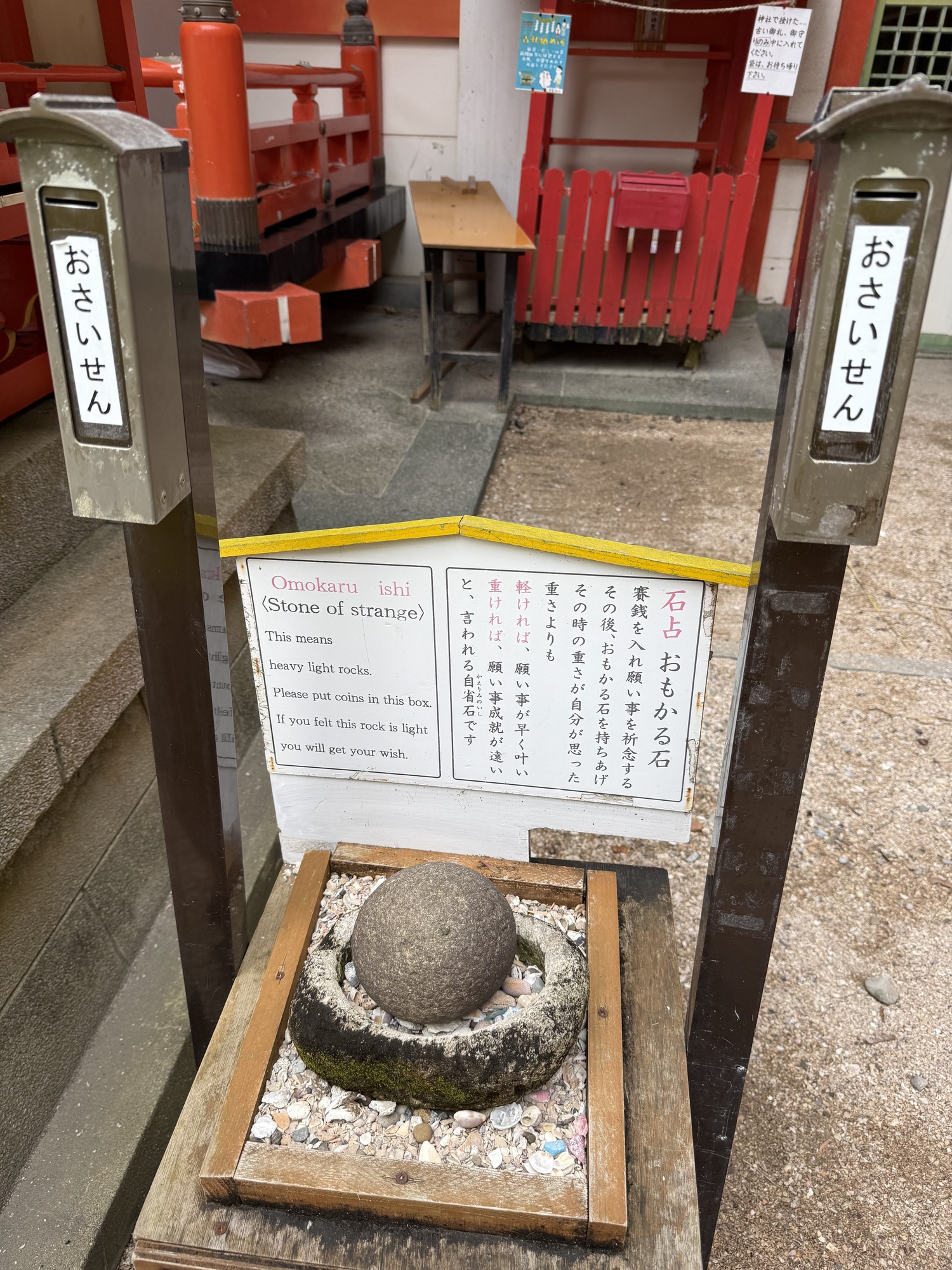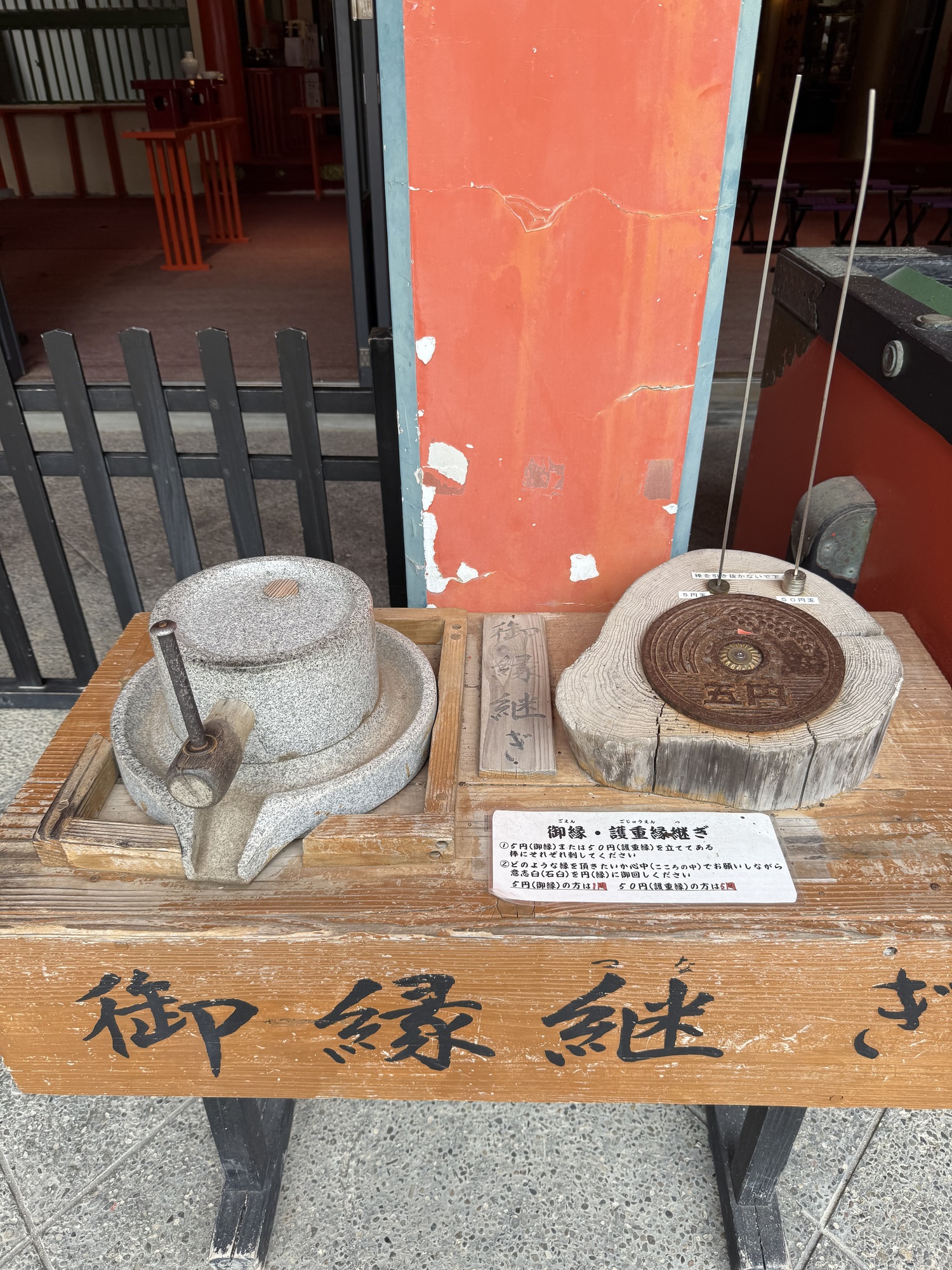 There are 10 wish making rituals that you can try at the Shrine. Here you place one of the two Japanese coins that have a hole in the middle (5¥ or 50¥) on the skewer and then you turn the handle while making wishes