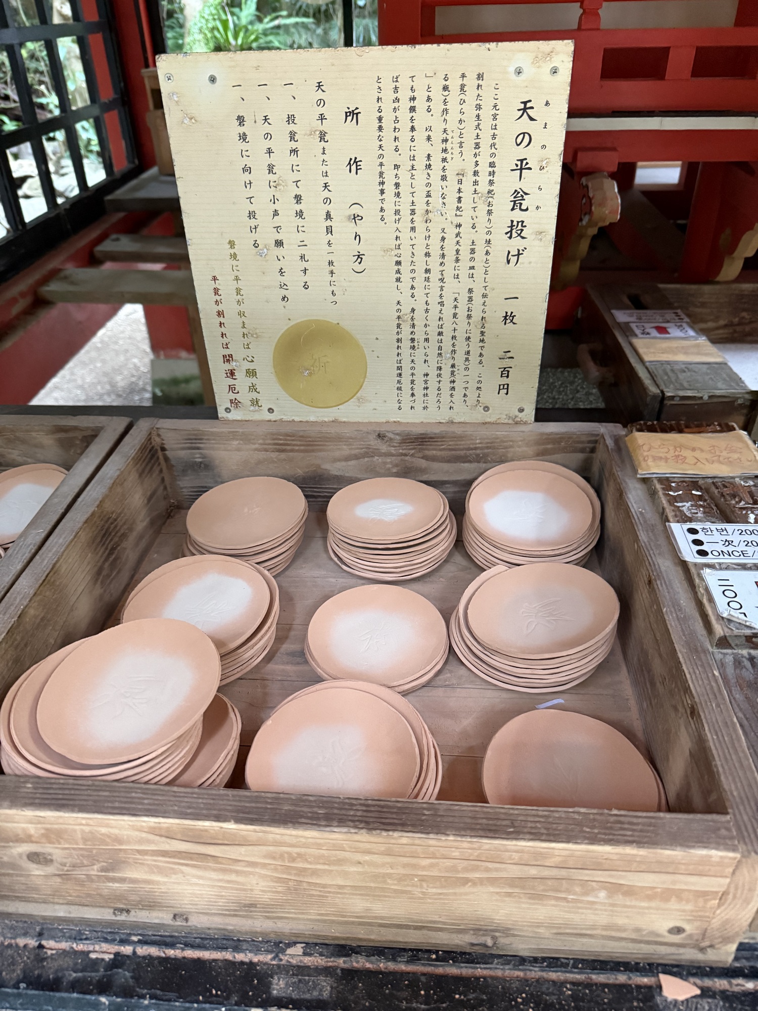 This is called Mae-no-Hiraka. You choose an unglazed plate, and you throw it into the designated area while quietly expressing your wish. If the plate successfully reaches the area, your wish is said to come true. Even if it shatters, it is said to bring good luck and brush away bad luck.