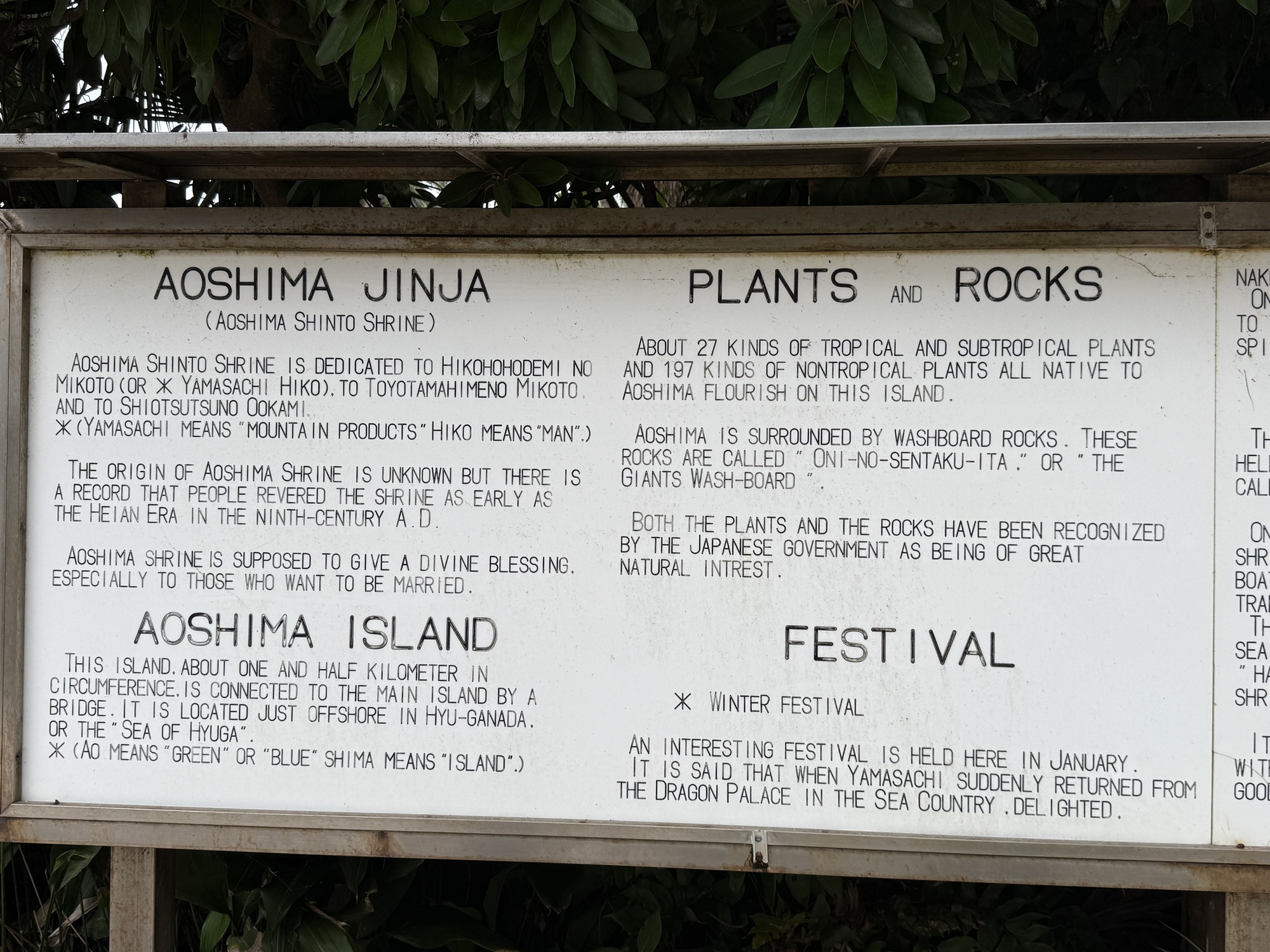 On Aoshima Island there are 27 varieties of tropical and sub tropical plants, as well as 197 kinds of non tropical plants, all of which flourish here. There are over 5000 fan palm trees on the tiny island. The government of Japan recognizes the plants and rocks to be of Special Cultural Importance