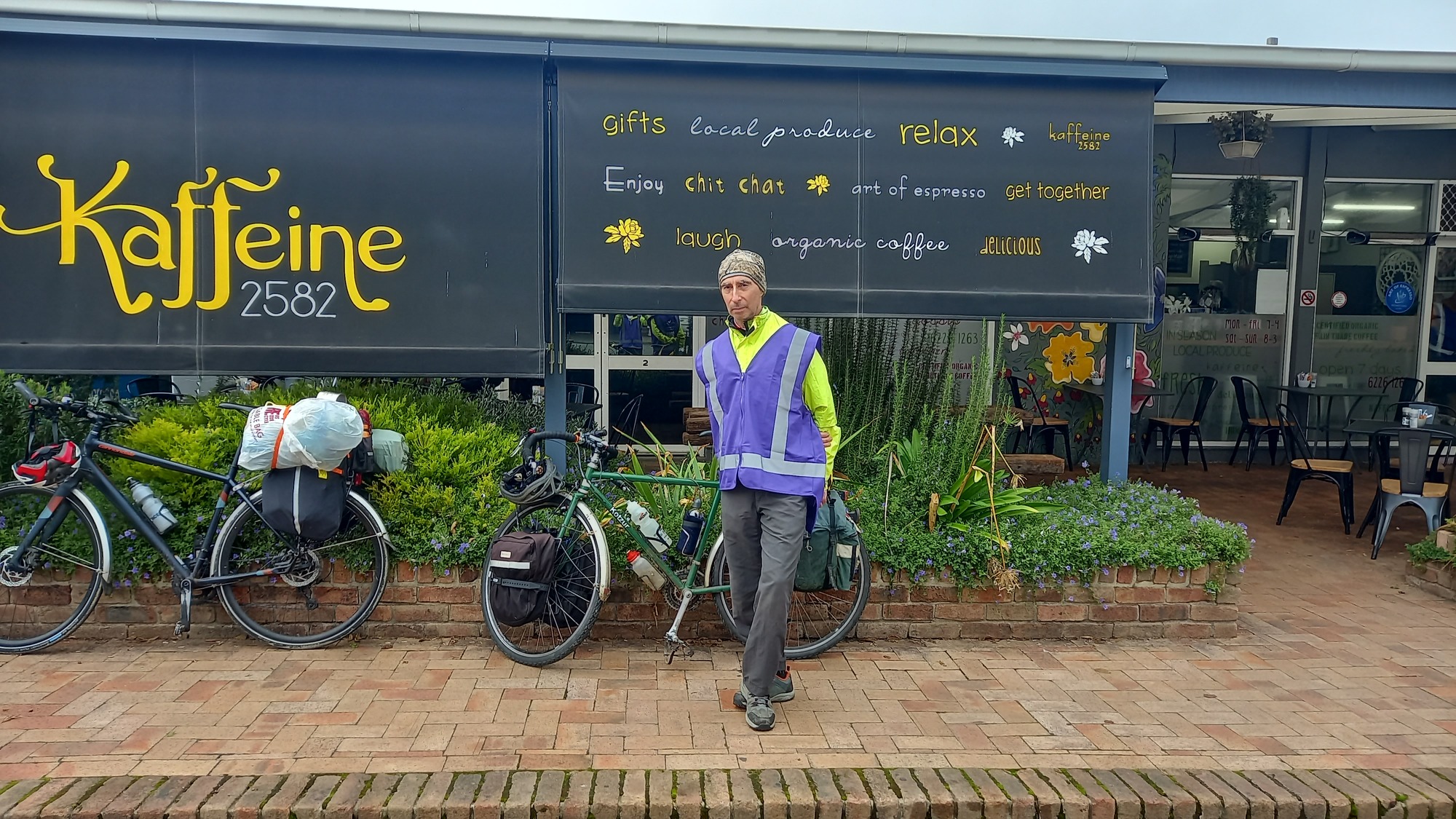 We went to Kaffeine, the cafe where a couple of years ago I met Doug another touring cyclist. We sat there for 3 hours and the triumph was that I did my first day of the blog on my phone, something I have never done before. I also gave out some cards about my ride. I took a photo of James, who was returning to Canberra partly to be there for our friend Rosemary. Will be thinking of you, Rose.