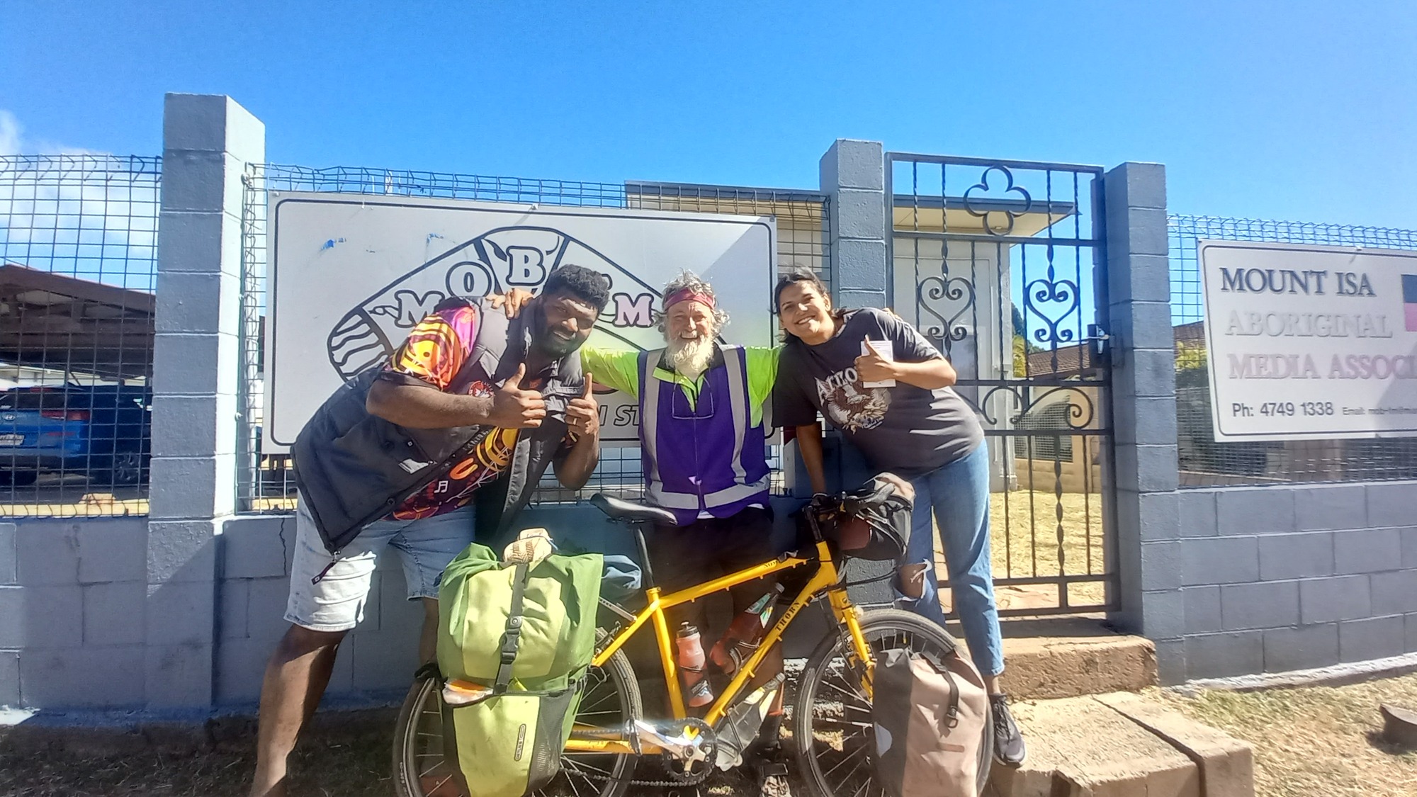 I have just had a marvellous day. Not only did I conquer all of my errands, including retrieving my phone number, but I had the great fortune of doing an interview with MOBFM. Who cares that they broadcast only to Mt Isa? I phoned them, whipped around, met the three J's - Jacob, a Torres Strait man, Jenny, a local Kalkadoon and Jannali, who describes herself as aboriginal and Maori. I did an interview with Jacob and then the three of us chatted before the mandatory photo outside.
