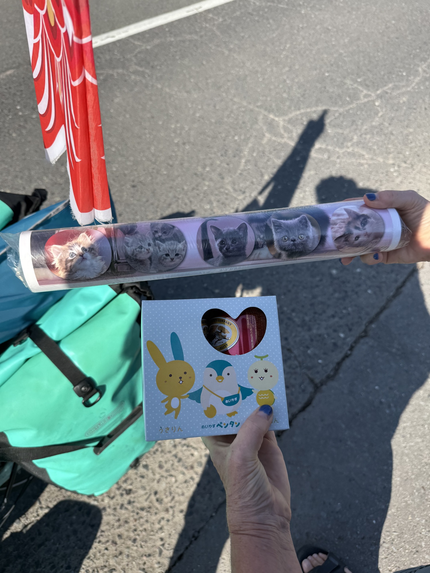 After leaving the Konbini, a woman pulled over and rushed over to chat with us. She had noticed us riding earlier and had gotten gifts for us as a welcome and to thank us for visiting her country. Wow.