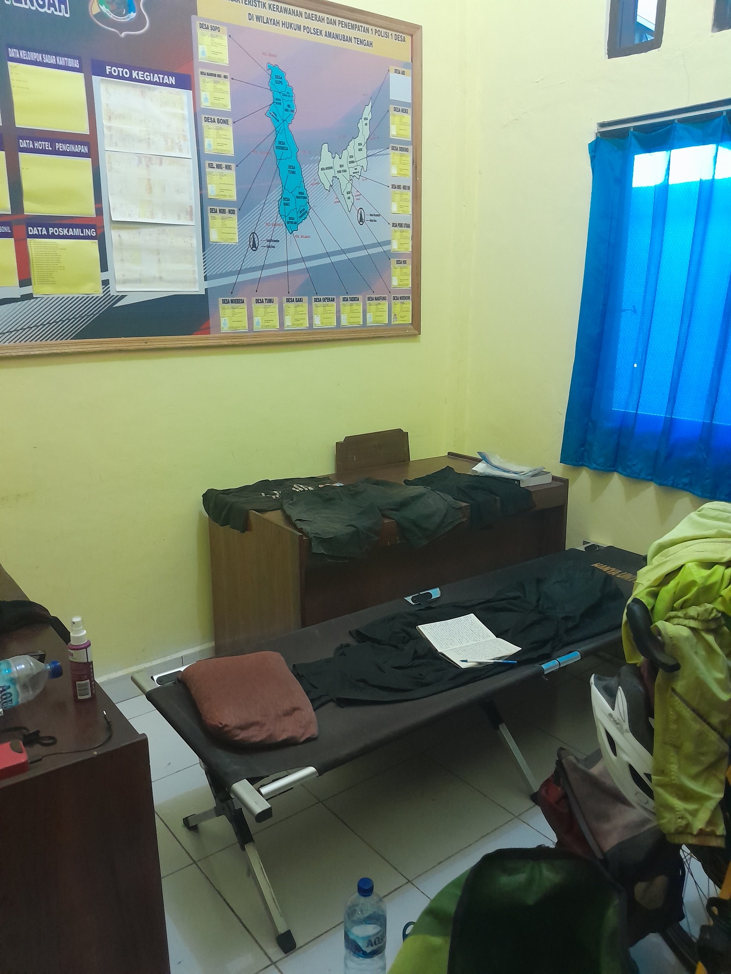But Oelamasi wasn't enough. Enquiries indicated that there's no accommodation so I pushed on to a police station 22 km further- to Oesao. I found a massive establishment- headquarters of the traffic police where, again, I got a room without a light. But they did give me dinner. That's a hat-trick of accommodation behind the thin blue line!