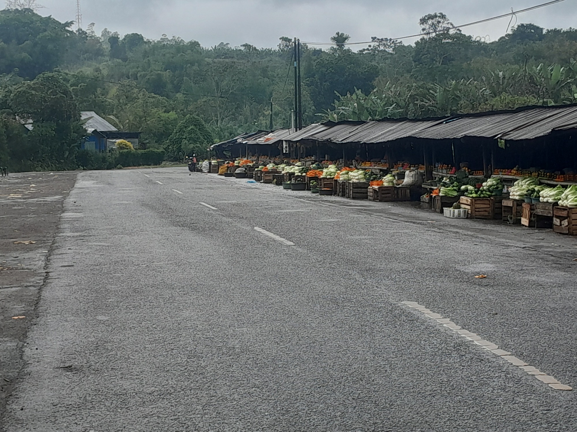 I got to Moni, got a bite to eat and pondered my next move. A sudden cloudburst made the decision easy. It could be a long wait for a clear day so I headed for Ende - 55 km away. It took me 45 minutes to climb to the summit above Moni, where I found the typical summit markers - communication towers and roadside stalls.