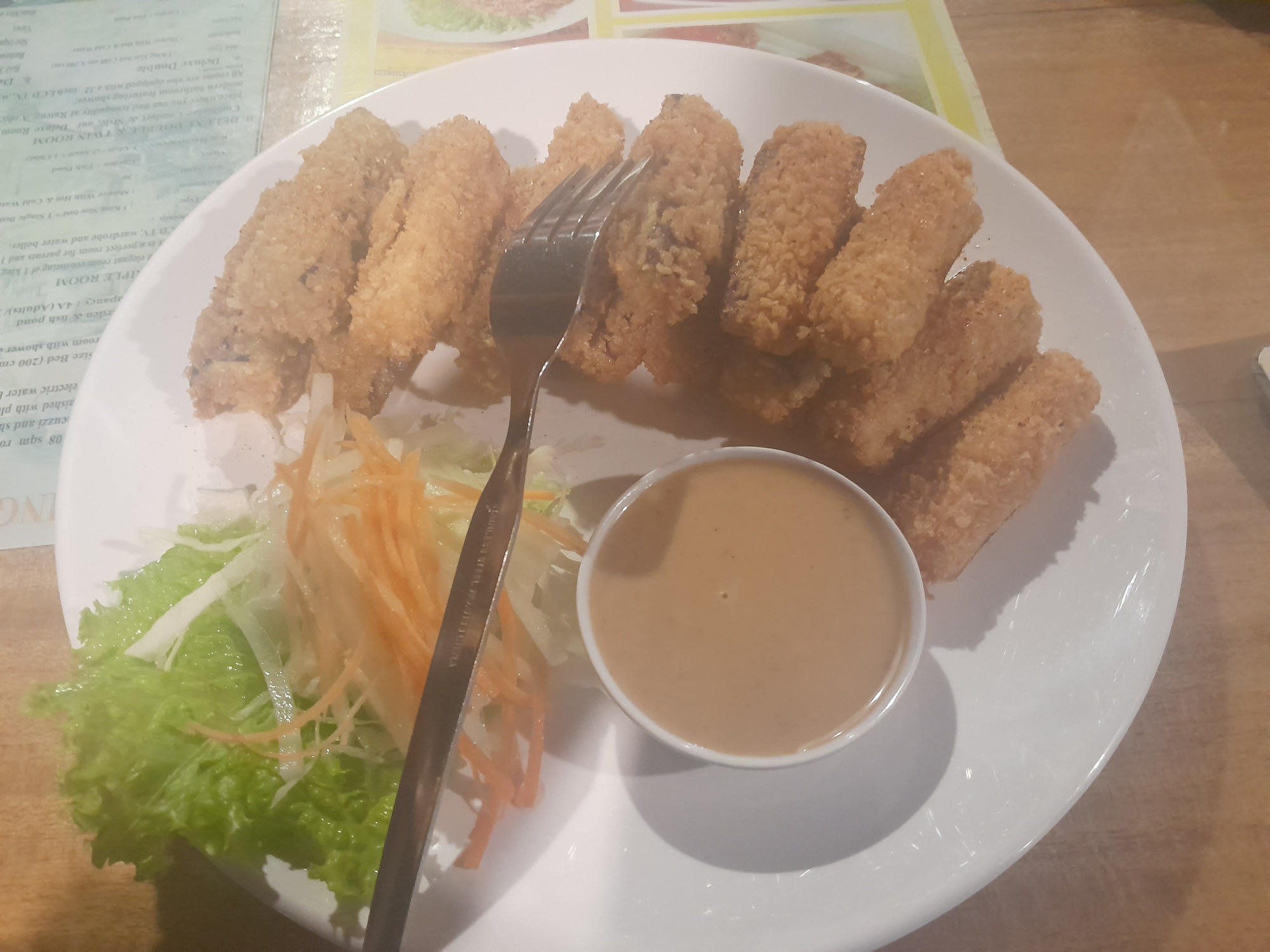 It took me a little time to find D Rima Homestay, a fine place with hot water and WiFi and one guest - me. Five minutes walk away is a good restaurant, where I decided to have a large plate of deep fried eggplant with sesame sauce for dessert.