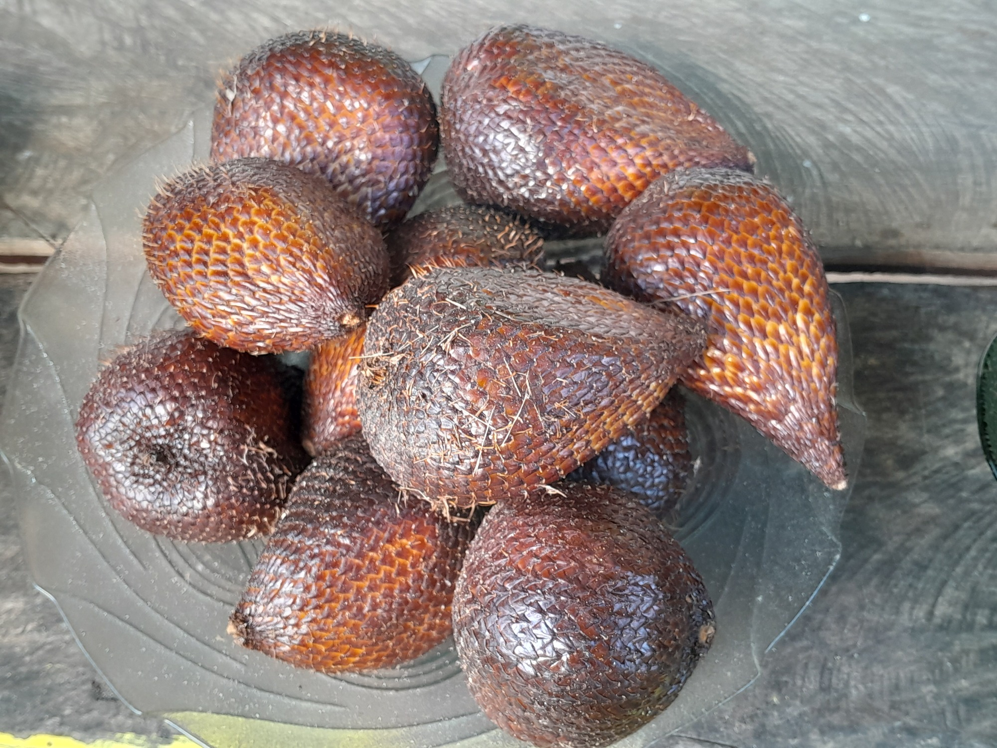 After three hours and 50 km of relentless undulations I had a break and gorged on biscuits, bananas and the fruit of the day, snake fruit or salak.