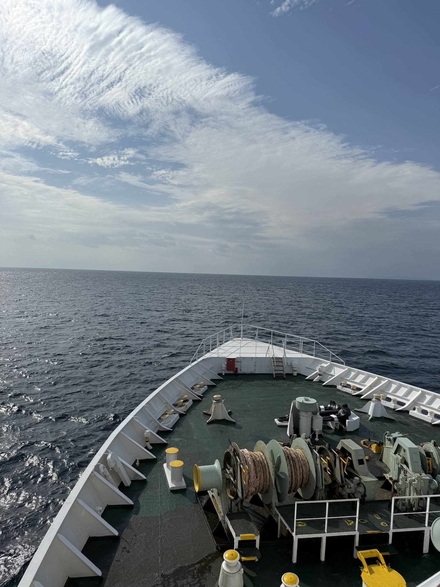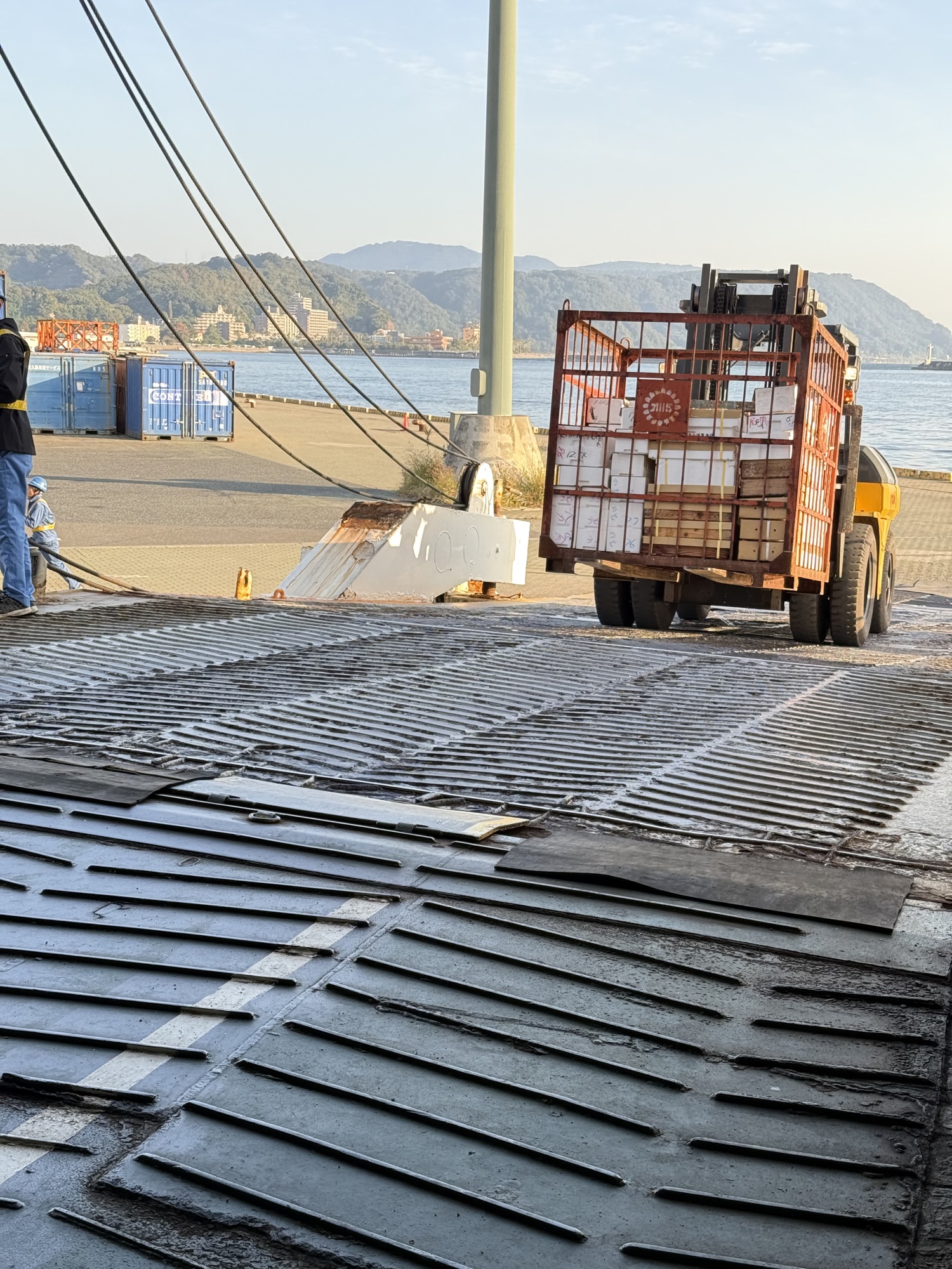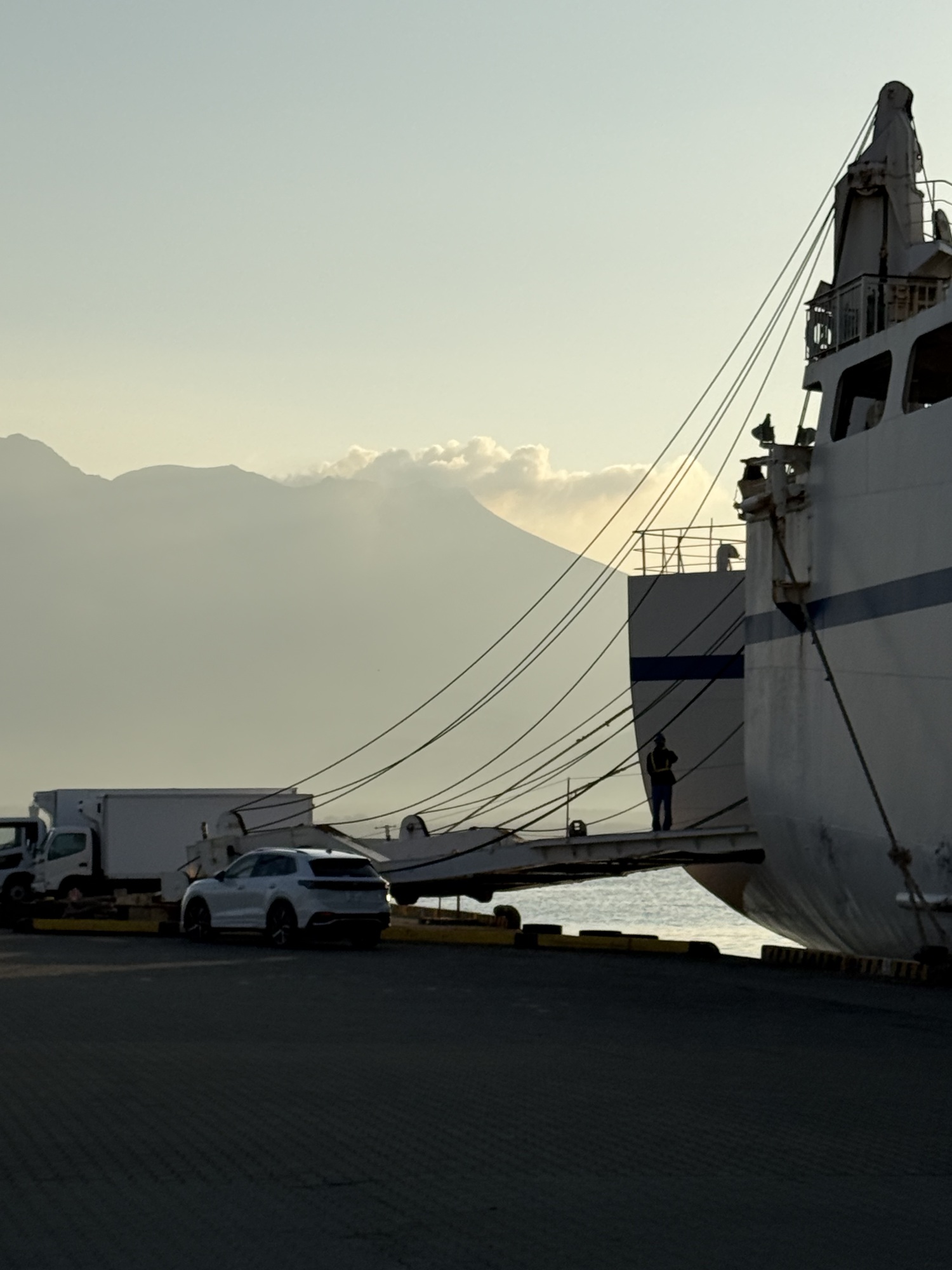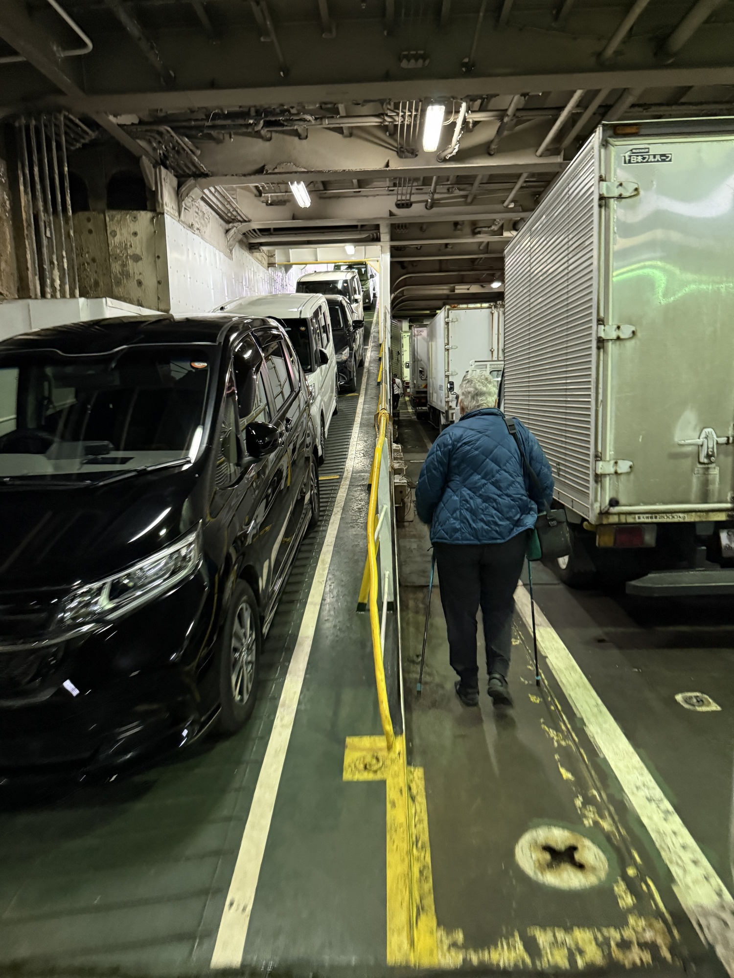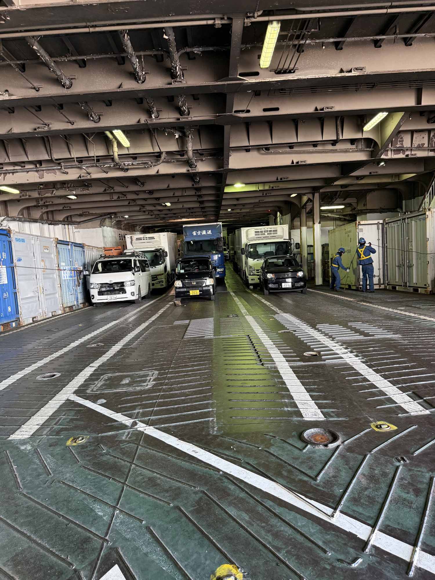Good job guys. The vehicle traffic is neatly lined up, having backed up for loading, and are ready for an easy disembarkation at Yakushima. It is amazing how quickly the crew load the ferry considering the time it takes to load one vehicle at a time. The crew are always running, never walking. Impressive.